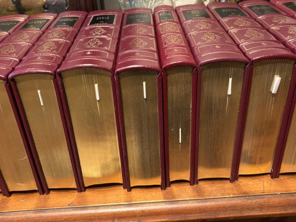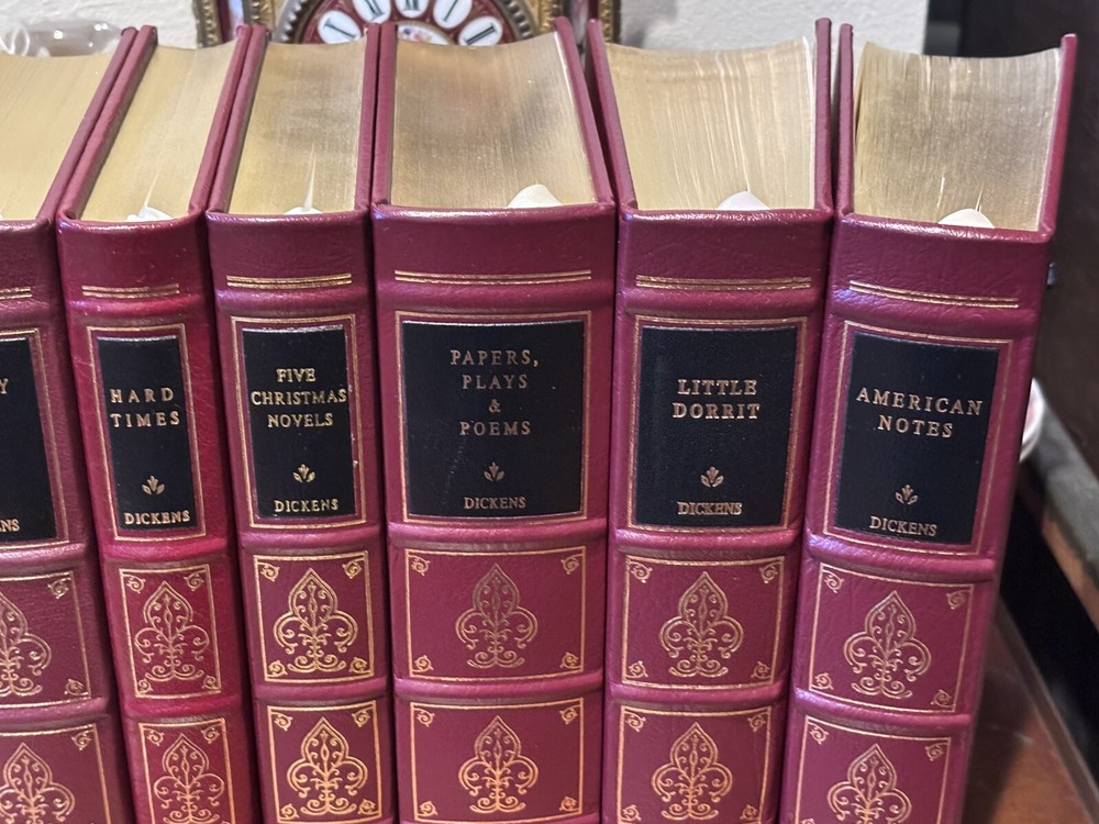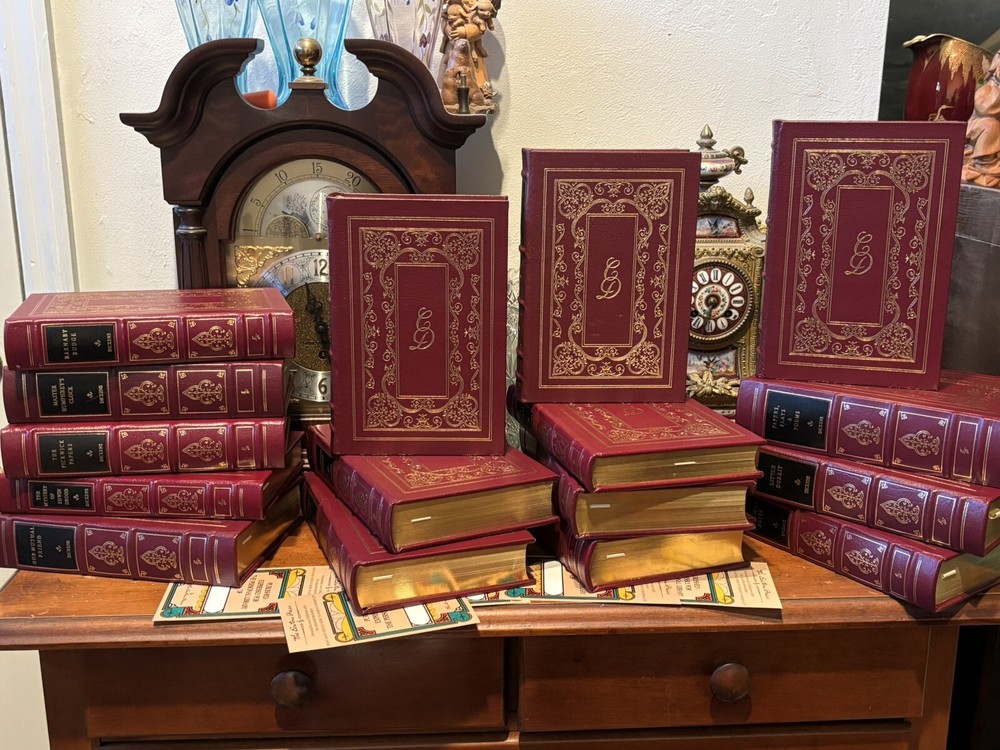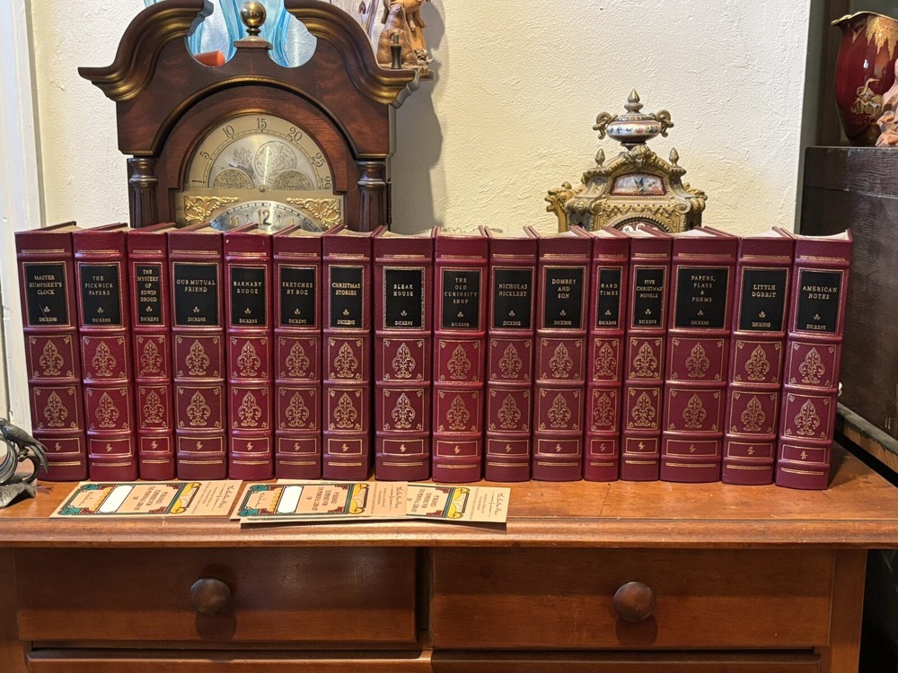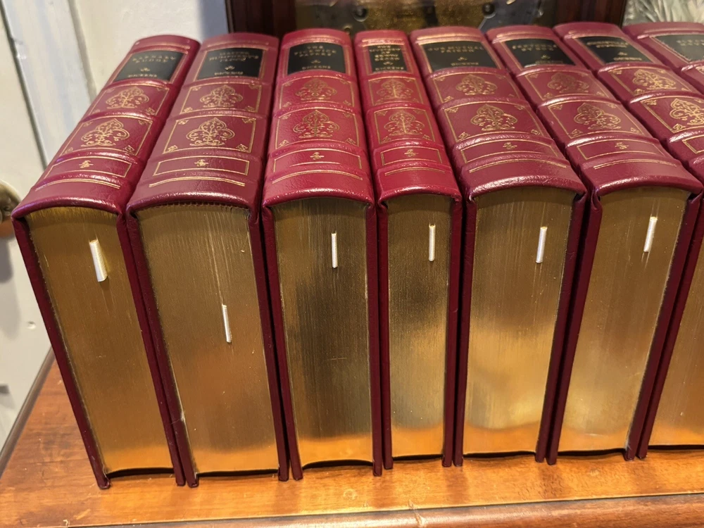 16 VOL. EASTON PRESS LEATHER & GOLD GILT CHARLES DICKENS COLLECTION BLACK LABEL Easton Press 16 volumes Charles Dickens. -Read with care. Some mild handling and shelf wear, leather scuffs and scratches to gilding (see photos). Two with name plates stuck, (not named) with six loose. Five volumes, The Mystery of Edwin Drood, The Pickwick Papers, Barnaby Rudge, Hard Times and The Old Curiosity Shop have slightly brighter red leather covers than the others, otherwise good and well cared for.