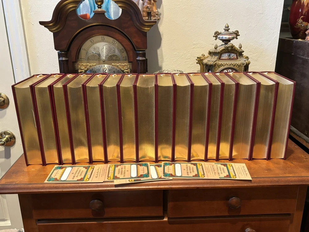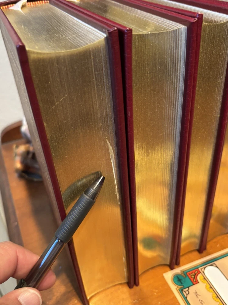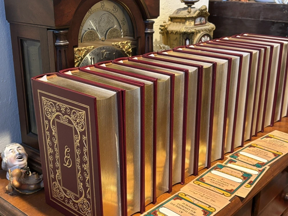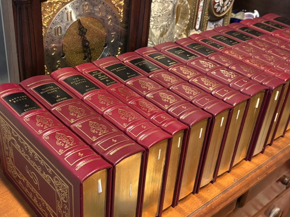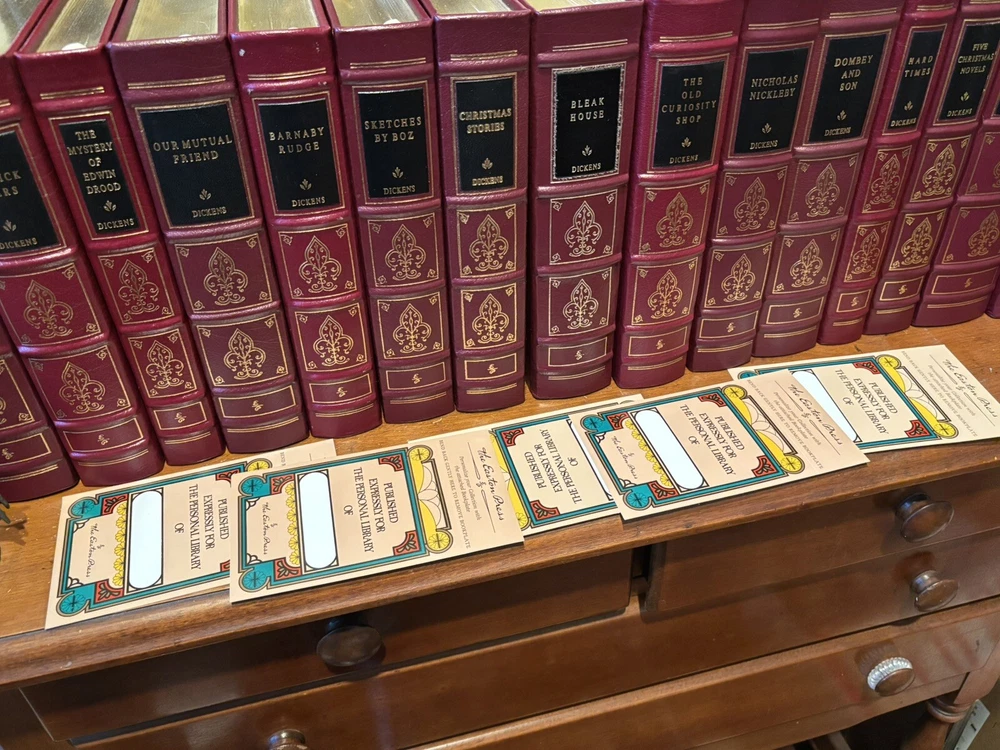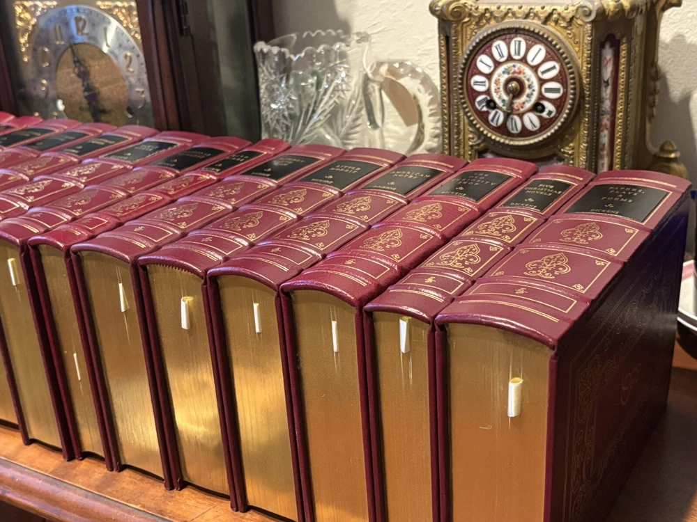 16 VOL. EASTON PRESS LEATHER & GOLD GILT CHARLES DICKENS COLLECTION BLACK LABEL Easton Press 16 volumes Charles Dickens. -Read with care. Some mild handling and shelf wear, leather scuffs and scratches to gilding (see photos). Two with name plates stuck, (not named) with six loose. Five volumes, The Mystery of Edwin Drood, The Pickwick Papers, Barnaby Rudge, Hard Times and The Old Curiosity Shop have slightly brighter red leather covers than the others, otherwise good and well cared for.