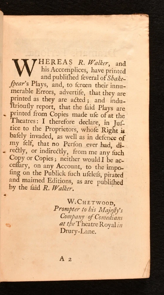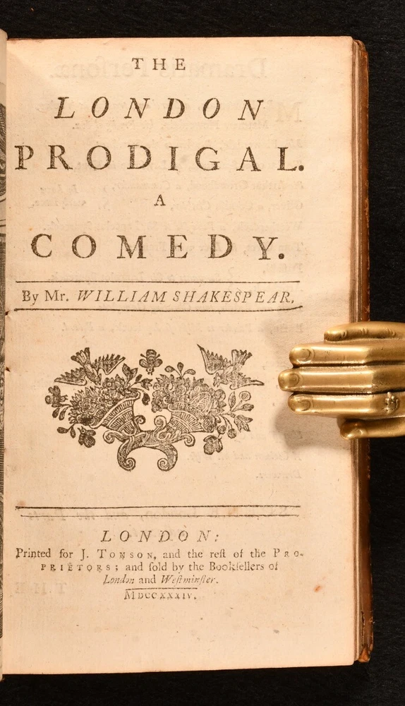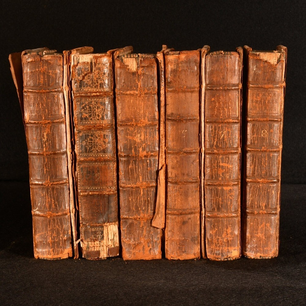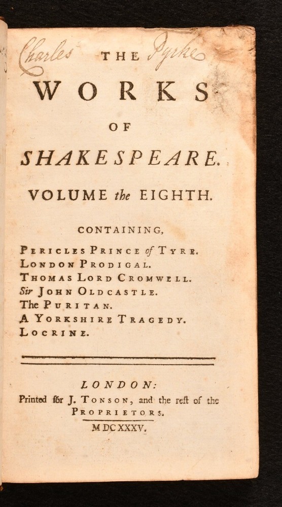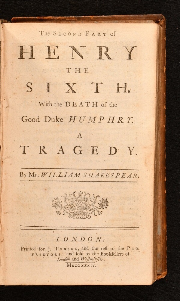 Click here to see our other books! The Works of Shakespeare William Shakespeare 1735 J. Tonson : London 6.5" by 4" [20], 60, 71, 70, [2], 83, [1], 60, 72; [2], 93, [3], 96, 82, [2], 84, 96; [2], 96, 95, [1], 86, 69, [1]; [2], 84, 72, 72, 68, [4], 107 [1]; [2], 91, [5], 96, 95, [1], 96; [2], 67, [1], 130, [2], 49, [1], 72, 60, 22, [2], 59, [1pp.] SUMMARY An exceedingly scarce early Tonson edition of the works of William Shakespeare, with six volumes out of eight. An Important Work,Early Edition,Leather Binding,Very Scarce Overall Condition: Good Only This book weighs 3 KG when packed UK Postage: £ 3.99 US Postage: £ 36.99 EU Postage : £ 25.99 European Postage: £ 27.99 Asia Postage: £ 47.99 Worldwide Postage: £ 69.99 DESCRIPTION An extremely scarce, early Tonson edition of the works of William Shakespeare, comprised of six volumes out of eight. Lacking Volume the Second and Volume the Third. Each play carries its own pagination, with a title page and frontispiece, the title pages for the plays are dated from 1734 to 1736. Also present is an additional title page to each volume, with the incorrect date of 1635 printed, instead of 1735, as called for. Dated using Jisc, from copies held at the University of Oxford Libraries. Comprised of the following: Volume the First, containing 'The Tempest', 'The Two Gentlemen of Verona', 'The Merry Wives of Windsor', 'Measure for Measure', 'The Comedy of Errors' and 'Much Ado About Nothing'. With 'Some Account of the Life of William Shakespeare' to the front of the work, unpaginated. Volume the Fourth, containing 'King Henry IV Part the Second', 'King Henry V', 'King Henry VI Part the First', 'King Henry VI Part the Second' and 'King Henry VI Part the Third'. Volume the Fifth, containing 'King Richard III', 'King Henry VIII', 'Troilus and Cressida', 'Coriolanus' and 'Titus Andronicus'. Volume the Sixth, containing 'Romeo and Juliet', 'Timon of Athens', 'Julius Caesar', 'Macbeth' and 'Hamlet Prince of Denmark'. Volume the Seventh, containing 'King Lear', 'Othello', 'Antony and Cleopatra' and 'Cymbeline'. Volume the Eighth, containing 'Pericles Prince of Tyre', 'London Prodigal', 'Thomas Lord Cromwell', 'Sir John Oldcastle', 'The Puritan', 'A Yorkshire Tragedy' and 'Locrine'. With ink inscriptions from previous owners to the title pages and endpapers. Bound in full calf. CONDITION In a full calf binding. Externally, worn, with rubbing and bumping to the leather. Front board has detached to the first, fourth, sixth and eighth, with the rear board detached to the seventh volume. Other hinges are strained, with the boards holding on by one cord to the first, fourth and seventh volumes. Loss to leather, particularly to the backstrip of the fourth, sixth and eighth volumes. Loss to the front board of volume four. Ink inscriptions to title pages and endpapers, with the occasional ink annotation. Internally, binding is tender in places, with binding split to the sixth volume. Pages are a little age toned, with slight offsetting from text. The occasional tear or chip to pages. Overall Condition: Good Only GLOSSARY OF TERMS Overall Condition (Dustwrapper condition rating is shown after that for the book itself, where a dustwrapper is present) Fine - Very well preserved copy showing very little wear Very Good Indeed - Only one or two minor faults, really a very attractive copy Very Good - Quite a wide term meaning no major faults but probably several smaller ones often expected given the age of the book, but still a respectable copy Good - Meaning not very good. Some more serious faults as will be described in the condition report under 'condition' Good Only - Meaning one or more faults that could really do with repair Fair - As with good only above but with other faults leaving a compromised copy even after repair Poor - Really bad and possibly seriously incomplete. We only sell books in this condition where their rarity or value makes them attractive none the less. Major defects will be described. GUARANTEE We offer a full money back guarantee on our descriptions. Please ask for details and conditions. We prefer PAYPAL. If you pay via PAYPAL we will post the item off the same or the next working day with the postage you have selected. Please note we cannot accept USD cheques