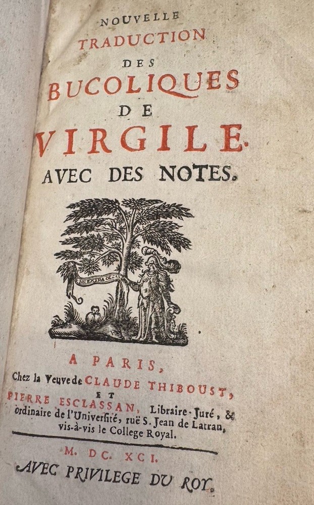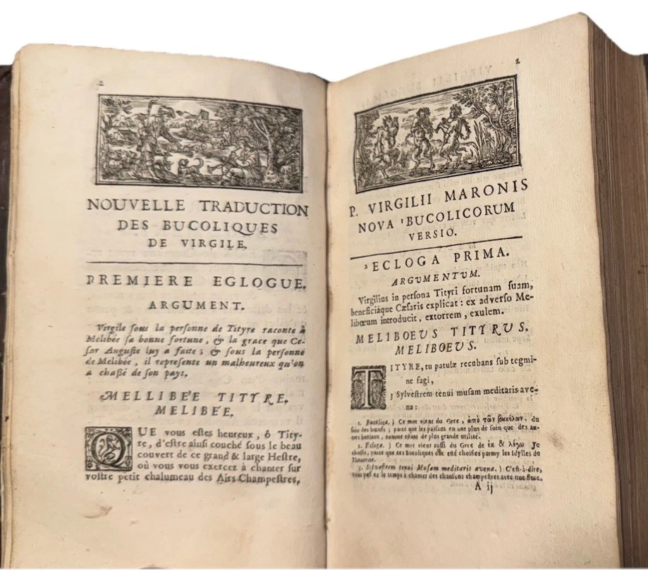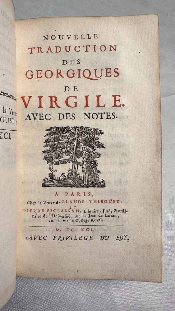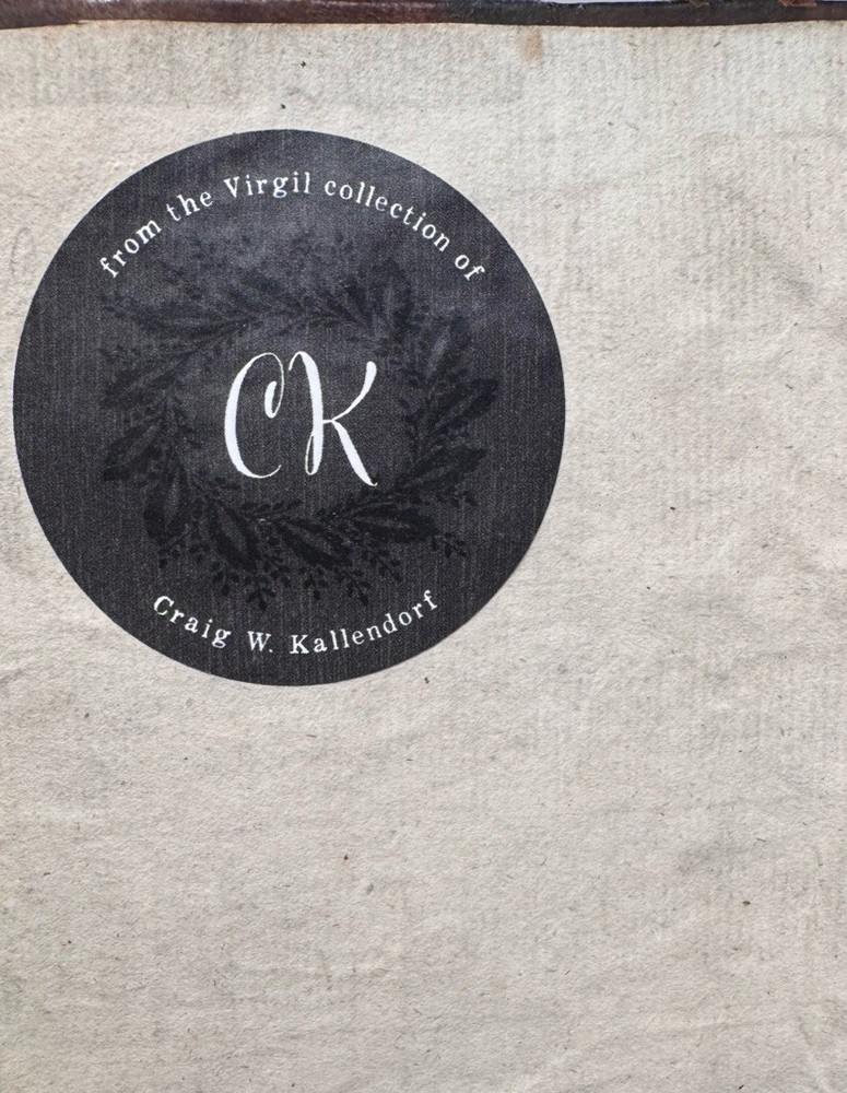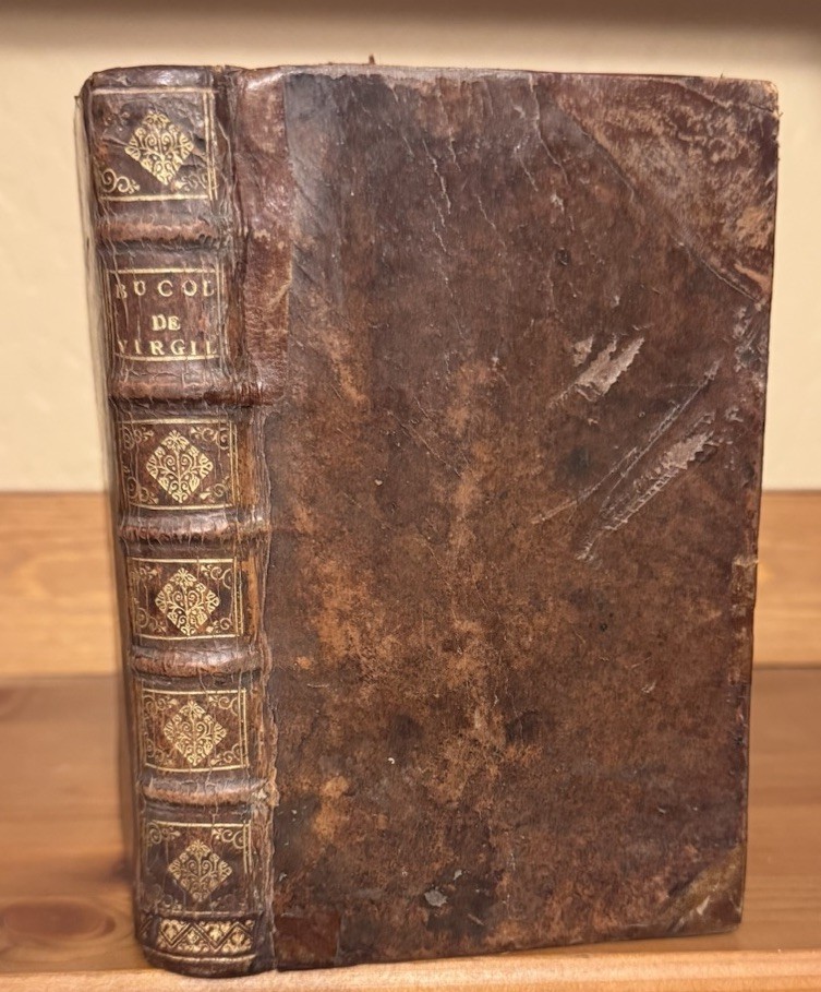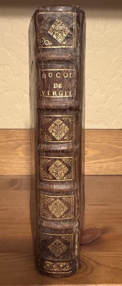 Two Virgil Works (Bucolics & Georgics) Bound as One: 1. Nouvelle traduction des Bucoliques de Virgile : avec des notes; and 2. Nouvelle traduction des Georgiques [Georgicon] de Virgile avec des All institutional holdings I identified have the two books bound separately. Complete. Overall Condition: antiquarian VG PROVENANCE: From the Virgil Collection of Craig Kallendorf (1954 - 2023), who owned the largest private collection of Virgil works (1,1150 editions, not including Incunable books) in the world. Only a handful of prominent institutions like the British Library had larger collections. 89 of the books in his collection were the only known surviving copies, 71 only had one other known copy. He worked closely with Princeton University in helping to assemble, supplement and catalog its Junius Spencer Morgan Virgil collection. Craig Kallendorf was Professor of English and Classics at Texas A&M University. He was the author or editor of 27 books and more than 170 articles, book chapters, and reference work entries. Among Kallendorf’s groundbreaking monographs on the Virgilian tradition, special note might be made of his Virgil and the Myth of Venice: Books and Readers in the Italian Renaissance (Oxford: Clarendon Press, 1999), which shows how the wide reading of the Aeneid, accessed in both Latin and Italian editions, contributed to Venetian ideology and the so-called “myth of Venice.” With its publication, according to reviewer Diana Robin (Renaissance Quarterly, 55.4 [2002], p. 1394), Kallendorf is to be recognized as “the leading authority on the Virgilian tradition in early modern print culture in Italy.” ABOUT THE BOOK Both works were published in 1691 by Claude Thiboust & Pierre Eclassan in Paris. French and Latin on opposite pages; notes in French. First edition thus. Bound in contemporary full calf with antiquarian leather repair and restoration. Five raised spine bands separating compartments filled with ornate gilt decoration or lettering. All edges speckled in red. Octavo, 6.5” x 4”, 8], 58, [1] Colophon; [8], 299, [1] Colophon. Each work with its own title page printed in red and black with a woodcut printer’s device. Woodcut chapter head-and tail pieces. Headpieces range from small woodcuts to scrolls to larger vignette scenes. Decorated initials. ABOUT THE PUBLISHERS Claude-Louis Thiboust (1667-1737) was a prominent French printer and bookseller, known for his work as a printer to the University of Paris and his role as a printer for the French Royal Academy. He was also a Master of Arts (May 1688) and was appointed master printer and bookseller on June 8, 1694. Thiboust was a posthumous son of the Parisian printer Claude Thiboust. He is also known for writing Latin verses and for his son, Claude-Charles Thiboust (1701-1757), who also became a printer. One of his notable works is "L'Excellence de l'Imprimerie", which is a collection of prints and woodcuts. CONDITION REPORT: VG In contemporary leather binding with antiquarian leather patches in several places on the boards and with corners restored. The older boards are darkened, cracking and have some pitting. Spine with some cracking. Darkened edges which has obscured most of the speckling. Refreshed endpapers. Blank flyleaf following text is original. Square binding, firm hinges and joints, tight pages. Lightly rubbed extremities. Water dampening to preliminaries of Bucolics and multiple other areas with light water dampening. Bucolics title page with dust soiling. A few leaves with marginal insect predation. Most of the text block itself is clean and bright. Signs of handling (mostly along the margins)- a few ink stains, smudging, some creasing/bent corners. One page with a pen-tip sized hole. An occasional spot or two of light foxing. Georgics colophon and rear blank flyleaf with extensive antiquarian ink writing dating back to 1701. FFEP with Kallendorf’s ex libris sticker. Please view pictures as they are an important part of the condition description and book information. ***Be sure to check out my dozens of other rare Virgil works being listed for sale from the amazing Craig Kallendorf Virgil Collection, including many from the 1500s. So be sure to give me a follow!*** As a fellow book collector, I know how frustrating it can be when items aren’t accurately described or poorly packaged for shipping. That is why I (1) take a lot of pictures and try to describe condition issues as accurately as possible and (2) pack your book purchases with the utmost care before shipping. I have been selling and buying on eBay for over 12 years and have a 100% satisfaction rating, and offer a 100% satisfaction guarantee 30-day return policy. Happy to combine shipping on multiple orders to save you money. Be sure to check out my store and to give me a follow. I have thousands of rare, signed, and collectible books to list in the coming weeks and months!