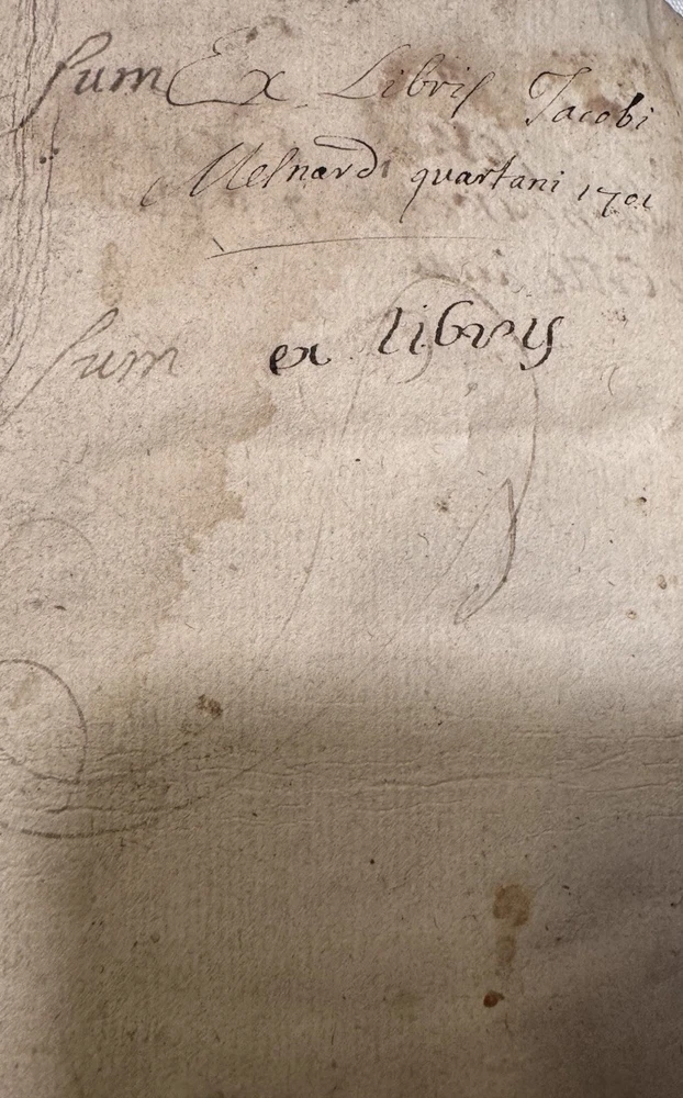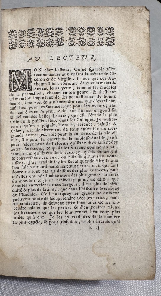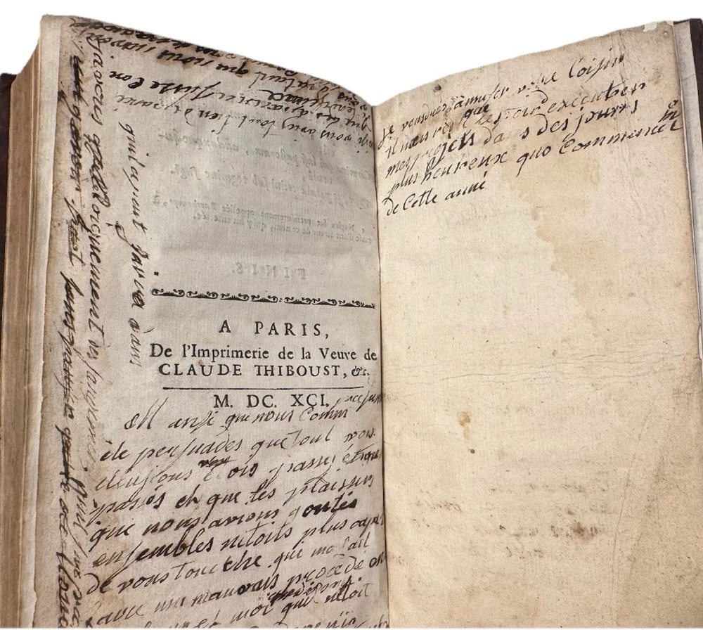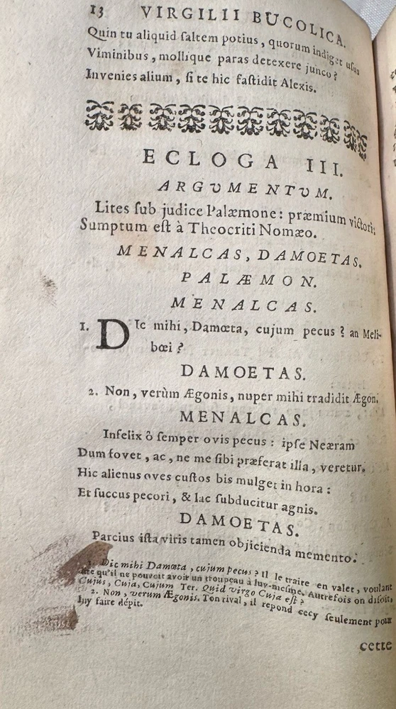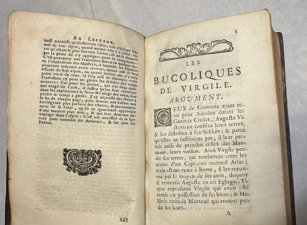 Two Virgil Works (Bucolics & Georgics) Bound as One: 1. Nouvelle traduction des Bucoliques de Virgile : avec des notes; and 2. Nouvelle traduction des Georgiques [Georgicon] de Virgile avec des All institutional holdings I identified have the two books bound separately. Complete. Overall Condition: antiquarian VG PROVENANCE: From the Virgil Collection of Craig Kallendorf (1954 - 2023), who owned the largest private collection of Virgil works (1,1150 editions, not including Incunable books) in the world. Only a handful of prominent institutions like the British Library had larger collections. 89 of the books in his collection were the only known surviving copies, 71 only had one other known copy. He worked closely with Princeton University in helping to assemble, supplement and catalog its Junius Spencer Morgan Virgil collection. Craig Kallendorf was Professor of English and Classics at Texas A&M University. He was the author or editor of 27 books and more than 170 articles, book chapters, and reference work entries. Among Kallendorf’s groundbreaking monographs on the Virgilian tradition, special note might be made of his Virgil and the Myth of Venice: Books and Readers in the Italian Renaissance (Oxford: Clarendon Press, 1999), which shows how the wide reading of the Aeneid, accessed in both Latin and Italian editions, contributed to Venetian ideology and the so-called “myth of Venice.” With its publication, according to reviewer Diana Robin (Renaissance Quarterly, 55.4 [2002], p. 1394), Kallendorf is to be recognized as “the leading authority on the Virgilian tradition in early modern print culture in Italy.” ABOUT THE BOOK Both works were published in 1691 by Claude Thiboust & Pierre Eclassan in Paris. French and Latin on opposite pages; notes in French. First edition thus. Bound in contemporary full calf with antiquarian leather repair and restoration. Five raised spine bands separating compartments filled with ornate gilt decoration or lettering. All edges speckled in red. Octavo, 6.5” x 4”, 8], 58, [1] Colophon; [8], 299, [1] Colophon. Each work with its own title page printed in red and black with a woodcut printer’s device. Woodcut chapter head-and tail pieces. Headpieces range from small woodcuts to scrolls to larger vignette scenes. Decorated initials. ABOUT THE PUBLISHERS Claude-Louis Thiboust (1667-1737) was a prominent French printer and bookseller, known for his work as a printer to the University of Paris and his role as a printer for the French Royal Academy. He was also a Master of Arts (May 1688) and was appointed master printer and bookseller on June 8, 1694. Thiboust was a posthumous son of the Parisian printer Claude Thiboust. He is also known for writing Latin verses and for his son, Claude-Charles Thiboust (1701-1757), who also became a printer. One of his notable works is "L'Excellence de l'Imprimerie", which is a collection of prints and woodcuts. CONDITION REPORT: VG In contemporary leather binding with antiquarian leather patches in several places on the boards and with corners restored. The older boards are darkened, cracking and have some pitting. Spine with some cracking. Darkened edges which has obscured most of the speckling. Refreshed endpapers. Blank flyleaf following text is original. Square binding, firm hinges and joints, tight pages. Lightly rubbed extremities. Water dampening to preliminaries of Bucolics and multiple other areas with light water dampening. Bucolics title page with dust soiling. A few leaves with marginal insect predation. Most of the text block itself is clean and bright. Signs of handling (mostly along the margins)- a few ink stains, smudging, some creasing/bent corners. One page with a pen-tip sized hole. An occasional spot or two of light foxing. Georgics colophon and rear blank flyleaf with extensive antiquarian ink writing dating back to 1701. FFEP with Kallendorf’s ex libris sticker. Please view pictures as they are an important part of the condition description and book information. ***Be sure to check out my dozens of other rare Virgil works being listed for sale from the amazing Craig Kallendorf Virgil Collection, including many from the 1500s. So be sure to give me a follow!*** As a fellow book collector, I know how frustrating it can be when items aren’t accurately described or poorly packaged for shipping. That is why I (1) take a lot of pictures and try to describe condition issues as accurately as possible and (2) pack your book purchases with the utmost care before shipping. I have been selling and buying on eBay for over 12 years and have a 100% satisfaction rating, and offer a 100% satisfaction guarantee 30-day return policy. Happy to combine shipping on multiple orders to save you money. Be sure to check out my store and to give me a follow. I have thousands of rare, signed, and collectible books to list in the coming weeks and months!