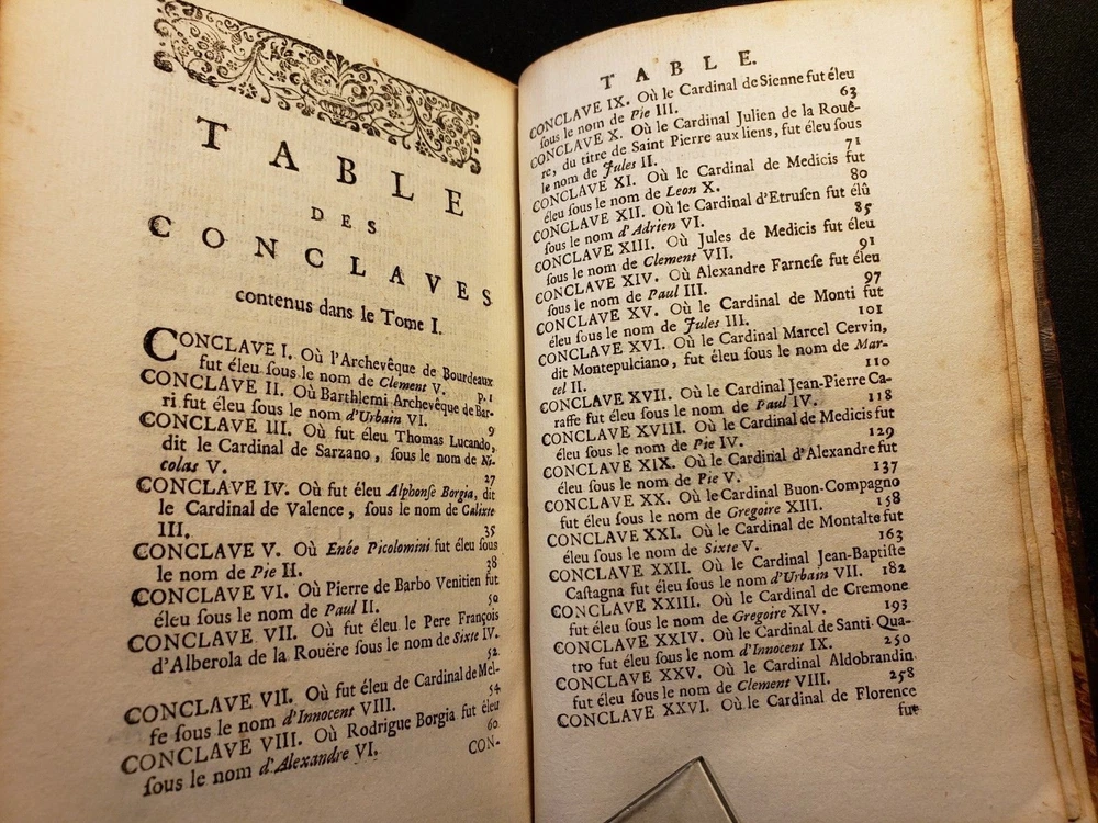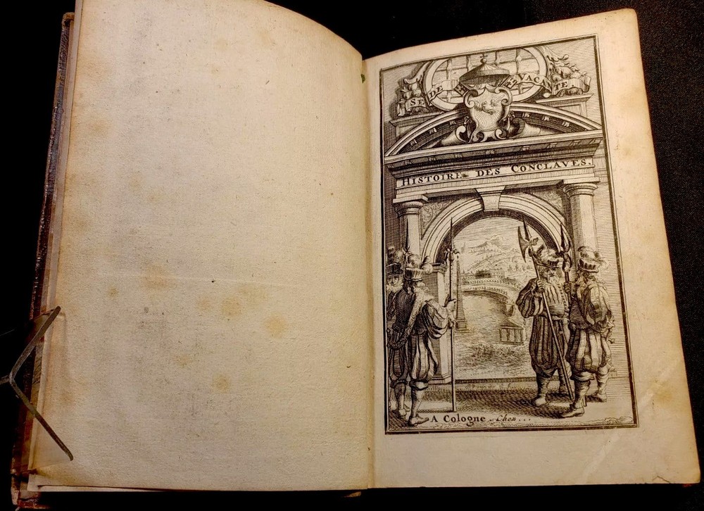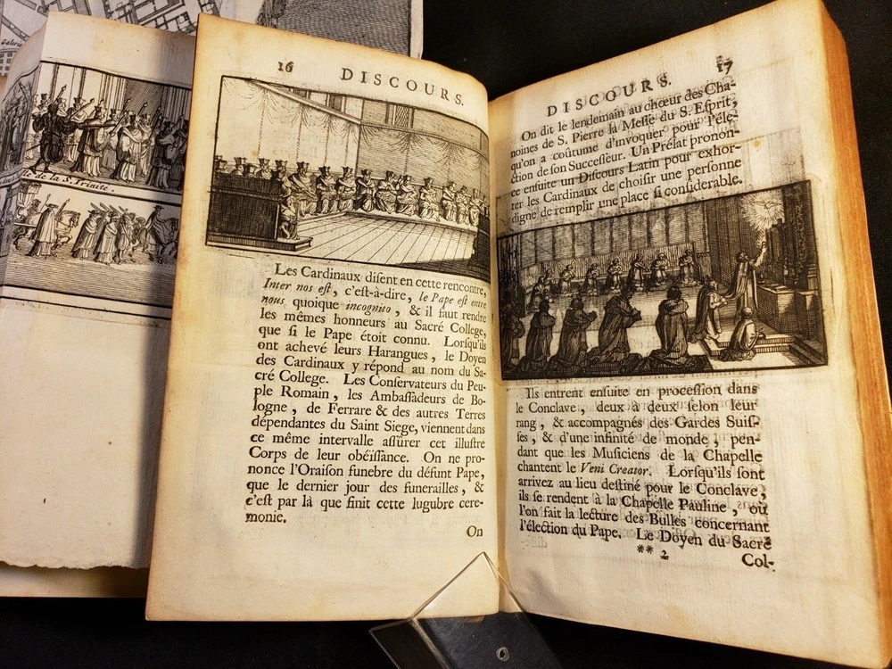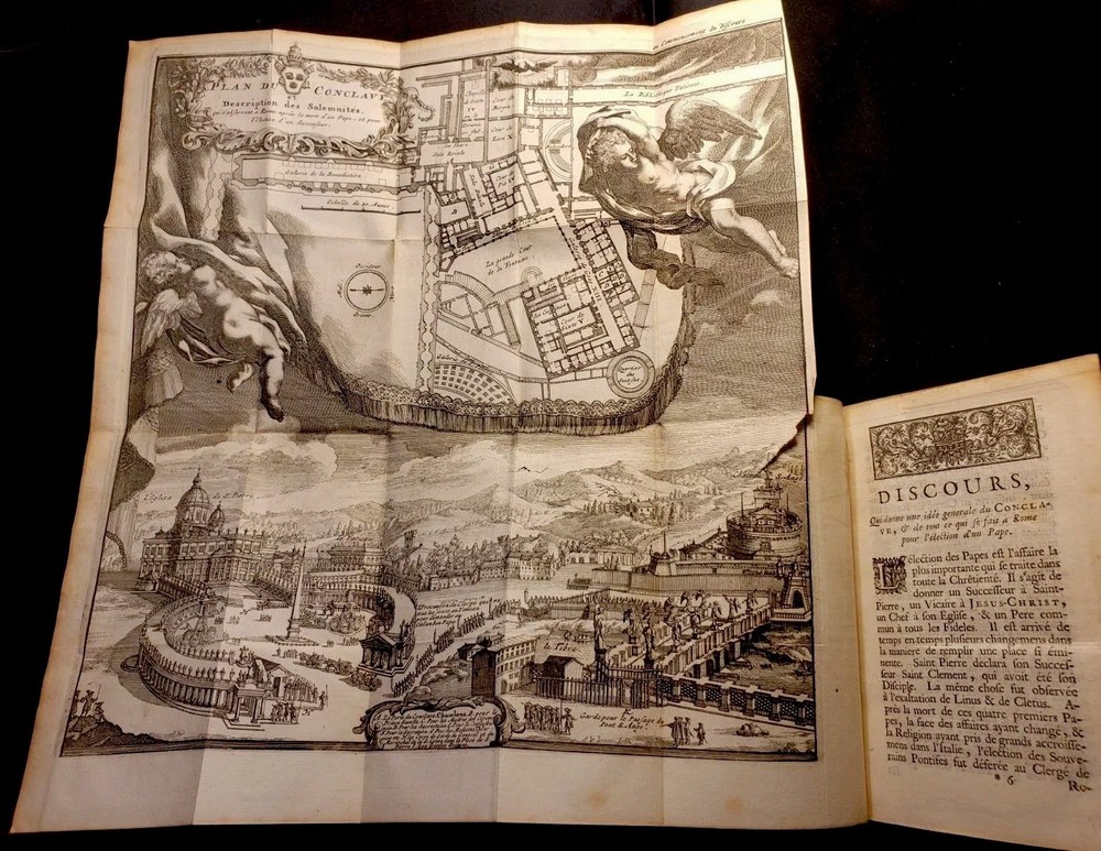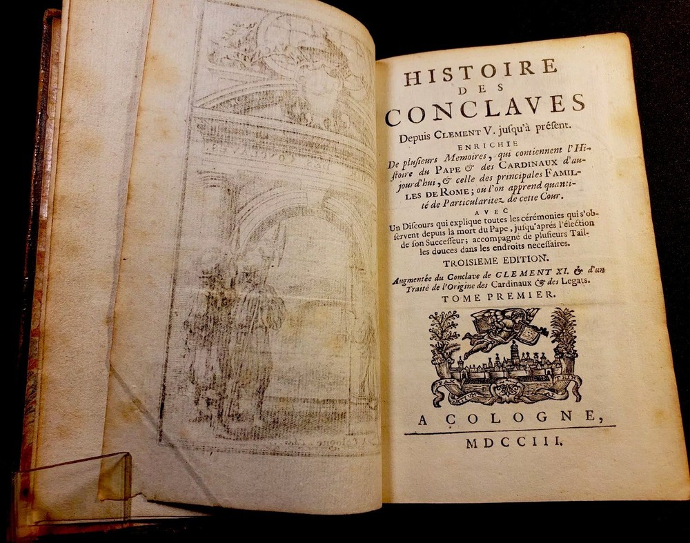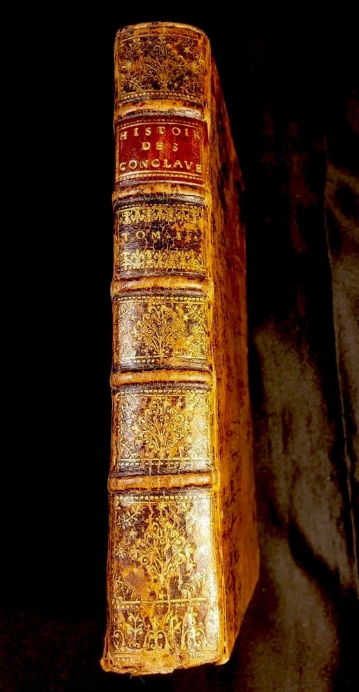 “HISTORY OF THE CONCLAVES SINCE CLEMENT V UNTIL NOW, enriched from several memoirs, which contain the history of the Popes and the Cardinals, and of the main families of Rome; where we learn particularity of this Court with a Speech which explains all the ceremonies which are observed from the death of the Pope until the election of his Successor” Volume 1 with a frontispiece, 2 folding plates and 14 engravings in-text of the ceremonies on the election and death of a Pope from the Bernard Picart's Cycle "Ceremonies and Religious Customs of all People of the World". Third Edition with Clement XI's Conclave and a Treaty of the Origin of the Cardinals and Legates. Published: 1703 in Cologne Pages: 425 Size: 6.3" x 4.2" x 1.3" See other items.