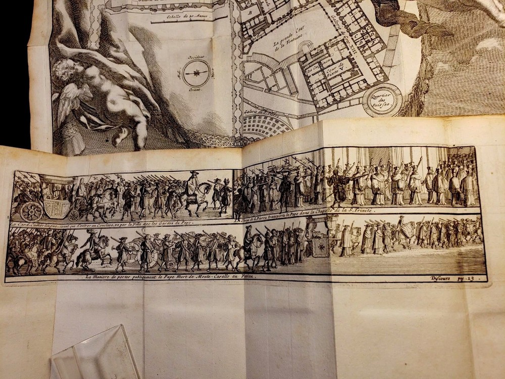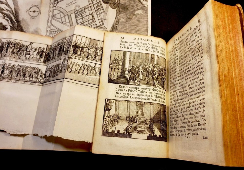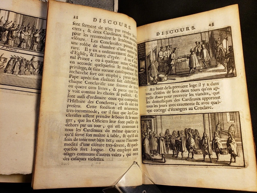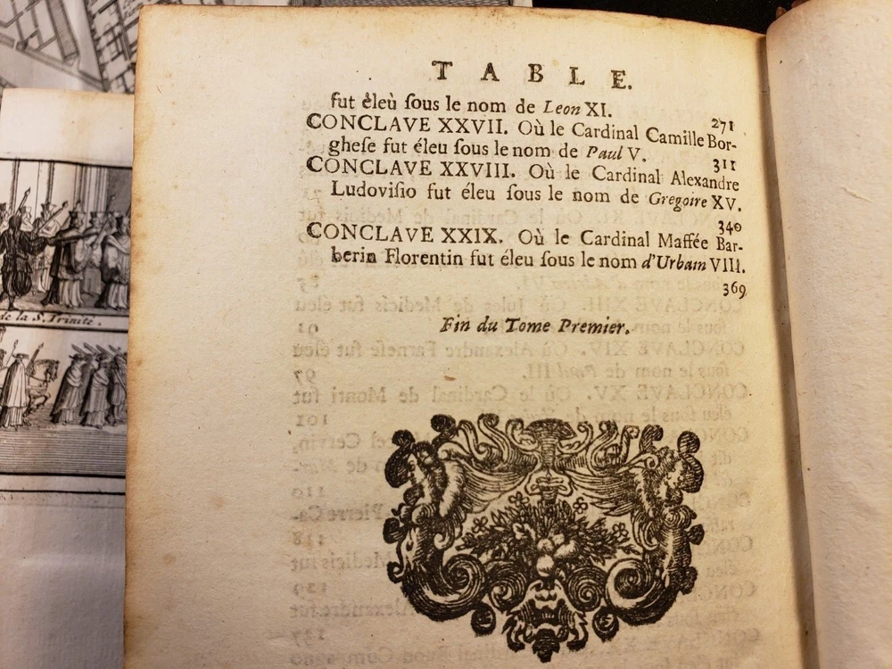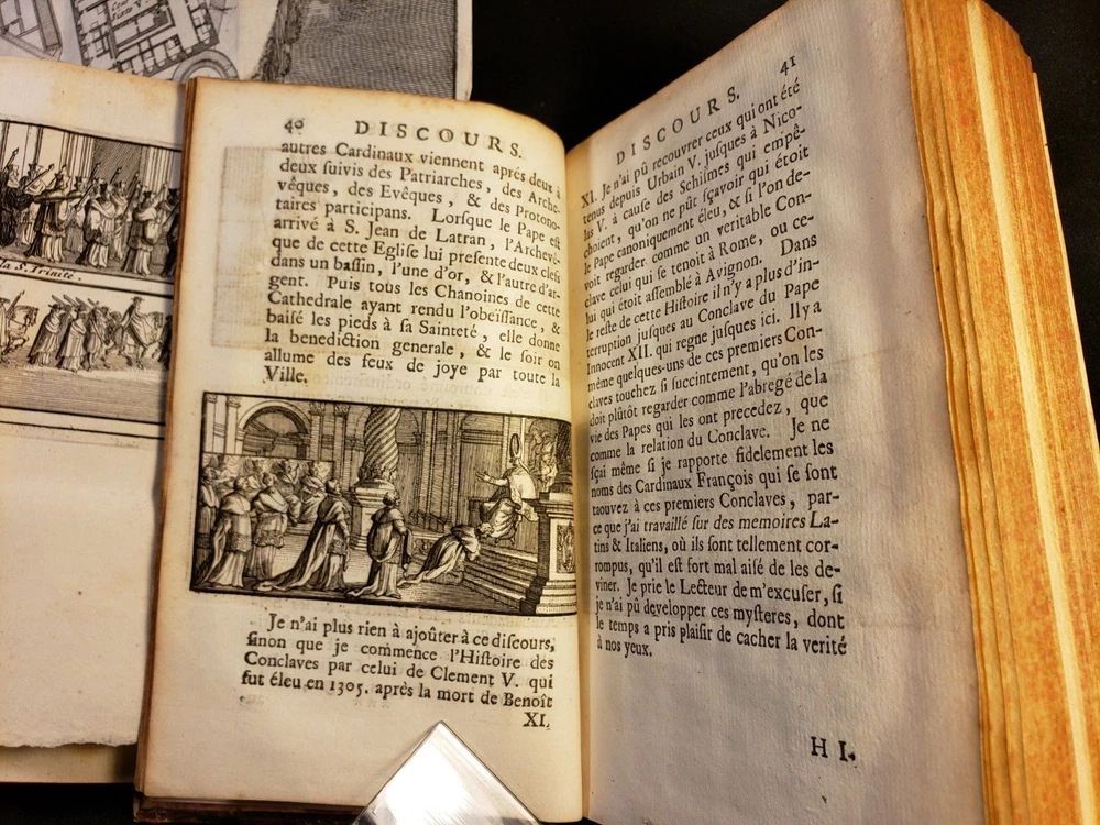 “HISTORY OF THE CONCLAVES SINCE CLEMENT V UNTIL NOW, enriched from several memoirs, which contain the history of the Popes and the Cardinals, and of the main families of Rome; where we learn particularity of this Court with a Speech which explains all the ceremonies which are observed from the death of the Pope until the election of his Successor” Volume 1 with a frontispiece, 2 folding plates and 14 engravings in-text of the ceremonies on the election and death of a Pope from the Bernard Picart's Cycle "Ceremonies and Religious Customs of all People of the World". Third Edition with Clement XI's Conclave and a Treaty of the Origin of the Cardinals and Legates. Published: 1703 in Cologne Pages: 425 Size: 6.3" x 4.2" x 1.3" See other items.