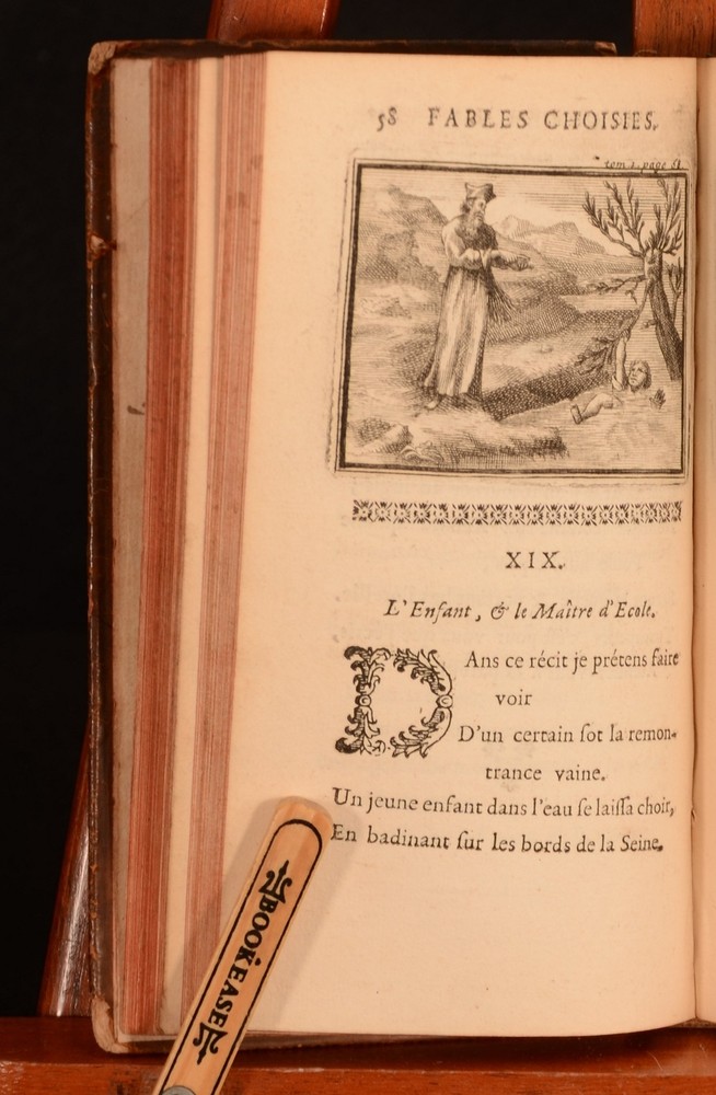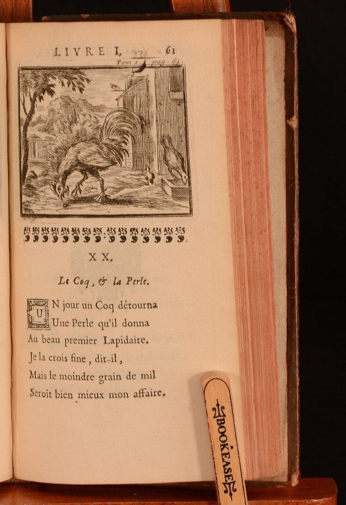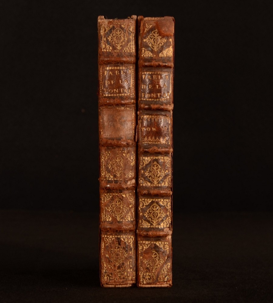 Click here to see our other books! Fables Choisies Mises en Vers Jean de la Fontaine 1709 Compagnie des Libraires : Paris 6.5" by 3" [5], 2-215; [7], 2-229, [3pp] SUMMARY Two volumes of Jean de la Fontaine's historic fables, here written in the original French, and adorned with head-pieces throughout. Illustrated,Leather Binding Overall Condition: Good This book weighs 0.75 KG when packed UK Postage: £ 3.99 US Postage: £ 19.99 EU Postage : £ 15.99 European Postage: £ 16.99 Asia Postage: £ 21.99 Worldwide Postage: £ 25.99 DESCRIPTION In two volumes, being Volumes I and II of a total of five volumes. Written in the original French. A collection of Fontaine's famous fables, which were collected from a wide variety of both Western and Eastern sources. Fontaine adapted the fables into French free verse. Some of the fables include 'The Acorn and the Pumpkin', 'The Tortoise and the Hare', and 'The Dog and the Wolf'. Illustrated throughout with headpieces to each fable. Jean de la Fontaine was best known for being a fabulist, and was one of the most popular and widely read French poets of his time, with his popularity still strong hundreds of years after his death. Prior owner's ink inscription to the front pastedowns, 'Margaret Emma Kenyon, Christmas Day, 1845'. Prior owner's ink inscription to the recto to the front free endpaper of Volume I, 'Auguste ...'. CONDITION In a full calf binding. Externally, sound. Cracks to the joints, resulting in a little strain to the hinges. Volume I is lacking a spine label. Light loss to the head and tail of the spines. Minor bumping to the extremities. Slight marking to the boards. Loss of leather to the front board of Volume II to the front joint. Volume II is lacking the front endpaper. Prior owner's ink inscription to the front pastedowns. Prior owner's ink inscription to the recto to the front endpaper of Volume I. Internally, firmly bound. Pages are lightly age-toned and generally clean with the odd spot. Mark to the edge of page 25 of Volume II. Overall Condition: Good GLOSSARY OF TERMS Overall Condition (Dustwrapper condition rating is shown after that for the book itself, where a dustwrapper is present) Fine - Very well preserved copy showing very little wear Very Good Indeed - Only one or two minor faults, really a very attractive copy Very Good - Quite a wide term meaning no major faults but probably several smaller ones often expected given the age of the book, but still a respectable copy Good - Meaning not very good. Some more serious faults as will be described in the condition report under 'condition' Good Only - Meaning one or more faults that could really do with repair Fair - As with good only above but with other faults leaving a compromised copy even after repair Poor - Really bad and possibly seriously incomplete. We only sell books in this condition where their rarity or value makes them attractive none the less. Major defects will be described. GUARANTEE We offer a full money back guarantee on our descriptions. Please ask for details and conditions. We prefer PAYPAL. If you pay via PAYPAL we will post the item off the same or the next working day with the postage you have selected. Please note we cannot accept USD cheques
