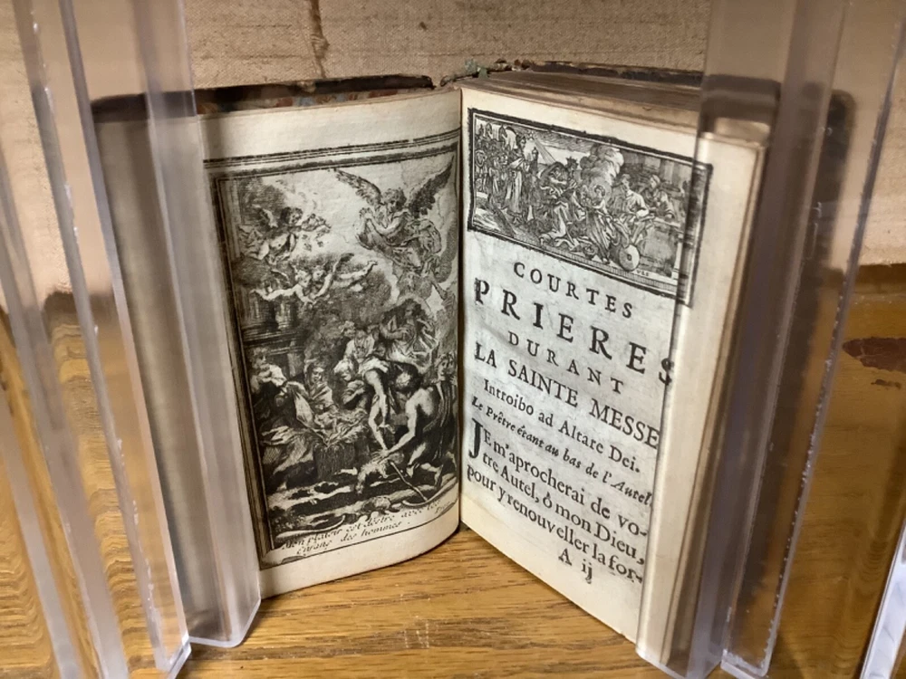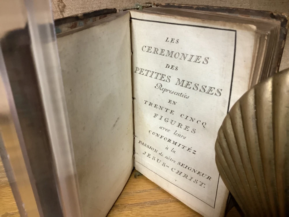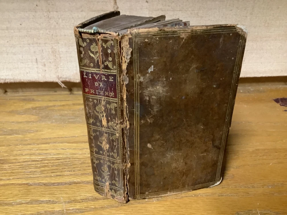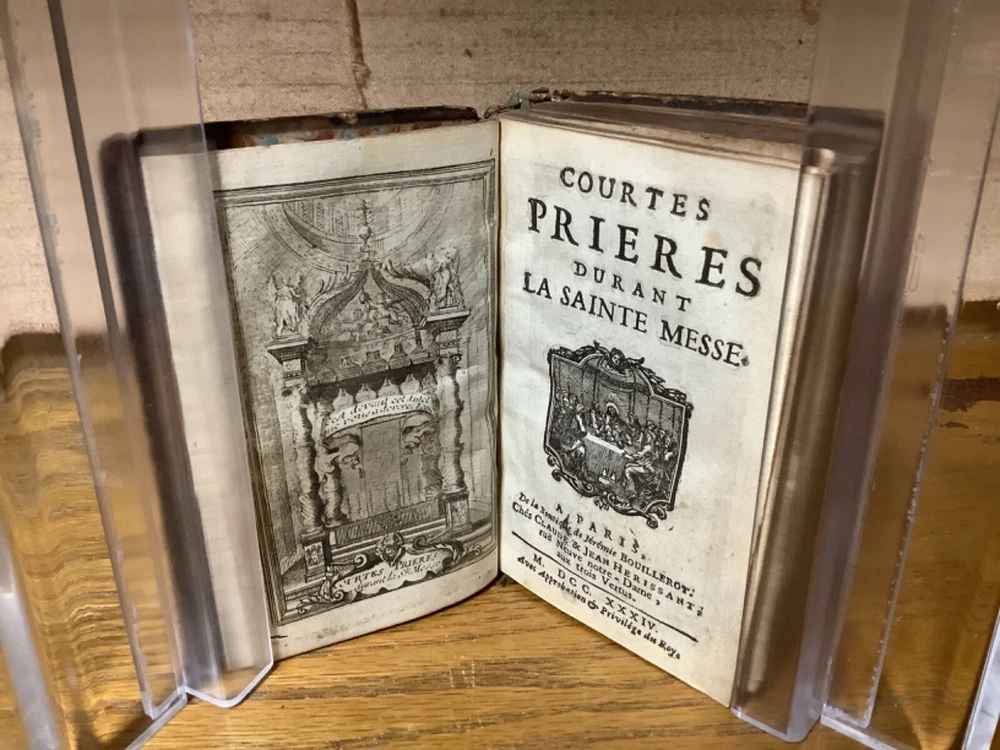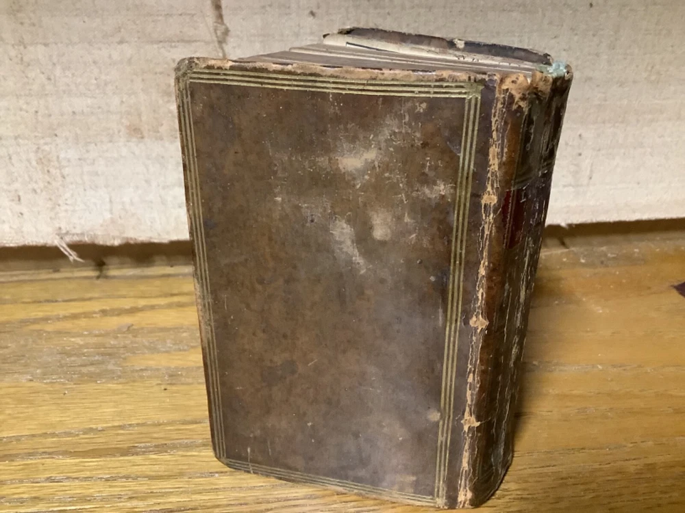 Custom-bound collection of 3 French religious and prayer books. Dated 1721 and 1734. 63, 436, and 93 pp. 5” x 3.25”, 16mo, full leather. In fair condition, with minor rubbing and wear to boards. Some exterior cracking to front hinge, along with loss to head and heel of spine, along with vertical cracking to leather down the middle. Text block remains bound well save for the first section of pages within the second book, which is separated at the bottom. Includes a variety of full-page illustrations, primarily within the first book. Light markings and marginalia. General age-related toning to pages, along with periodic foxing and wear. Please see photographs and ask any questions prior to purchasing. An assorted and unique collection of religious works in French. Titles and publication years below, while additional information may be found within the above photographs. -Courtes Prieres Durant la Sainte Messe - 1734 -Les Ceremonies des Petites Messes Representees en Trente Cincq Figures avec leurs Cnformitez a la Passion da notre Seigneur Jesus Christ (undated) -Origine et Fondation a la Confrerie de Nostre-Dame des Agnes - 1721 COLR1721AFJQ-0124-aj0883