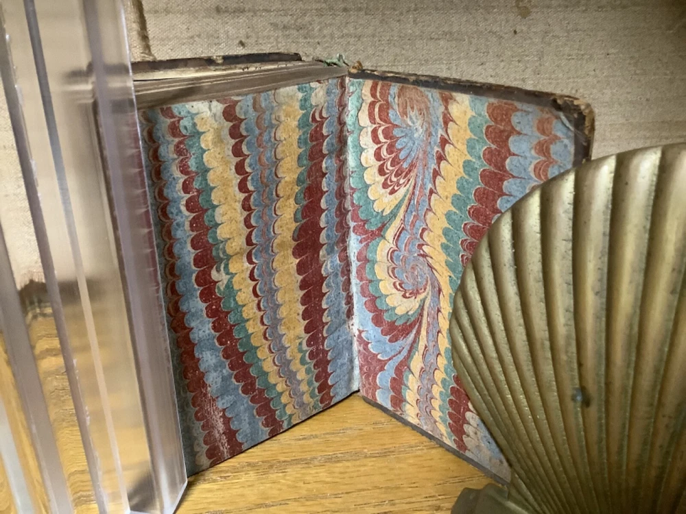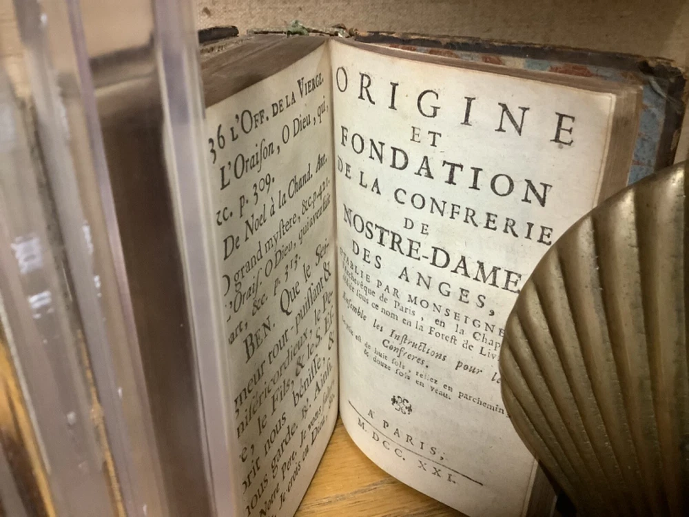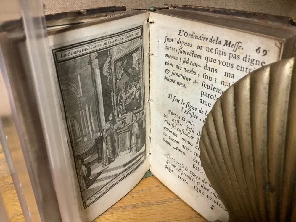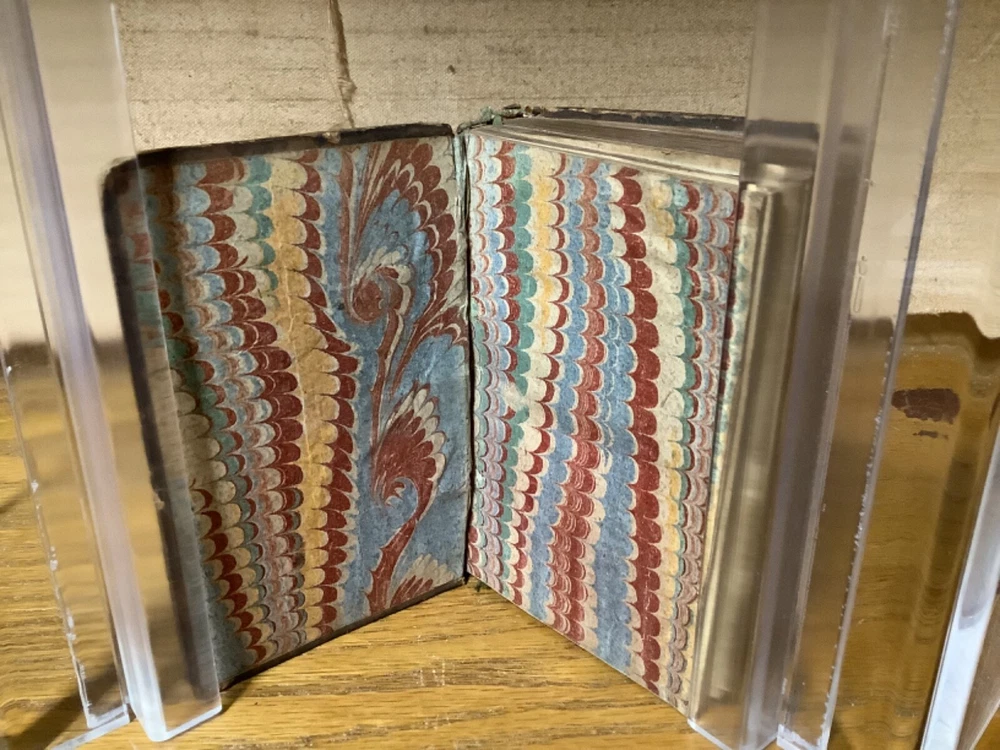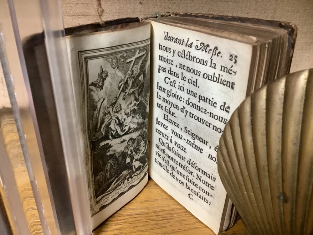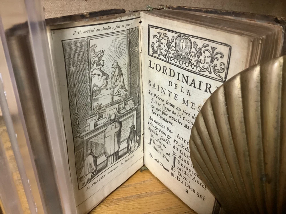 Custom-bound collection of 3 French religious and prayer books. Dated 1721 and 1734. 63, 436, and 93 pp. 5” x 3.25”, 16mo, full leather. In fair condition, with minor rubbing and wear to boards. Some exterior cracking to front hinge, along with loss to head and heel of spine, along with vertical cracking to leather down the middle. Text block remains bound well save for the first section of pages within the second book, which is separated at the bottom. Includes a variety of full-page illustrations, primarily within the first book. Light markings and marginalia. General age-related toning to pages, along with periodic foxing and wear. Please see photographs and ask any questions prior to purchasing. An assorted and unique collection of religious works in French. Titles and publication years below, while additional information may be found within the above photographs. -Courtes Prieres Durant la Sainte Messe - 1734 -Les Ceremonies des Petites Messes Representees en Trente Cincq Figures avec leurs Cnformitez a la Passion da notre Seigneur Jesus Christ (undated) -Origine et Fondation a la Confrerie de Nostre-Dame des Agnes - 1721 COLR1721AFJQ-0124-aj0883