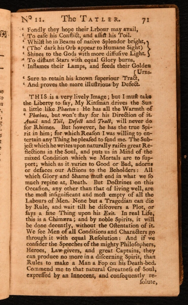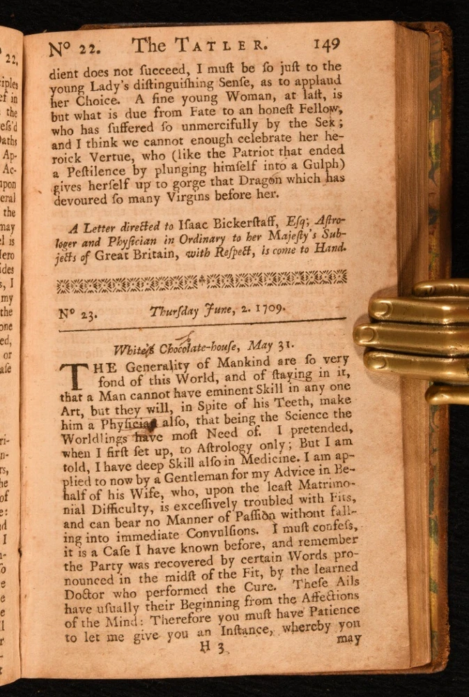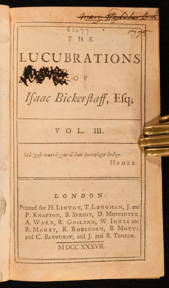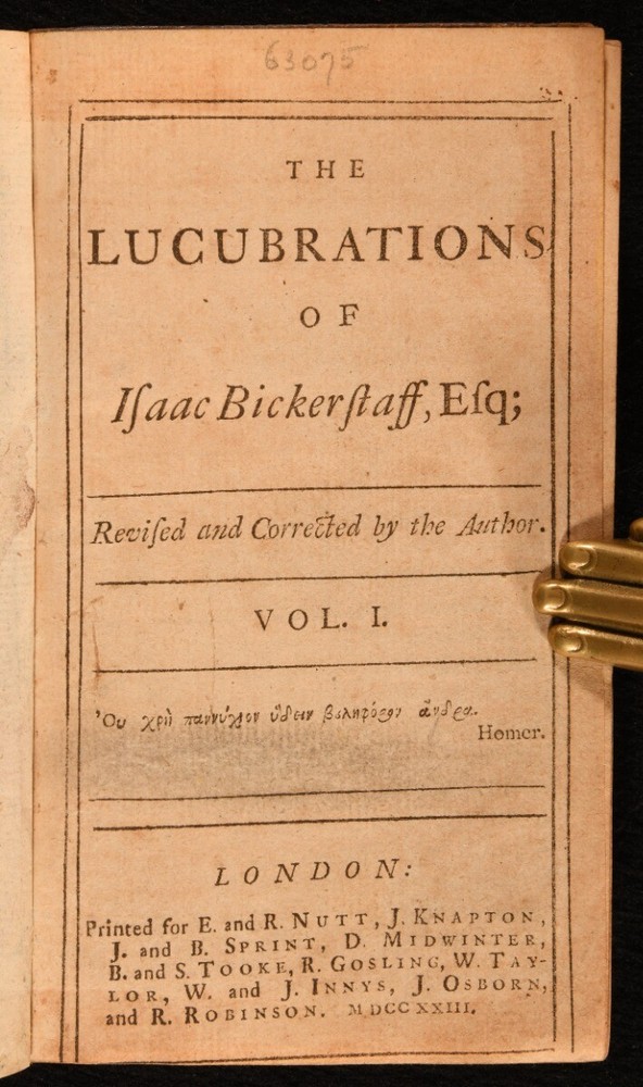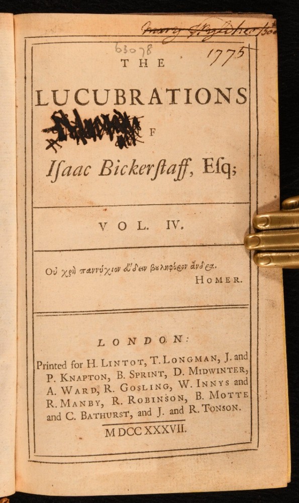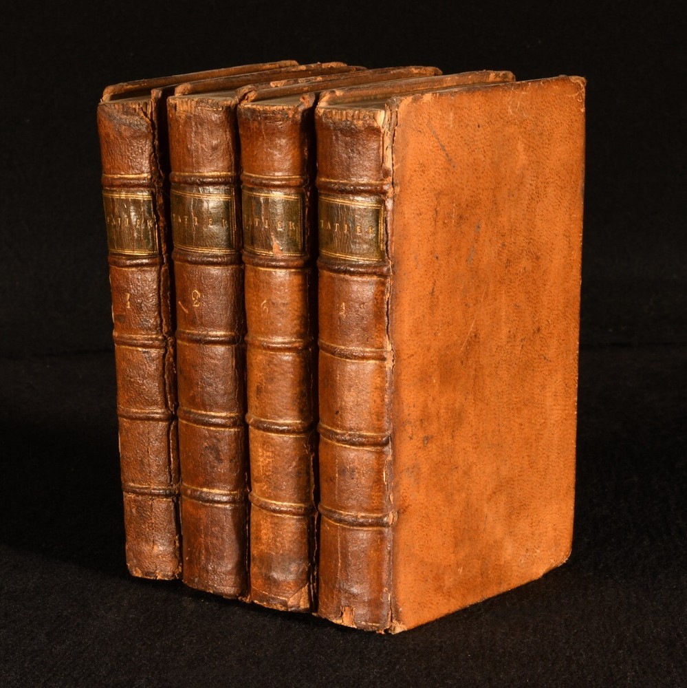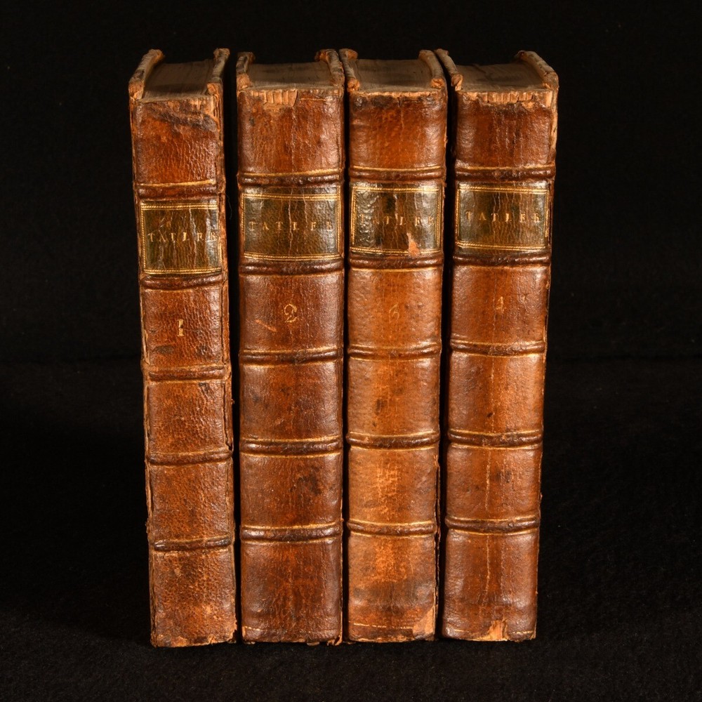 Click here to see our other books! The Lucubrations of Isaac Bickerstaff, Esq [The Tatler] Isaac Bickerstaff [Richard Steele; Joseph Addison] 1723-1737 H. Lintot, T. Longman, J. and P. Knapton : London 6.5" by 4.5" 336 [10]; 330 [10]; 312 [16]; 309 [11]pp SUMMARY A complete four volume edition of the popular early eighteenth century literary magazine founded by Richard Steele. Leather Binding Overall Condition: Good Only This book weighs 2 KG when packed UK Postage: £ 3.99 US Postage: £ 29.99 EU Postage : £ 21.99 European Postage: £ 23.99 Asia Postage: £ 37.99 Worldwide Postage: £ 38.99 DESCRIPTION Running between 1709 and 1711, 'The Tatler' was a British literary and society journal begun by Richard Steele, with significant contributions from Joseph Addison. It was written under the pseudonym 'Isaac Bickerstaff'. The running titles reflect that this was first published under the title 'The Tatler'. It represented a new approach to journalism, featuring cultivated essays on contemporary matters, and established the pattern that would be copied in such works as Addison and Steele's The Spectator, and Samuel Johnson's The Rambler and The Idler. A complete four volume edition, with volume I published in 1723 (ESTC T1239), and volumes II-IV in 1737 (ESTC N19109). With an index to the rear of each volume. With former owner's inscriptions dated 1775 to head of volume II-IV title pages, with further crossed out ink markings. CONDITION In full calf bindings. Small losses of leather to head and tail of each volume. Volume I boards exceptionally tender, with rear board of volume I held by one cord only. Volume II front joint, and volumes III and IV front and rear joints starting, with boards firmly held. Ink inscriptions to head of volumes II and IV title pages, with further crossed out ink markings. Pages age toned due to paper type, with handling marks and spotting throughout. Overall Condition: Good Only GLOSSARY OF TERMS Overall Condition (Dustwrapper condition rating is shown after that for the book itself, where a dustwrapper is present) Fine - Very well preserved copy showing very little wear Very Good Indeed - Only one or two minor faults, really a very attractive copy Very Good - Quite a wide term meaning no major faults but probably several smaller ones often expected given the age of the book, but still a respectable copy Good - Meaning not very good. Some more serious faults as will be described in the condition report under 'condition' Good Only - Meaning one or more faults that could really do with repair Fair - As with good only above but with other faults leaving a compromised copy even after repair Poor - Really bad and possibly seriously incomplete. We only sell books in this condition where their rarity or value makes them attractive none the less. Major defects will be described. GUARANTEE We offer a full money back guarantee on our descriptions. Please ask for details and conditions. We prefer PAYPAL. If you pay via PAYPAL we will post the item off the same or the next working day with the postage you have selected. Please note we cannot accept USD cheques