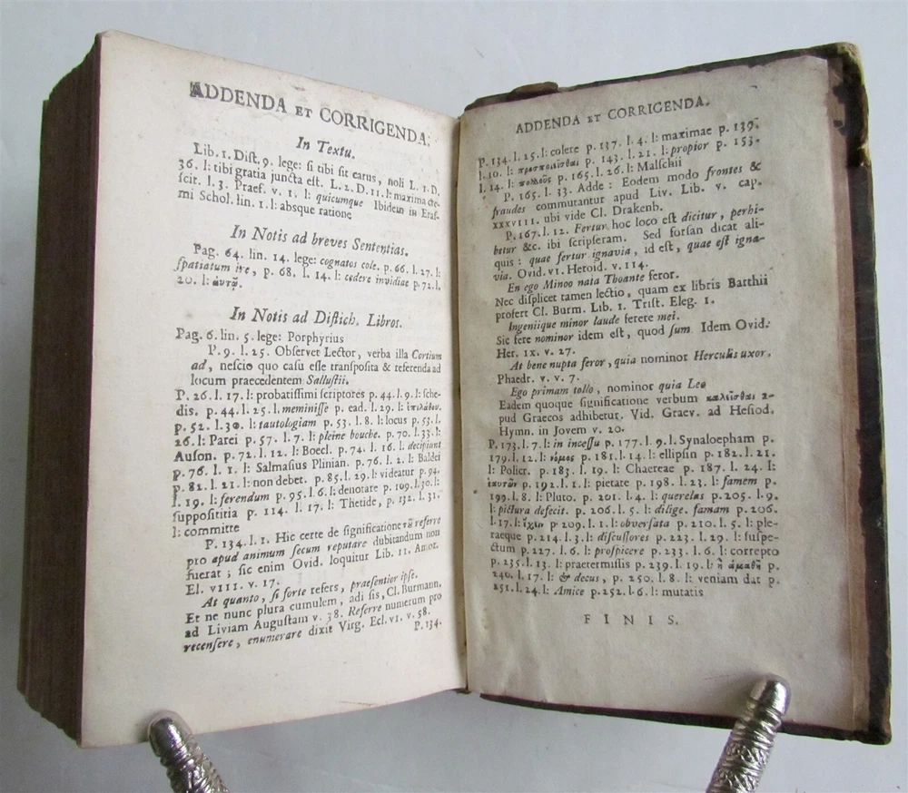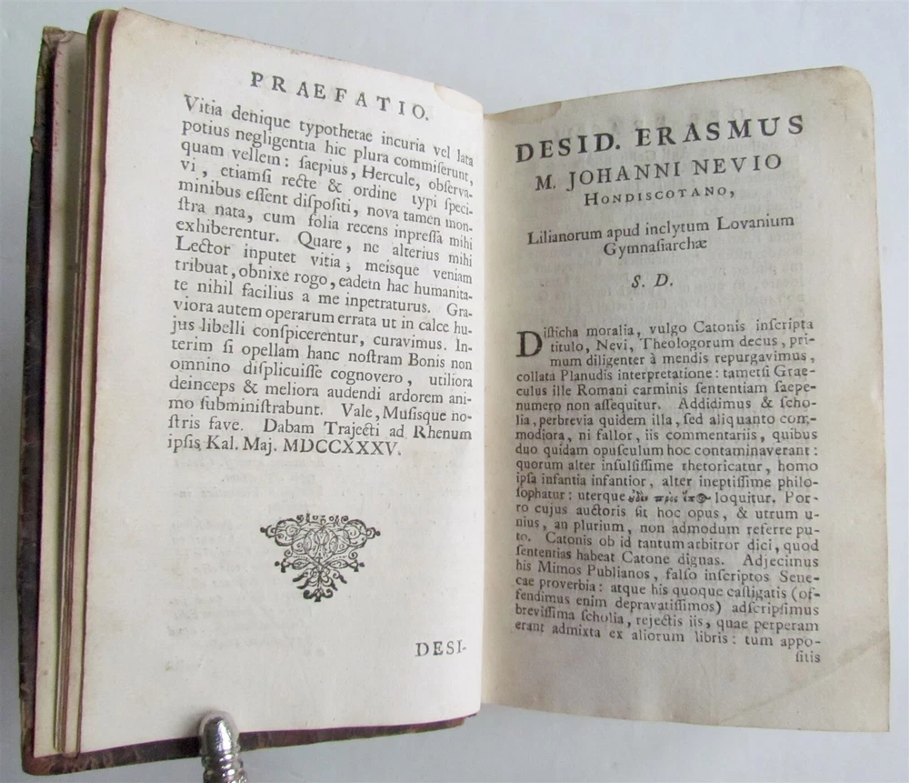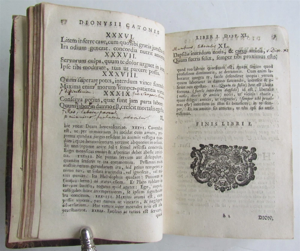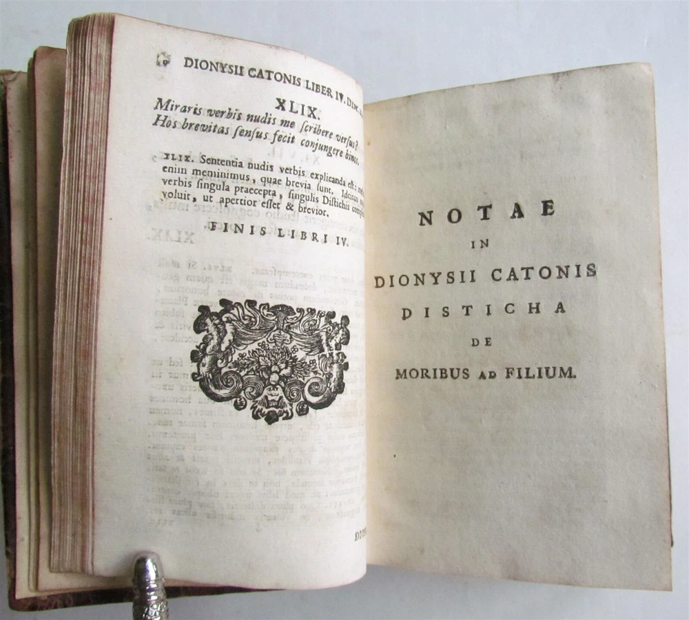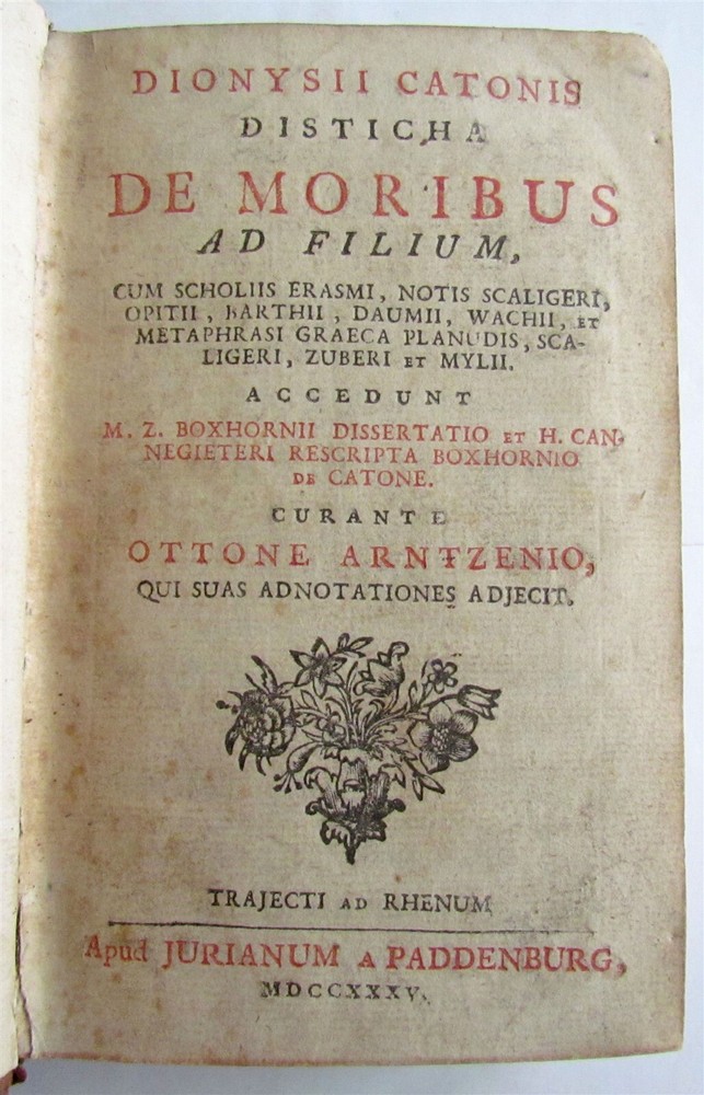 DISTICHA DE MORBIUS AD FILIUM by Dionisii Catonis Trajecti ad Rhenum, Apud JURIANUM a PADDENBURG; 1735 Size 4 by 6" Original calf. Very good condition, some wear of binding. Text in Latin ==================================== The Distichs of Cato (Latin: Catonis Disticha, most famously known simply as Cato), is a Latin collection of proverbial wisdom and morality by an unknown author from the 3rd or 4th century AD. The Cato was the most popular medieval schoolbook for teaching Latin, prized not only as a Latin textbook, but as a moral compass. Cato was in common use as a Latin teaching aid as late as the 18th century, used by Benjamin Franklin. It was one of the best-known books in the Middle Ages and was translated into many languages. ------------------- Please see my other auctions Thank You Refund Policy: We will issue a FULL REFUND, 100% money back if you are not satisfied with your purchase. Items must be returned to us within 20 days in order to receive a refund or replacement. Buyer is responsible for shipping costs. Powered by SixBit's eCommerce Solution