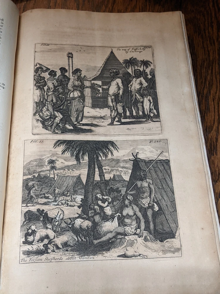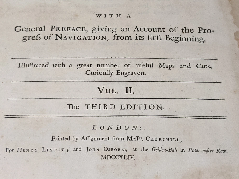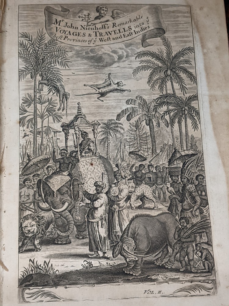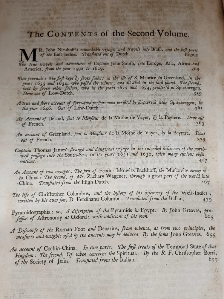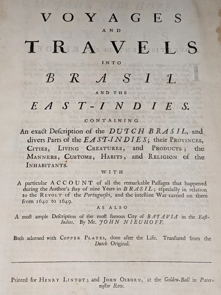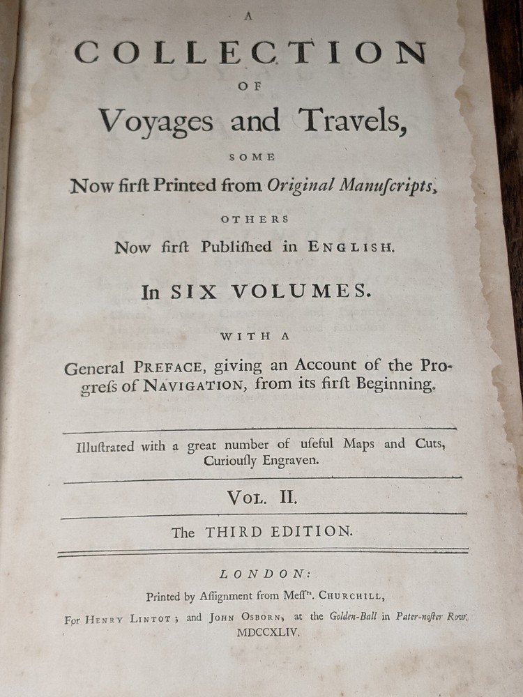Important and rare offering "A Collection Of Voyages and Travels, Some Now First Printed from Original Manuscripts, others Now first Published in English". This is Vol. II of Six Volumes. Illustrated with a great number of useful Maps and Cuts, Curiously Engraven. The Third Edition. Printed by Mess. Churchill, For Henry Lintot, and John Osborn, 1744. This Volume II contains: Voyages And Travels Into Brasil (Brazil) And The East Indies..Containing An exact Description of the Dutch Brasil, and divers parts of the East Indies; their Provinces, Cities, Living Creatures, and Products, the Manners, Customs, Habits, and Religion of the Inhabitants...By Mr. John Nieuhoff. Publisher's full leather covered boards, 6 raised bands on spine. 744pp. Illustrated with numerous engravings, many fold-outs, maps. These are undoubtedly the most magnificent illustrations contained in any book I have offered in 20+ years. Measures 14" x 9 1/2". This is a very valuable collection, both for its range of coverage and for the fact that it gives the original accounts." (Hill). This second volume comprises voyages to Brasil (Brazil), the East Indies, Africa, East Asia, and North America. The second volume contains the first English edition of Johannes Nieuhof's Voyages and Travels, into Brasil, and the East-Indies, first published in Dutch in 1682. It is divided into two parts; the first being concerned with Nieuhof's stay in Brazil and the second relates to his voyages in the East Indies and South Africa. The second part on his voyage to the East Indies, contains a detailed description of areas and pearl fishing, also Batavia, Malaya, etc.. Also included in this volume are: Travels, Adventures and Observations of Captain John Smith into Europe, Asia, Africa, and America 1593 to 1629. Two Journals: The First Kept by Seven Sailors in the Isle of St. Maurice in Greenland 1633-1634. Captain Thomas James's strange and dangerous voyage in his intended discovery of the northwest passage into the South-Sea, in the years 1631-32. The Life of Christopher Columbus, and the History of His Discovery of the West-Indies. Pyramidographia: or, A Description of the Pyramids in Egypt. An Account of Cochin-China. etc. RARE. The 6 volume set listed elsewhere for $41,000. Volume is in good condition. Pages are surprisingly primarily clean & bright; minor/moderate damp staining on fore-edge margins. No musty, loose, or missing pages, plates, or maps. Some illustrations display tanning/foxing. Front board is detached, rear board loosely connected. Wear on corners and edges of boards. A couple cracks along spine. Some soiling and rubbing on main boards. Smoke-free home.