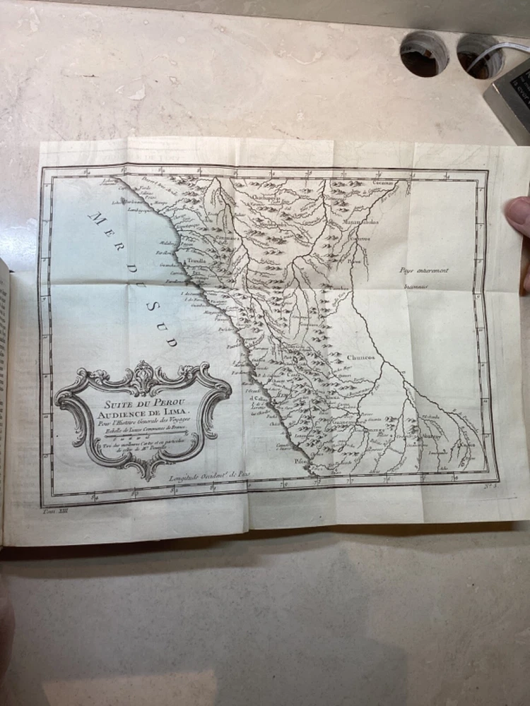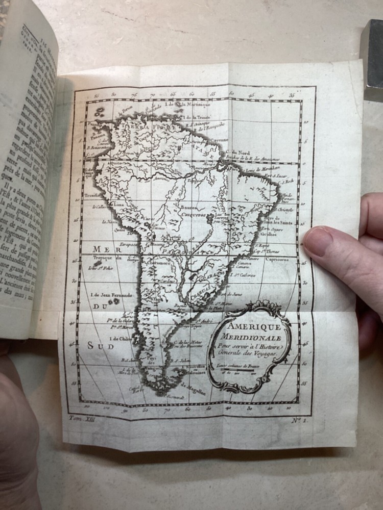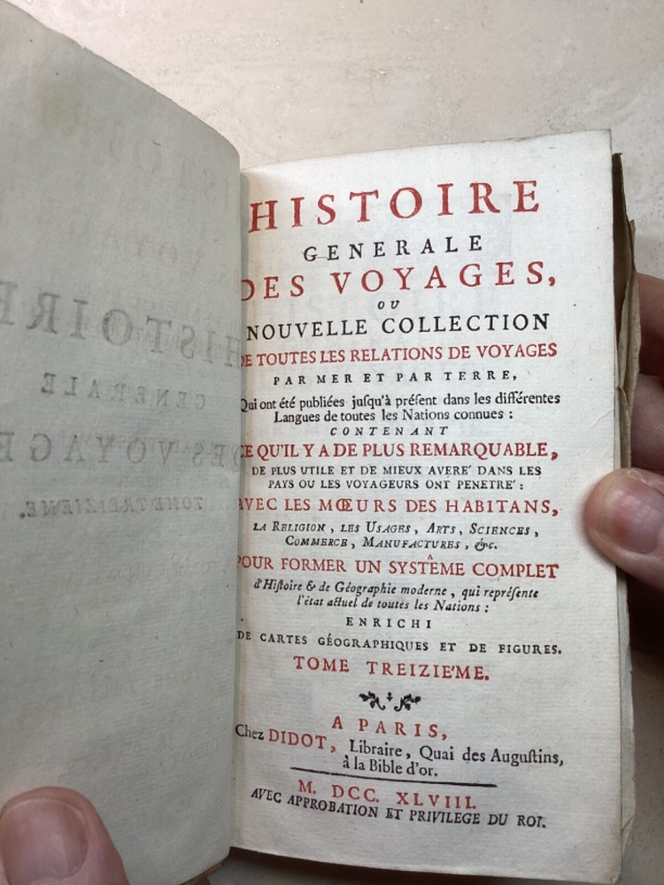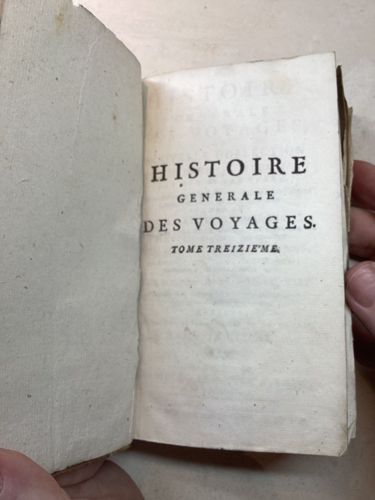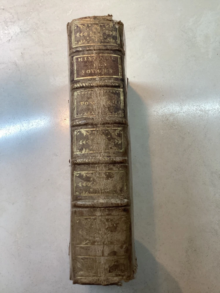 Travel back in time with this unique piece of history. The Histoire Generale des Voyages, Ou, Nouvelle Collection 1748 is a fascinating book that explores the adventures of explorers and travelers in Europe. Written by Mer and Terre, this original book in French is a great addition to any collection. The binding of this book is made of leather and it was published in Paris by Quai des Augustins. It covers subjects such as exploration, travel, and history. This is a perfect item for collectors interested in antique books. Don't miss the chance to own a piece of history. the book is an excellent condition. Overall, all of the maps and pull out diagrams are present and an excellent condition as well. The front cover, and back cover of the book have significant wear as evidenced in the pictures, but the binding and the covers are firmly attached. The book has no water damage, foxing or wormholes the pages are bright and clear. There is no writing in the book of any kind. The book is not X library and is a unique piece of history.