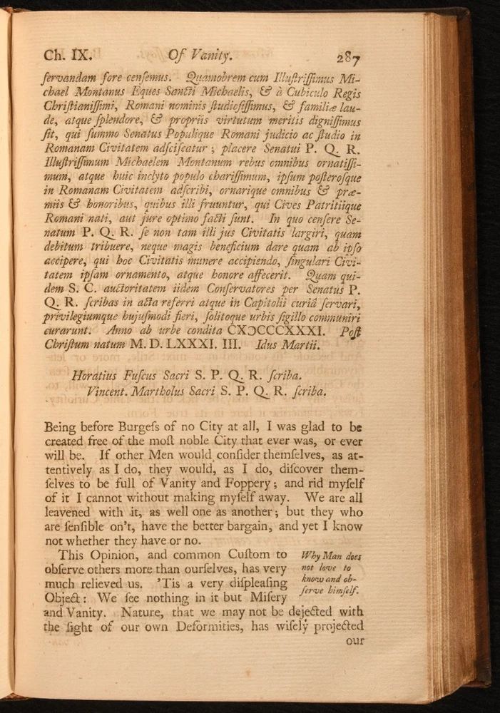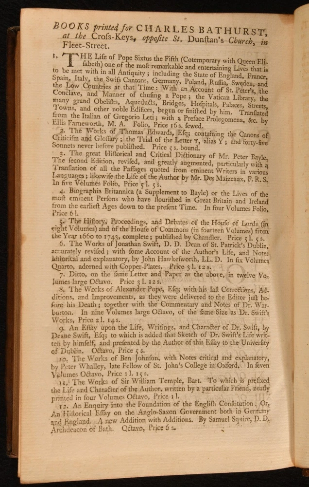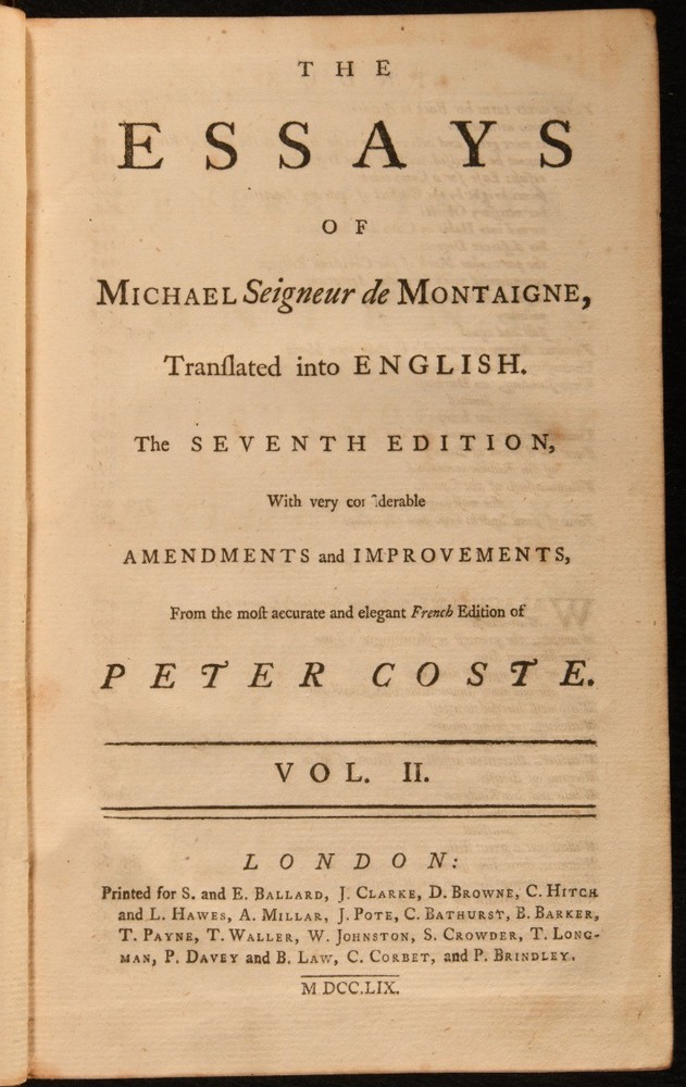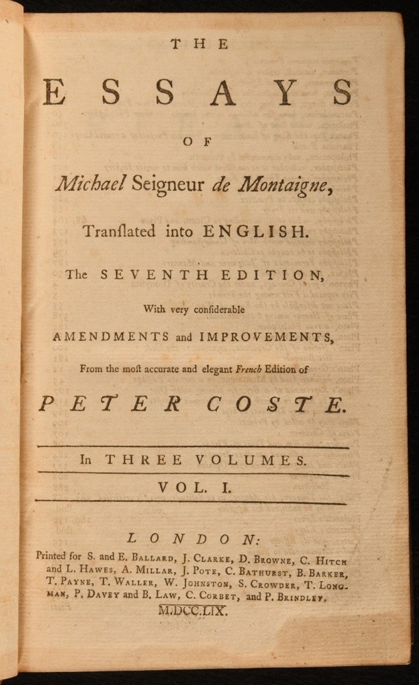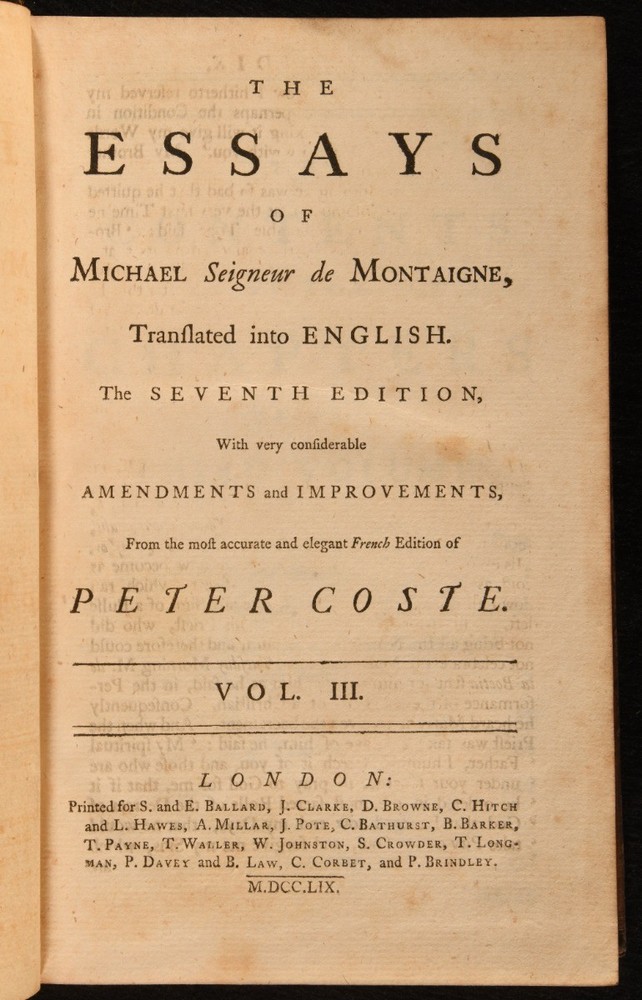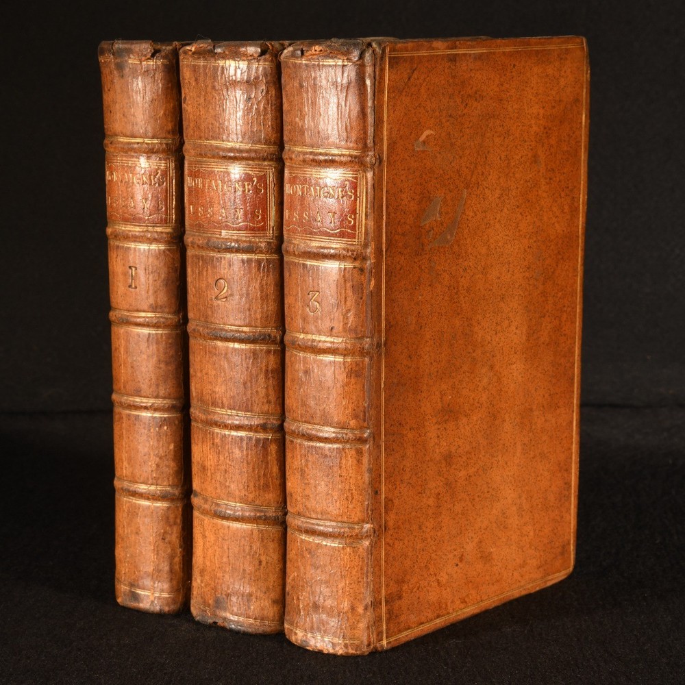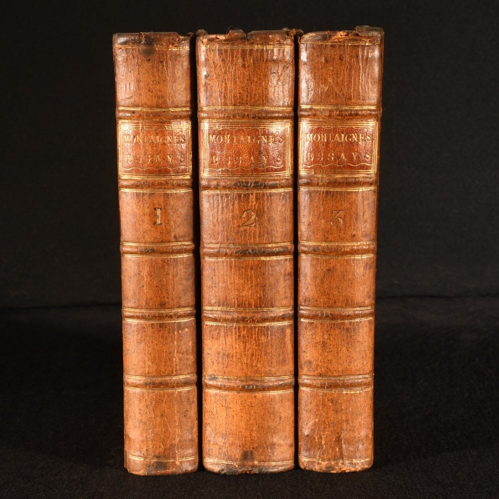 Click here to see our other books! The Essays of Michael Seigneur de Montaigne, Translated into English Michel de Montaigne; Charles Cotton [trans.] 1759 S. and E. Ballard; J. Clarke; D. Browne et al : London 8.5" by 5.5" 2-441 [25]; 608 [36]; 468 [27]pp SUMMARY The seventh edition of the English language translation of the important and highly influential essays of Michel de Montaigne. Leather Binding Overall Condition: Very Good This book weighs 3 KG when packed UK Postage: £ 3.99 US Postage: £ 36.99 EU Postage : £ 25.99 European Postage: £ 27.99 Asia Postage: £ 47.99 Worldwide Postage: £ 69.99 DESCRIPTION The seventh edition, complete in three volumes, 'with very considerable amendments and improvements, from the most elegant and accurate French edition of Peter Coste'. This is a revised version of Charles Cotton's translation. A collection of the influential essays written by the French philosopher Michel de Montaigne. The essays were originally written in Middle French during the French Renaissance, published roughly between the years 1570 to 1592. The essays themselves cover a wide variety of subjects, from philosophy and religion, to cannibals, age, drunkenness, friendships, education, physiognomy, vanity, thumbs, anger, books, fear, imagination, and many more topics. Montaigne is known for popularising essays as a literary genre, and his essays have proven to be some of the most influential ever written. His works influenced the likes of Francis Bacon, William Shakespeare, Blaise Pascal, Jean-Jacques Rousseau, and Friedrich Nietzsche. Advertisement leaf to rear of volume II. With extensive indices to the rear of each volume. With the armorial bookplate of Bathurst of Lydney Park to front pastedowns. ESTC T107768 CONDITION In full calf bindings. Externally, very smart. Minor losses of calf to back strip heads. Head of rear joint of volume II and head of front joint of volume III starting, with boards firmly held. Armorial bookplates to front pastedowns. Internally, firmly bound. Pages bright. Neat minor ink marks to margins of pages 110-115 of volume I. Pages otherwise exceptionally clean. Overall Condition: Very Good GLOSSARY OF TERMS Overall Condition (Dustwrapper condition rating is shown after that for the book itself, where a dustwrapper is present) Fine - Very well preserved copy showing very little wear Very Good Indeed - Only one or two minor faults, really a very attractive copy Very Good - Quite a wide term meaning no major faults but probably several smaller ones often expected given the age of the book, but still a respectable copy Good - Meaning not very good. Some more serious faults as will be described in the condition report under 'condition' Good Only - Meaning one or more faults that could really do with repair Fair - As with good only above but with other faults leaving a compromised copy even after repair Poor - Really bad and possibly seriously incomplete. We only sell books in this condition where their rarity or value makes them attractive none the less. Major defects will be described. GUARANTEE We offer a full money back guarantee on our descriptions. Please ask for details and conditions. We prefer PAYPAL. If you pay via PAYPAL we will post the item off the same or the next working day with the postage you have selected. Please note we cannot accept USD cheques