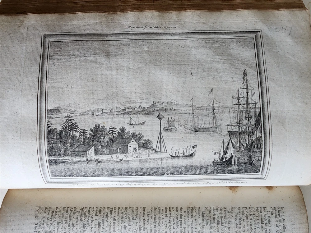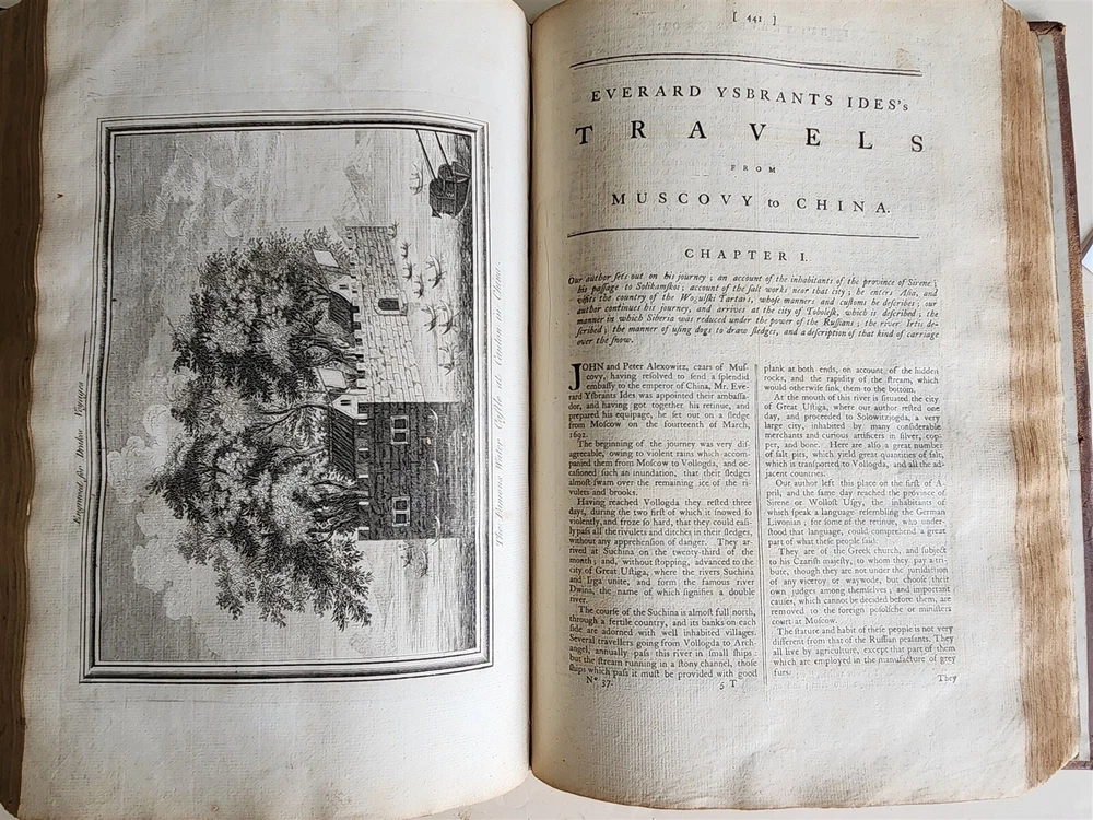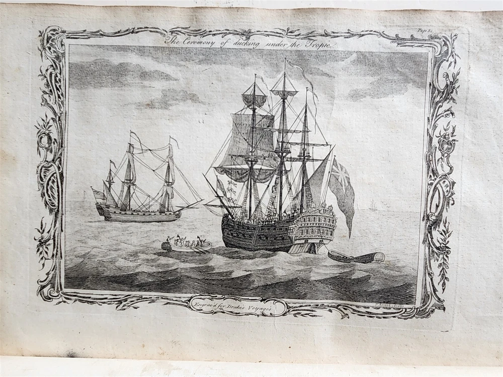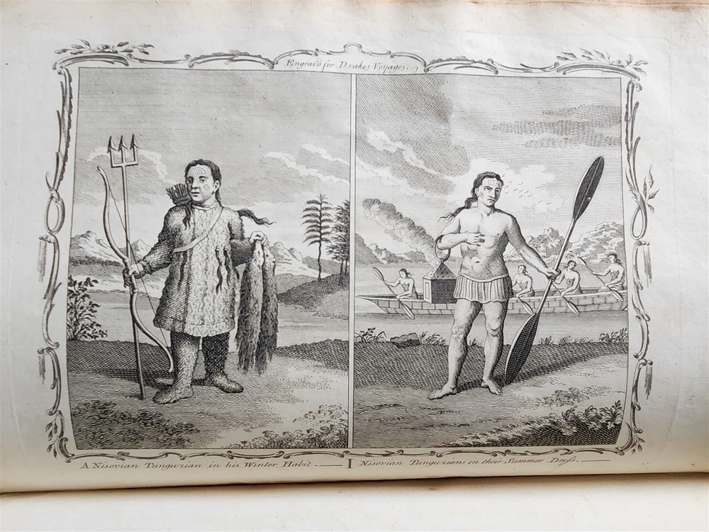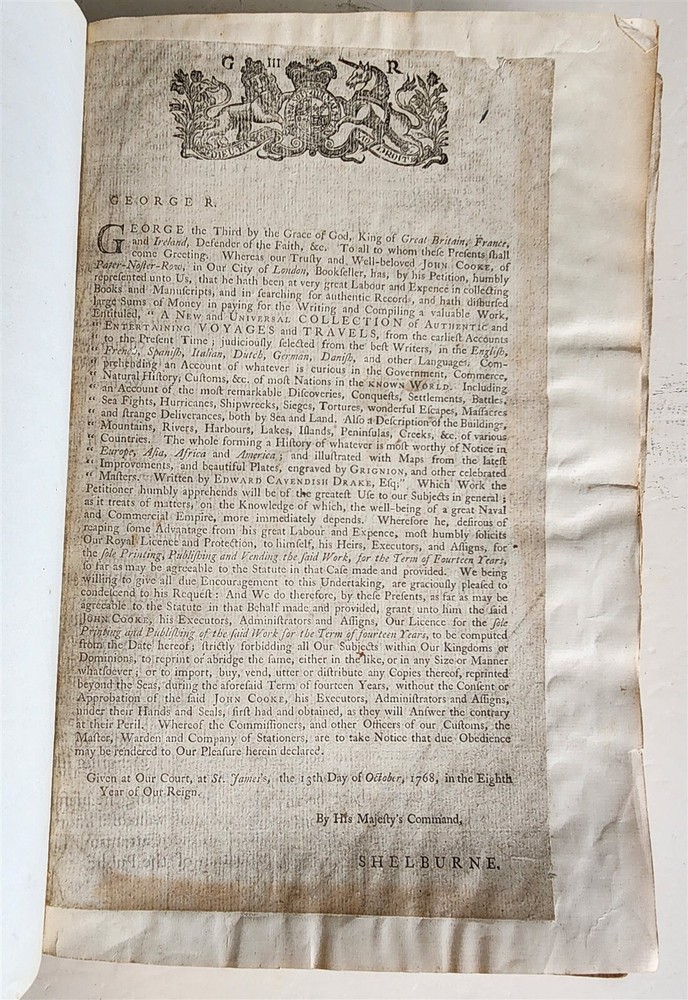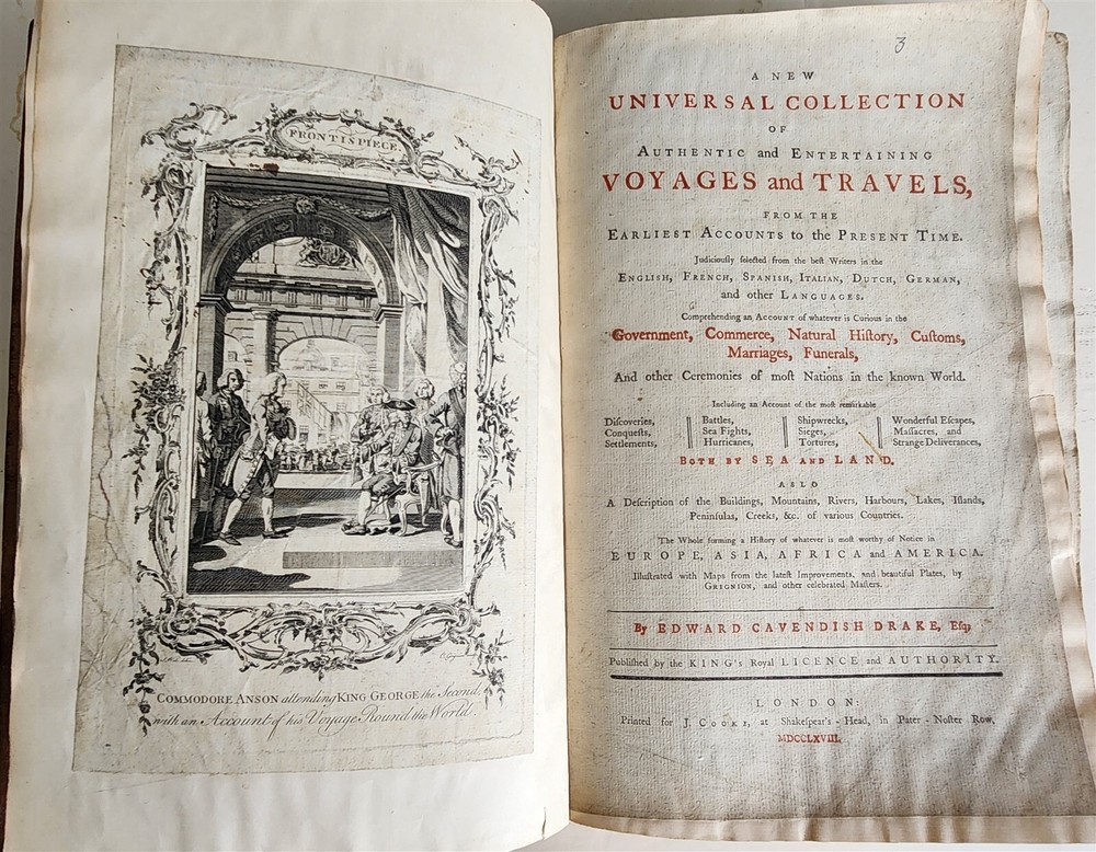 A new universal collection of authentic and entertaining voyages and travels from the earliest accounts to the present time... Comprehending an account of whatever is curious in the Government, Commerce, Natural History, Customs, Marriages, Funerals and other ceremonies of most nations in the known world by Drake, Edward Cavendish London, Cooke ; 1768 Folio: 9.5 by 14.5" First folio edition FULLY ILLUSTRATED 706 pp. Compendium of all major travel descriptions. Full leather binding , spine with raised bands First 4 leaves laid down, some plates are missing, damage to the lower margin of last about 10 leaves, a couple of leaves are repaired, book block broken in one place Text in English ===================== Please see my other auctions Thank You Refund Policy: We will issue a FULL REFUND, 100% money back if you are not satisfied with your purchase. Items must be returned to us within 20 days in order to receive a refund or replacement. Buyer is responsible for shipping costs. Powered by SixBit's eCommerce Solution