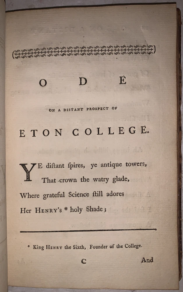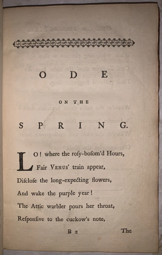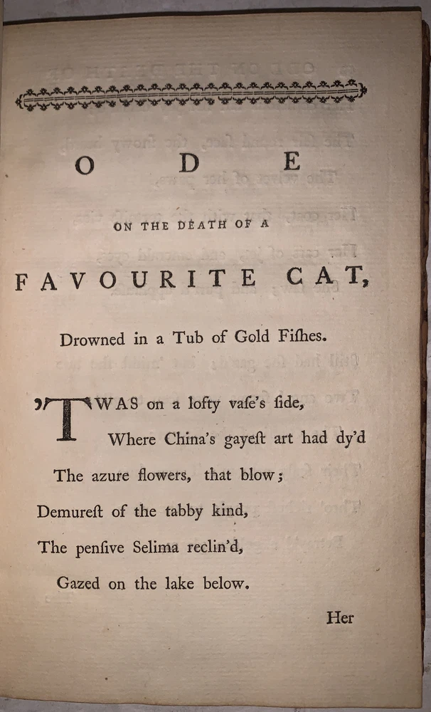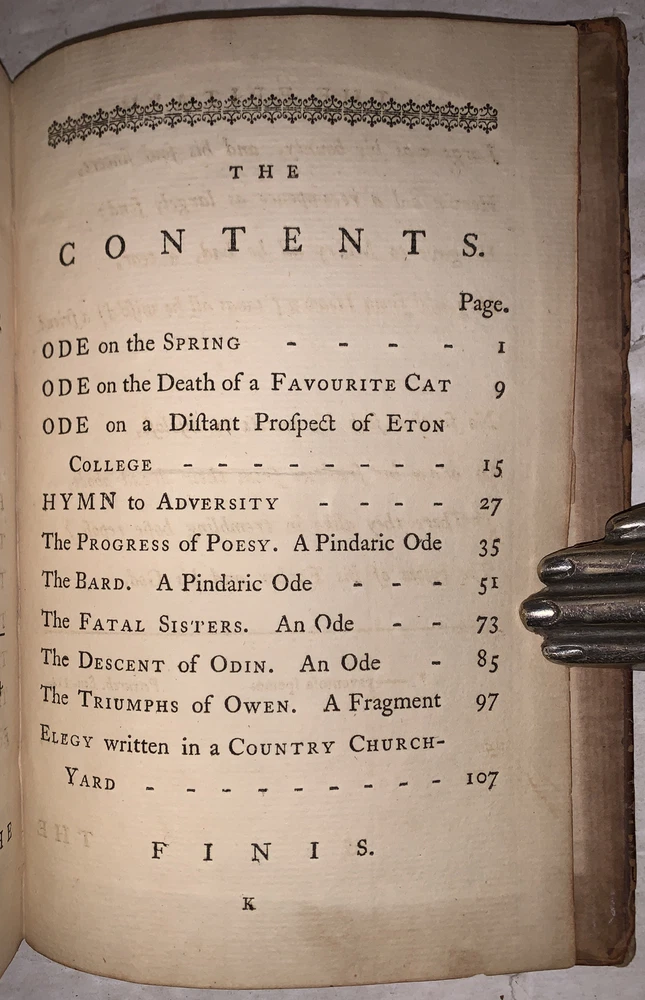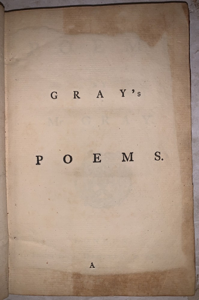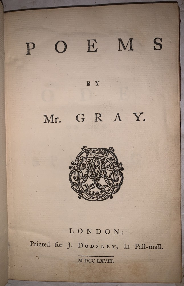 [Gray, Thomas] Poems by Mr. Gray London: J. Dodsley 1768 First Collected Edition, Containing the first appearance of "The Fatal Sisters", "The Descent of Odin", and "The Triumphs of Owen." 12mo, 121 pages, period full leather with raised bands and gilt decoration to spine. Previous owner's neat bookplate, both boards detached, rubbing and wear, slight foxing, else in good + condition. If you have any questions feel free to ask and don't forget to check out my other listings.