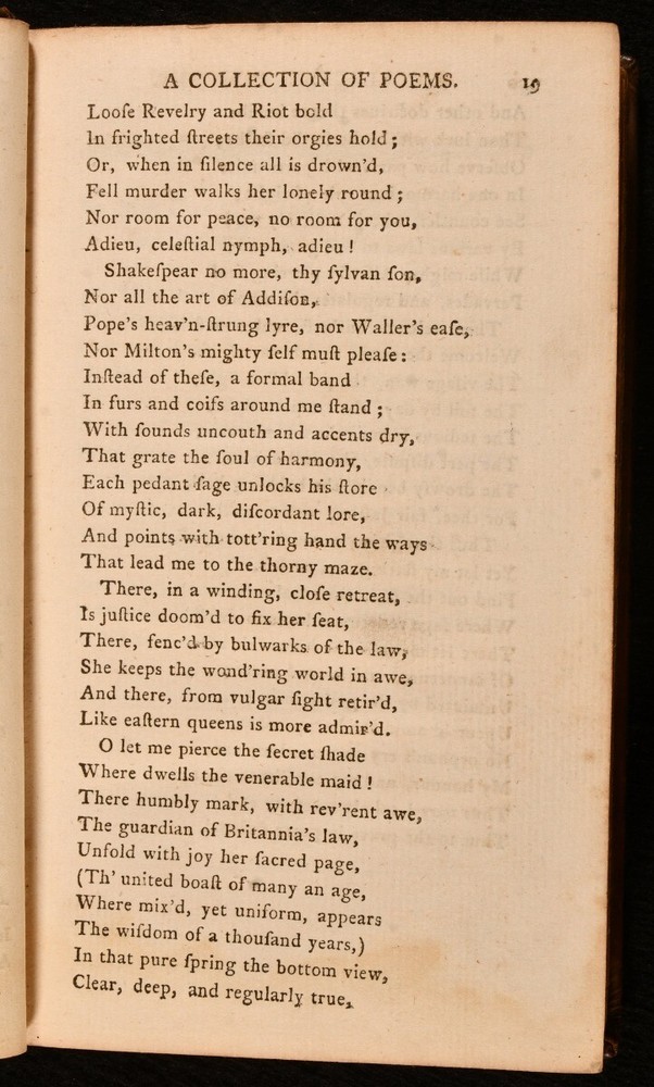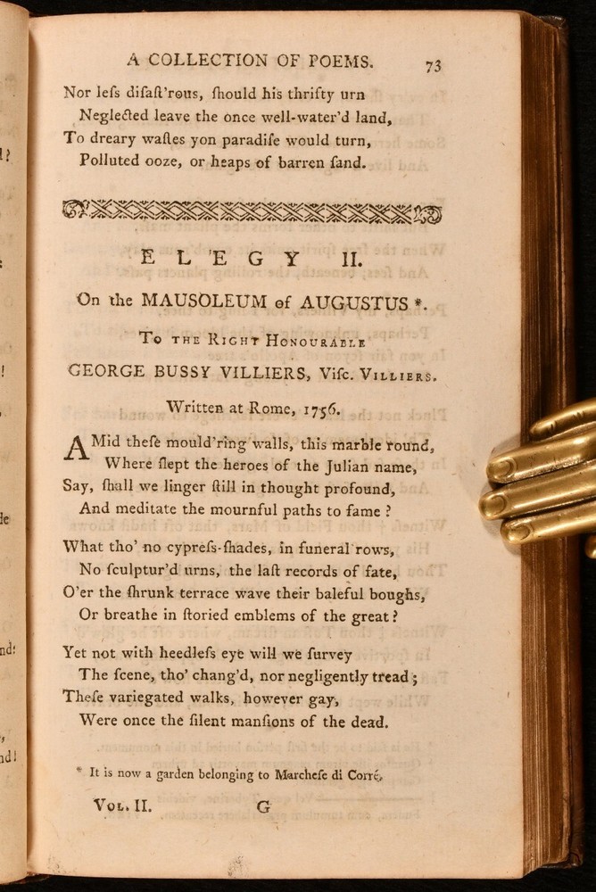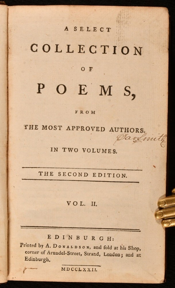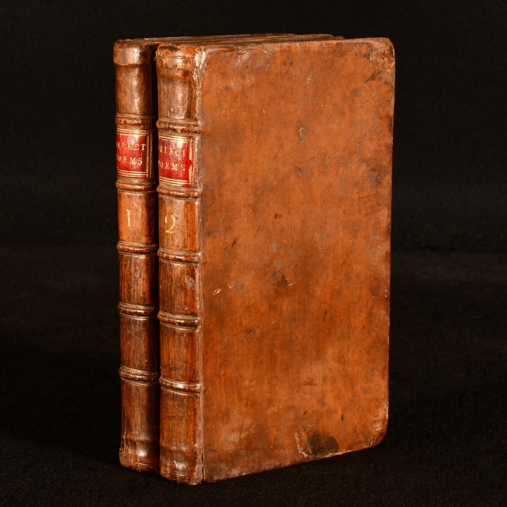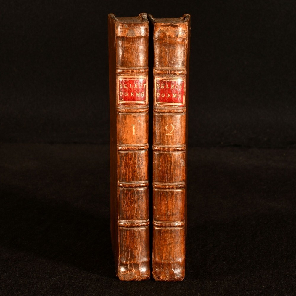 Click here to see our other books! A Select Collection of Poems, from the Most Approved Authors Alexander Donaldson [ed.]; Samuel Johnson; Lord Lyttleton; Lord Lovelace; Mr. Mason et al 1772 A. Donaldson : Edinburgh 7.5" by 4.5" ix [2], 2-262; 271pp SUMMARY The scarce second edition of this wonderful collection of poetry from a variety of writers from the eighteenth century and earlier. Early Edition,Leather Binding Overall Condition: Very Good This book weighs 1 KG when packed UK Postage: £ 3.99 US Postage: £ 22.99 EU Postage : £ 16.99 European Postage: £ 17.99 Asia Postage: £ 22.99 Worldwide Postage: £ 28.99 DESCRIPTION The scarce second edition of this work, complete in two volumes. Retaining the original half titles. These volumes are likely edited by the publisher Alexander Donaldson, who in the 1774 case 'Donaldson v Beckett' overturned so called 'perpetual copyright', putting older literature into the public domain. Including poems from a wealth of writers, including Samuel Johnson, Lord Lyttleton, Lord Lovelace, Mr. Mason, Elizabeth Carter, Goldsmith, James Thomson and others. ESTC N21829. With the inscription of B Smith, 1832, to the front free endpaper of volume I, and the 1777 inscriptions of Will. Roberston to the verso of each front free endpaper. With a further inscription to each title page. A wonderful insight into the popular poetry of the eighteenth century. CONDITION In full calf bindings. Light rubbing to head of volume II back strip, otherwise externally very smart. Hinges strained, but firmly held. Inscriptions to front free endpaper of each volume, and to each title page. Loss to head of volume I half title. Volume I lacking rear blank and free endpaper. Volume II lacking a rear blank. Internally, firmly bound. Pages a touch age toned due to paper type, with the odd handling mark. Overall Condition: Very Good GLOSSARY OF TERMS Overall Condition (Dustwrapper condition rating is shown after that for the book itself, where a dustwrapper is present) Fine - Very well preserved copy showing very little wear Very Good Indeed - Only one or two minor faults, really a very attractive copy Very Good - Quite a wide term meaning no major faults but probably several smaller ones often expected given the age of the book, but still a respectable copy Good - Meaning not very good. Some more serious faults as will be described in the condition report under 'condition' Good Only - Meaning one or more faults that could really do with repair Fair - As with good only above but with other faults leaving a compromised copy even after repair Poor - Really bad and possibly seriously incomplete. We only sell books in this condition where their rarity or value makes them attractive none the less. Major defects will be described. GUARANTEE We offer a full money back guarantee on our descriptions. Please ask for details and conditions. We prefer PAYPAL. If you pay via PAYPAL we will post the item off the same or the next working day with the postage you have selected. Please note we cannot accept USD cheques
