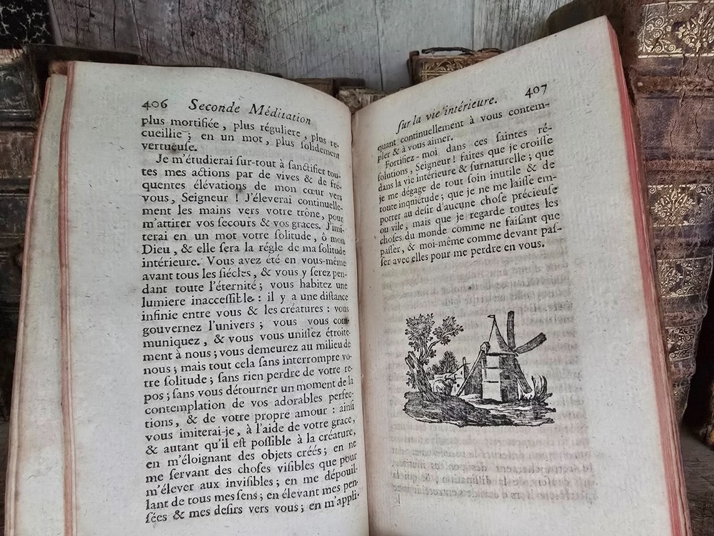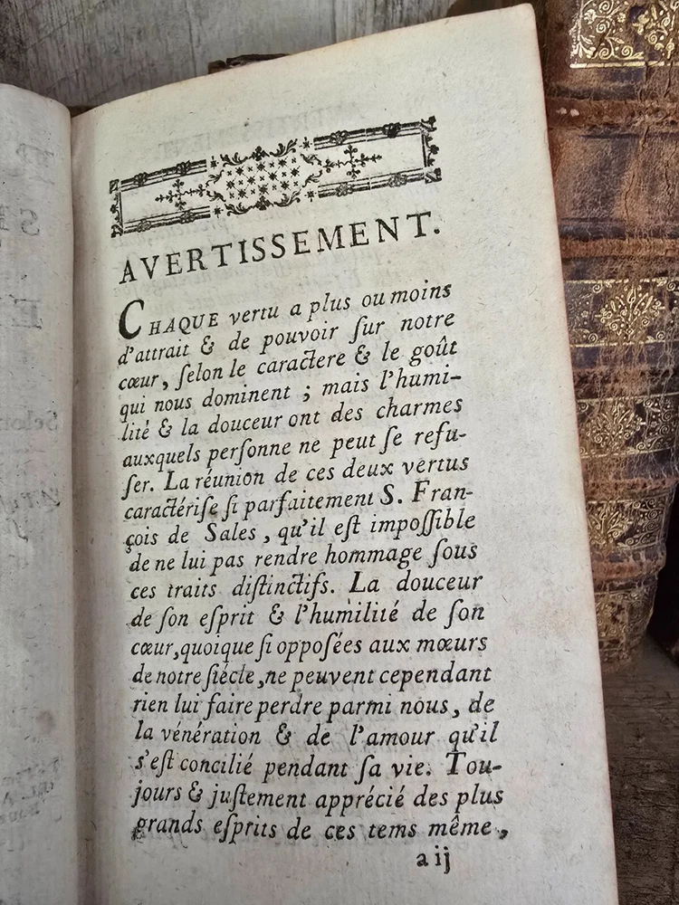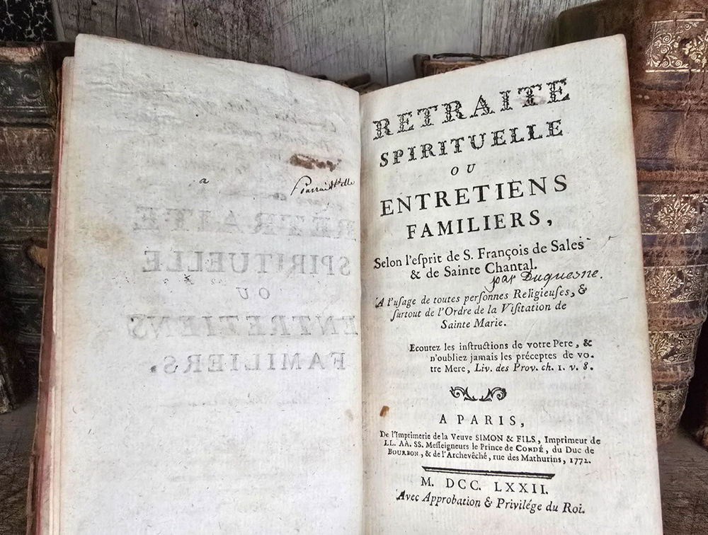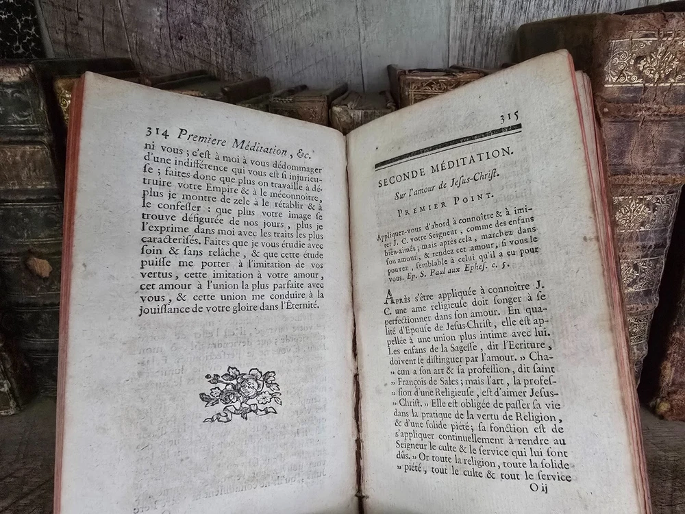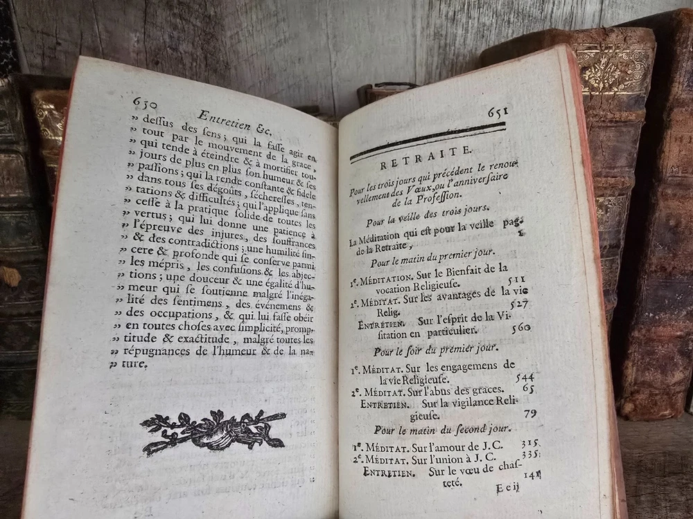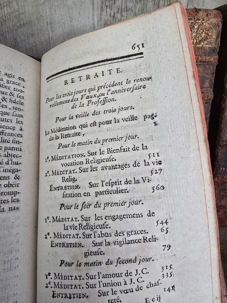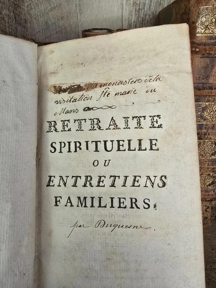 " SPIRITUAL RETREAT OR FAMILIAR CONVERSATIONS " The book titled "Retraite Spirituelle ou Entretiens Familiers" , authored by Duquesne , with an inscription linking it to the Monastery of the Visitation of Saint Mary in Le Mans . This is a structured guide for a ten-day religious retreat , designed especially for members of religious orders. It consists of a daily series of meditations and spiritual conversations , combining moral reflection , ascetic practices , and religious instruction , emphasizing self-examination, personal holiness, and commitment to religious vows. Table of Contents For the Eve of the Retreat Meditation on preparation for retreat Day 1 Meditation on Creation – p.8 Meditation on the End of Man – p.17 Meditation on the End of a Christian – p.20 Meditation on the End of the Religious State – p.28 Conversation Day 2 Meditation on Mortal Sin – p.39 Meditation on Venial Sin – p.51 Meditation on the Abuse of Graces – p.63 Meditation on Religious Vigilance – p.76 Day 3 Meditation on Death – p.95 Meditation on the Last Judgment – p.111 Meditation on Hell – p.126 Conversation on the Vow of Chastity – p.147 Day 4 Meditation on the Happiness of Heaven – p.171 Day 5 Meditation on Mortification – p.221 Meditation on the Cross and Interior Sufferings – p.238 Meditation on Abandonment to Divine Providence – p.255 Conversation on the Vow of Obedience – p.275 Day 6 Meditation on Knowledge of Jesus Christ – p.296 Meditation on the Love of Jesus Christ – p.315 Meditation on Union with Jesus Christ – p.334 Conversation on Prayer – p.355 Day 7 Meditation on the Divine Office – p.373 Meditation on the Interior Life – p.390 Meditation on Silence – p.408 Conversation on Exactness in Observances – p.422 Day 8 Meditation on Humility of Heart – p.448 Meditation on Gentleness of Spirit – p.466 Meditation on Cordiality – p.477 Conversation on Aversion to Particular Friendships – p.495 Day 9 Meditation on the Grace of Religious Vocation – p.511 Meditation on the Advantages of Religious Life – p.519 Meditation on Commitments of Religious Life – p.527 Conversation on the Spirit of the Visitation (Order) – p.544 Day 10 Meditation on Perseverance – p.560 Meditation on the Reception of the Sacraments – p.591 Meditation on Devotion to the Blessed Virgin – p.603 Conversation on Religious Perfection – p.611 Act for the Renewal of Vows – p.653 Summary This work serves as a manual for spiritual retreat , combining Jesuit-style meditative discipline with the Visitation Order’s gentler spirituality . Each day’s structured meditations invite the retreatant to reflect on foundational Christian themes (sin, judgment, paradise), the inner life (mortification, humility, prayer), and the vows and responsibilities of religious life . The “Entretiens” (familiar conversations) offer more accessible reflections or practical applications, likely designed to be read aloud or discussed within a community. The final section focuses on recommitting one’s soul to religious vows, culminating in an act of renewal , making this a deeply devotional and transformative spiritual tool. Pages: 670 Size: 6.4" x 4" x 1.4" See other $0.99 items