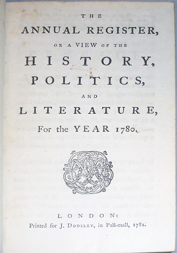 This week, we will be listing a Wonderful Collection of Antiquarian Books and Historical Memorabilia, including numerous Annual Register volumes. Please, check out our other items to save of shipping. Good Luck! This is a Great, Rare, Early "The Annual Register, or A View of The History, Politics, and Literature, For The Year 1780 " book . This wonderful Old piece has a Great, Early design, with a Gold Gilt embossed Leather binding, is Loaded with 500+ pages of Historical information & the News of the day, is an Original, Antique piece and Rare to Find. This includes: American Revolution : General George Washington Rhode Island Evacuated General Henry Clinton Defeat at Savannah, Georgia Comte d'Estaing Siege of Charles Town (Charleston, South Carolina) Sullivan's Island Colonel Tarletan Lord Cornwallis Fort Moultrie Rebel Cavalry Lady Harriet Acland Loyalists Insurrection in North Carolina General Horatio Gates Major Andre Battle of Camden Benedict Arnold's Letter to American Officer's After Switching Sides! US-Holland Treaty President Henry Laurens Benjamin Franklin And Lots More! This appears to be in Nice, Tight condition. #6718 - 3 Payment is expected within 7 days of purchase. Thanks