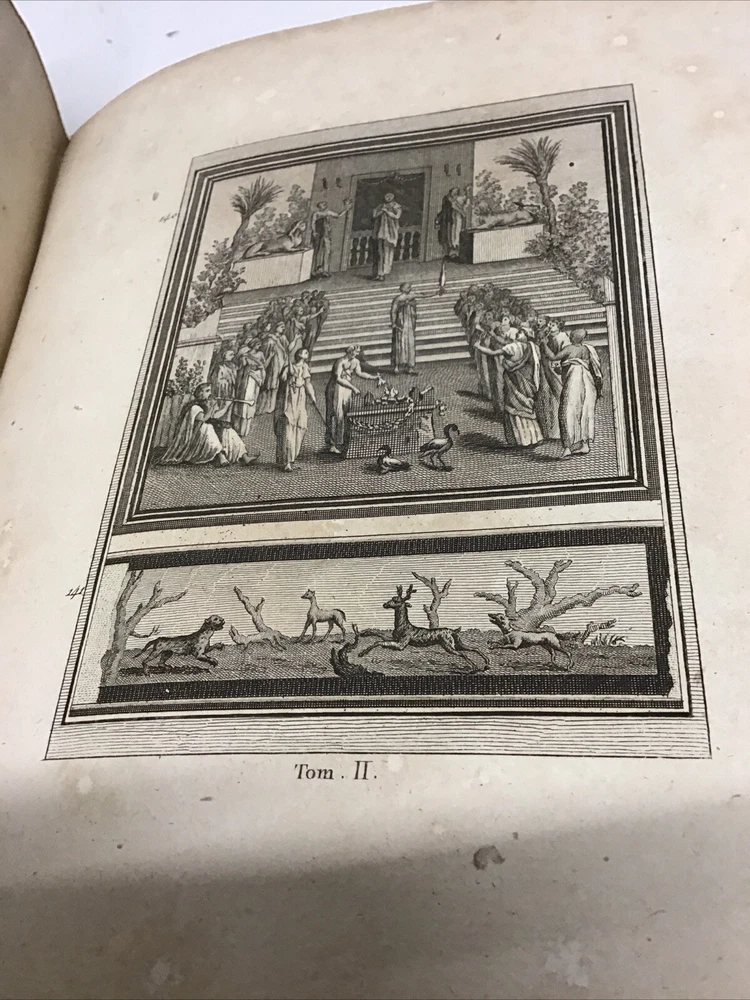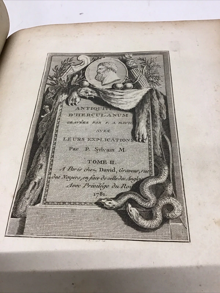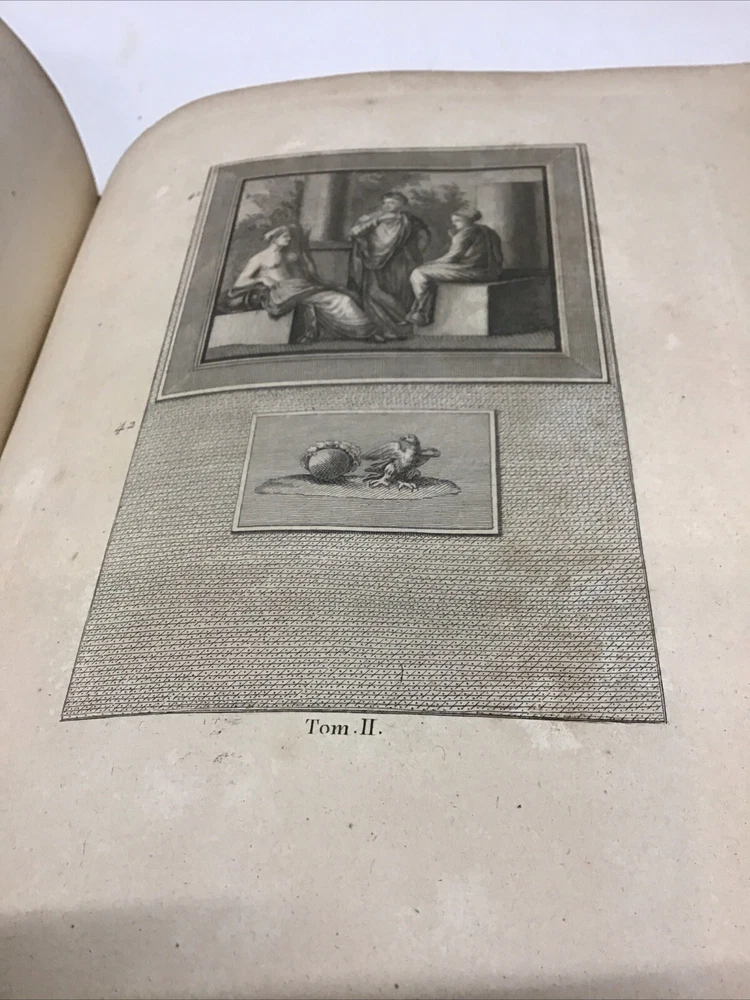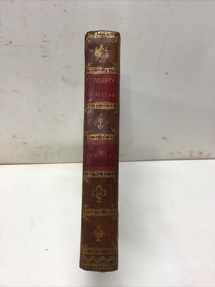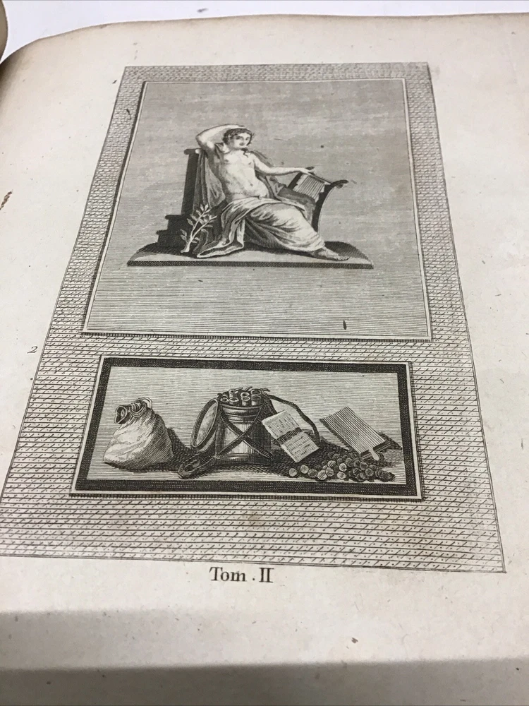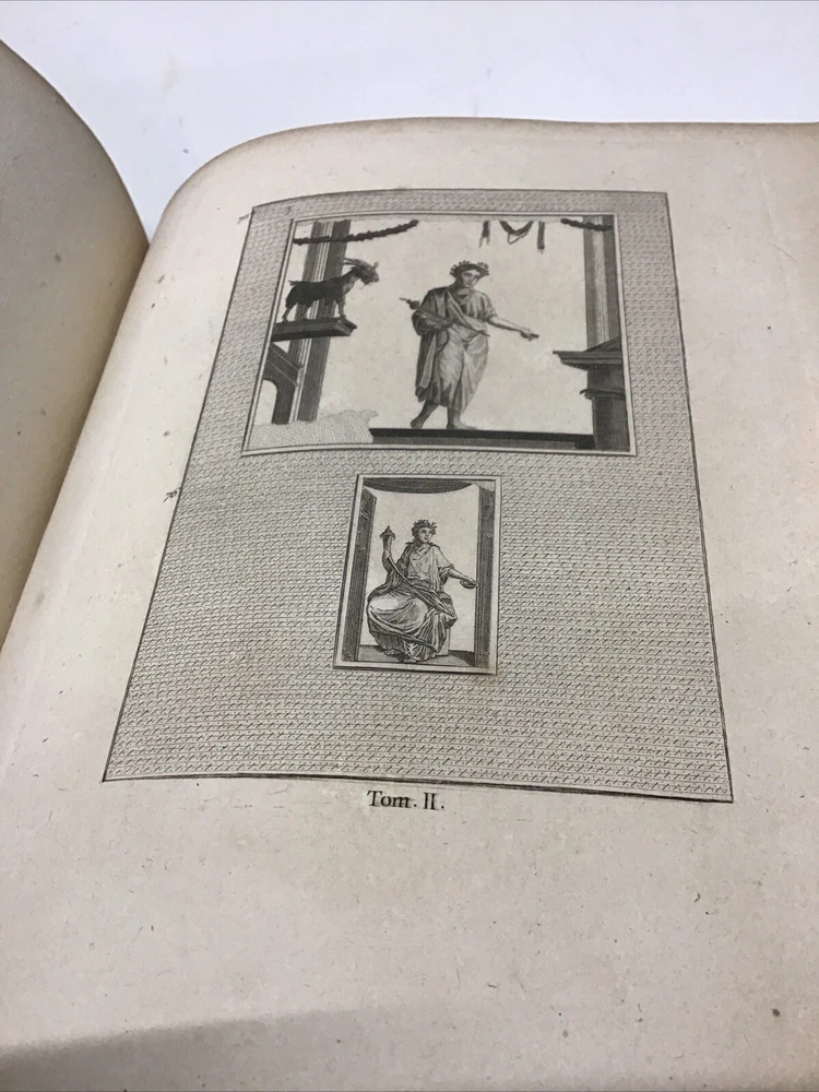 L'ouvrage présente les magnifiques peintures antiques, marbres, bronzes, meubles et autres objets découverts lors des fouilles d'Herculanum, Stabia et Pompéi. Graveur : Les gravures ont été réalisées par F. A. David. Auteur : Les explications accompagnant les gravures ont été rédigées par P. S. Marechal. Éditeur : Le livre a été publié à Paris en 1780 par l'auteur, F. A. David, situé au 13 rue Pierre-Sarrazin. 1780 Antiquités d'Herculanum, Excavations Herculaneum,Stabia,Pompeii Vol. 2 - 72 Plates Size 8.1/8” x 10” 212 pages then 72 engraving plates. Has wear to cover and pages have some discoloration as seen in pictures. Has some separation of cover but intact being 240+ years old. The book showcases the beautiful antique paintings, marbles, bronzes, furniture, and other artifacts discovered in the excavations of Herculaneum, Stabia, and Pompeii. Engraver: The engravings were done by F. A. David. Author: The explanations accompanying the engravings were written by P. S. Marechal. Publisher: The book was published in Paris in 1780 by the author, F. A. David, located at 13 rue Pierre-Sarrazin. Bookplate of an engraving of a coat of arms, likely dating back to the 18th century. The text "I.C. Berndt del. et Sculp. Francoff." indicates that the engraving was designed and sculpted by Johann Christoph Berndt in Frankfurt, Germany. See our other volumes of Antiquités d'Herculanum Keep in mind the shipping price also covers handling fees, packaging materials & time, not just postage. See our eBay store for thousands of our other items. B12C