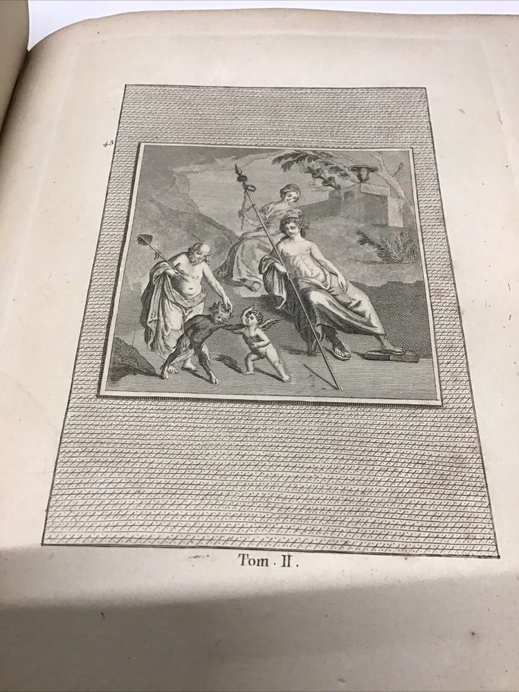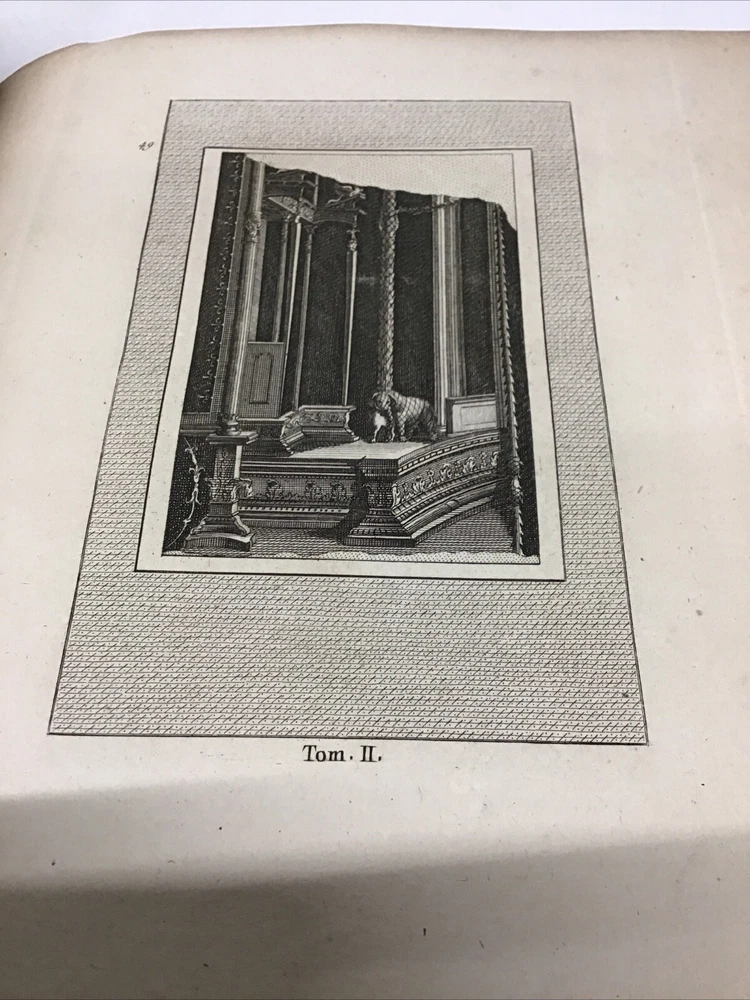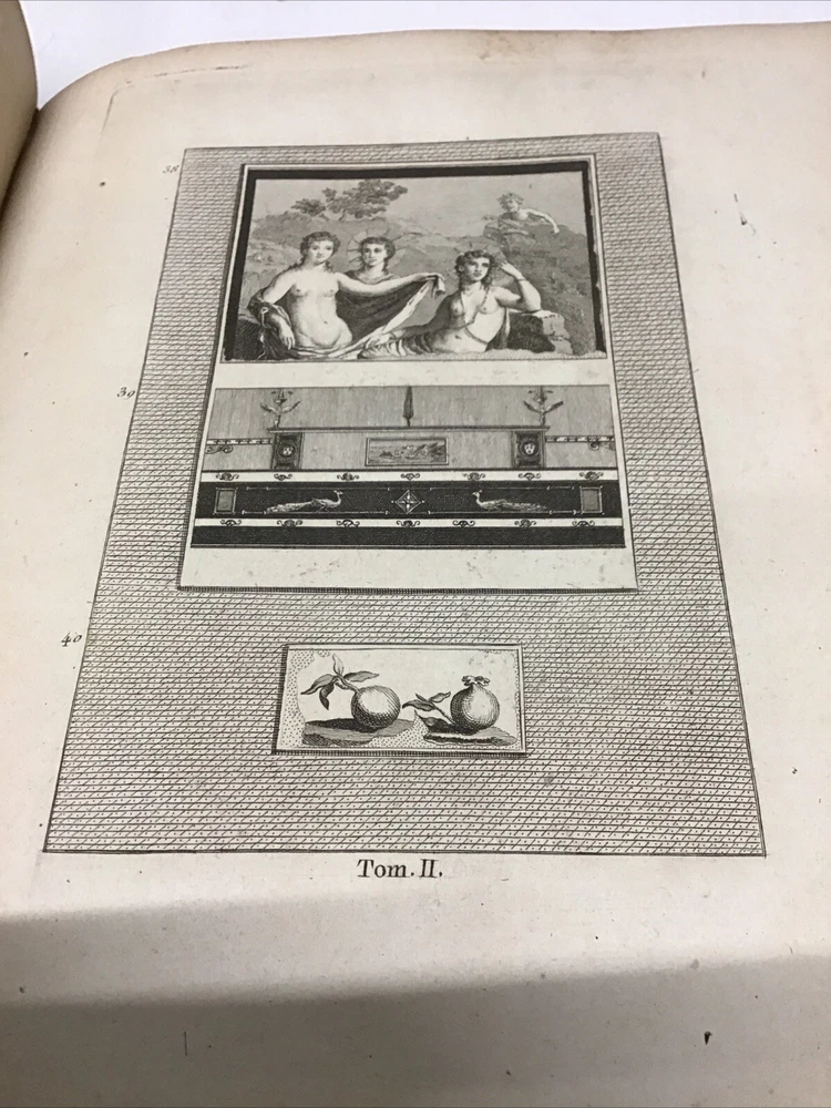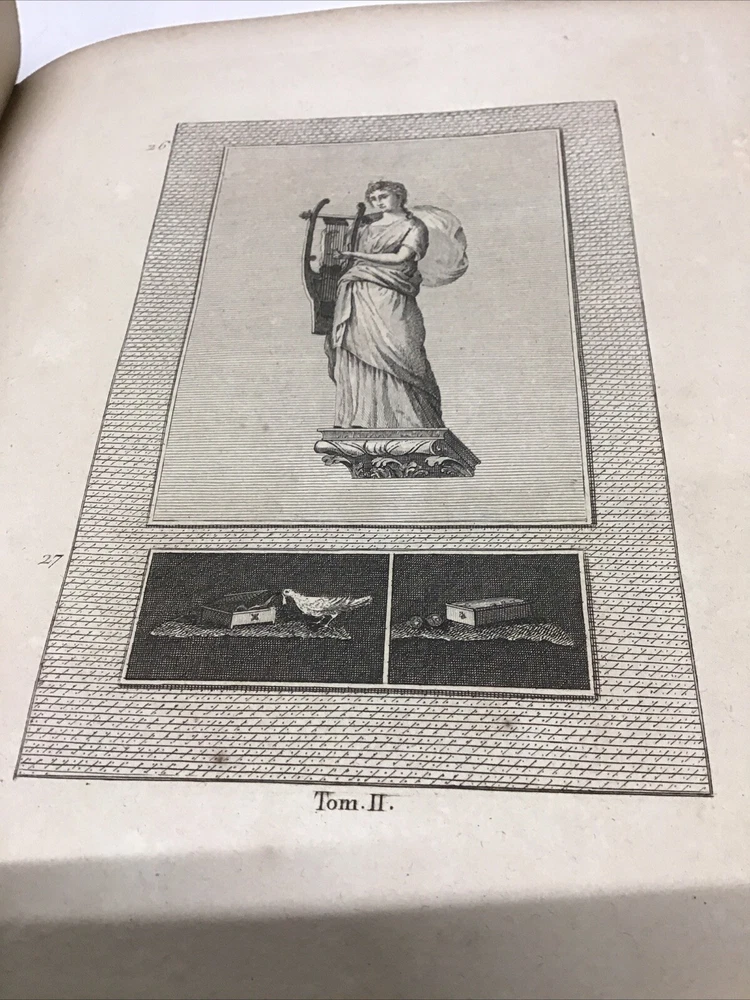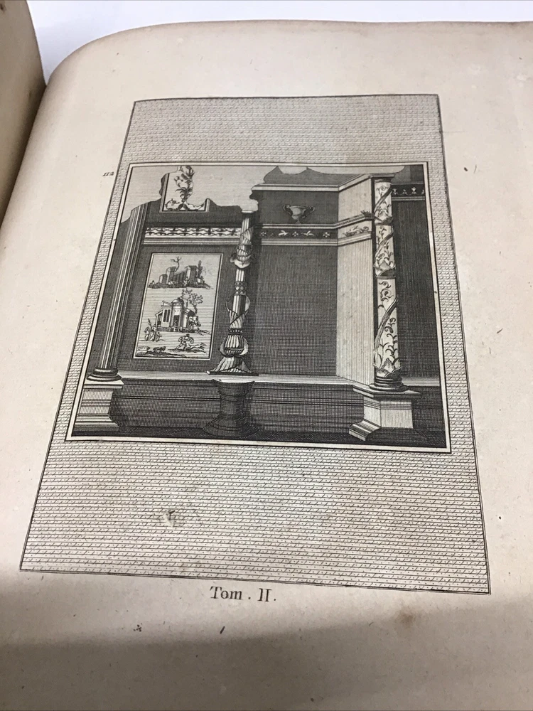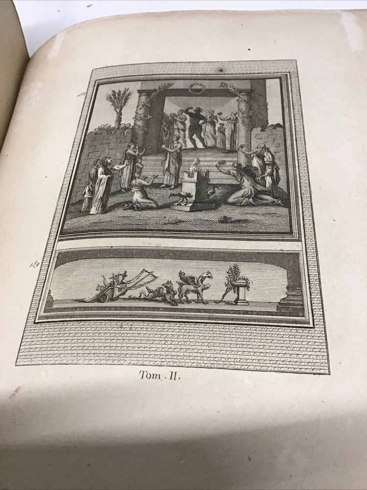 L'ouvrage présente les magnifiques peintures antiques, marbres, bronzes, meubles et autres objets découverts lors des fouilles d'Herculanum, Stabia et Pompéi. Graveur : Les gravures ont été réalisées par F. A. David. Auteur : Les explications accompagnant les gravures ont été rédigées par P. S. Marechal. Éditeur : Le livre a été publié à Paris en 1780 par l'auteur, F. A. David, situé au 13 rue Pierre-Sarrazin. 1780 Antiquités d'Herculanum, Excavations Herculaneum,Stabia,Pompeii Vol. 2 - 72 Plates Size 8.1/8” x 10” 212 pages then 72 engraving plates. Has wear to cover and pages have some discoloration as seen in pictures. Has some separation of cover but intact being 240+ years old. The book showcases the beautiful antique paintings, marbles, bronzes, furniture, and other artifacts discovered in the excavations of Herculaneum, Stabia, and Pompeii. Engraver: The engravings were done by F. A. David. Author: The explanations accompanying the engravings were written by P. S. Marechal. Publisher: The book was published in Paris in 1780 by the author, F. A. David, located at 13 rue Pierre-Sarrazin. Bookplate of an engraving of a coat of arms, likely dating back to the 18th century. The text "I.C. Berndt del. et Sculp. Francoff." indicates that the engraving was designed and sculpted by Johann Christoph Berndt in Frankfurt, Germany. See our other volumes of Antiquités d'Herculanum Keep in mind the shipping price also covers handling fees, packaging materials & time, not just postage. See our eBay store for thousands of our other items. B12C