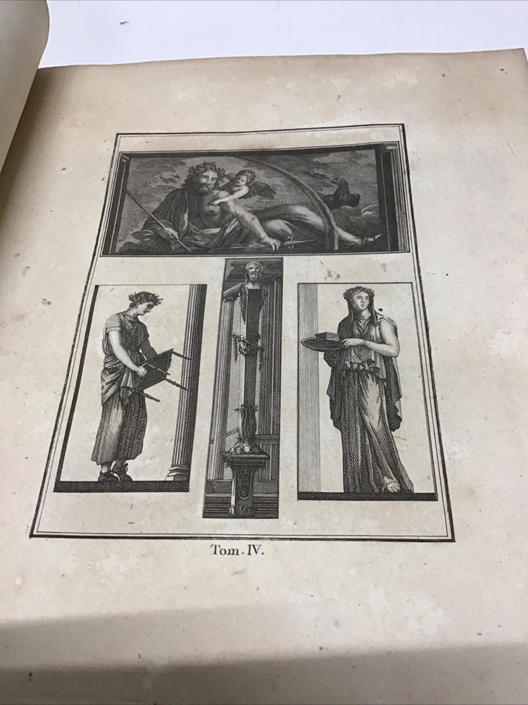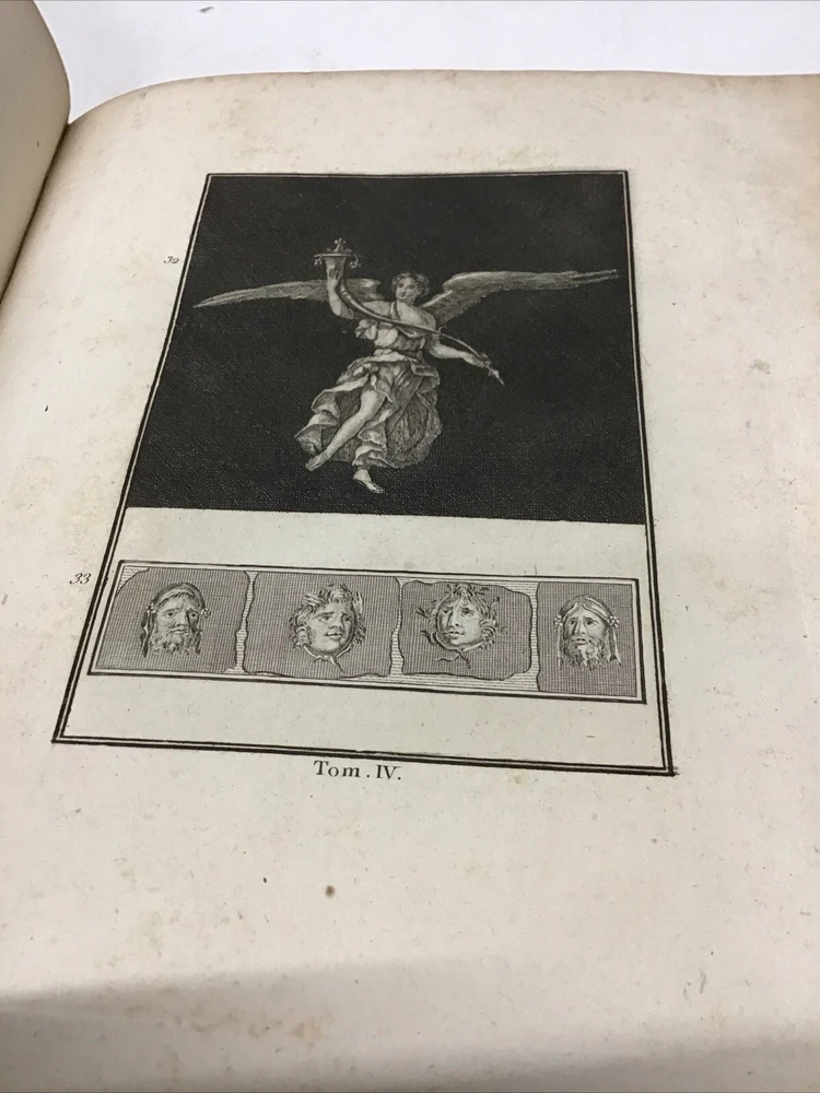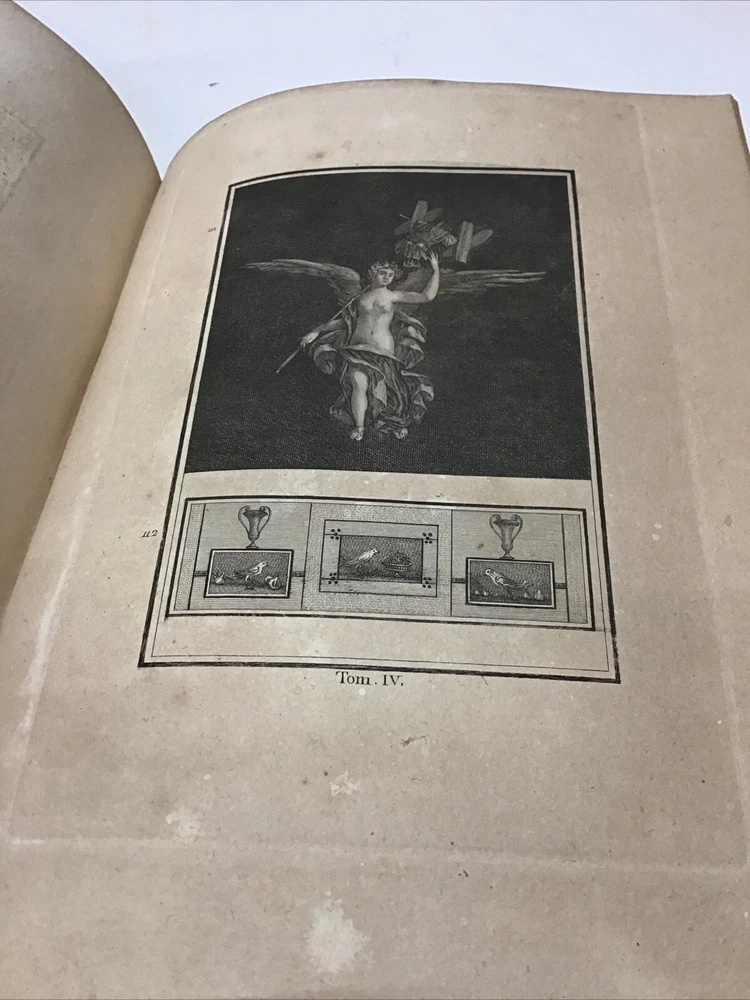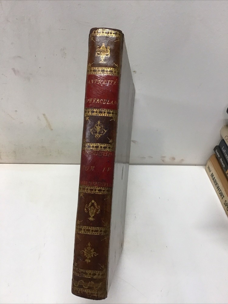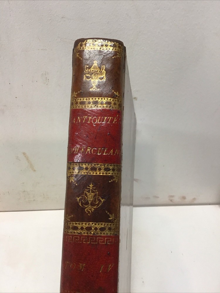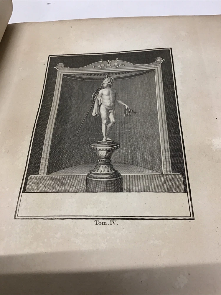 L'ouvrage présente les magnifiques peintures antiques, marbres, bronzes, meubles et autres objets découverts lors des fouilles d'Herculanum, Stabia et Pompéi. Graveur : Les gravures ont été réalisées par F. A. David. Auteur : Les explications accompagnant les gravures ont été rédigées par P. S. Marechal. Éditeur : Le livre a été publié à Paris en 1780 par l'auteur, F. A. David, situé au 13 rue Pierre-Sarrazin. 1780 Antiquités d'Herculanum, Excavations Herculaneum,Stabia,Pompeii Vol. 4 - 72 Plates Size 8.1/8” x 10” 116 pages then 72 engraving plates. Has wear to cover and pages have some discoloration as seen in pictures. In excellent condition being 240+ years old. The book showcases the beautiful antique paintings, marbles, bronzes, furniture, and other artifacts discovered in the excavations of Herculaneum, Stabia, and Pompeii. Engraver: The engravings were done by F. A. David. Author: The explanations accompanying the engravings were written by P. S. Marechal. Publisher: The book was published in Paris in 1780 by the author, F. A. David, located at 13 rue Pierre-Sarrazin. Bookplate of an engraving of a coat of arms, likely dating back to the 18th century. The text "I.C. Berndt del. et Sculp. Francoff." indicates that the engraving was designed and sculpted by Johann Christoph Berndt in Frankfurt, Germany. See our other volumes of Antiquités d'Herculanum Keep in mind the shipping price also covers handling fees, packaging materials & time, not just postage. See our eBay store for thousands of our other items. B12C