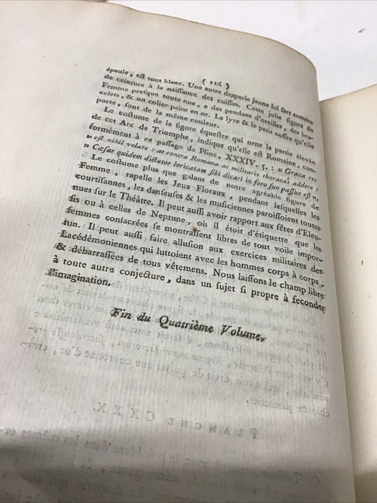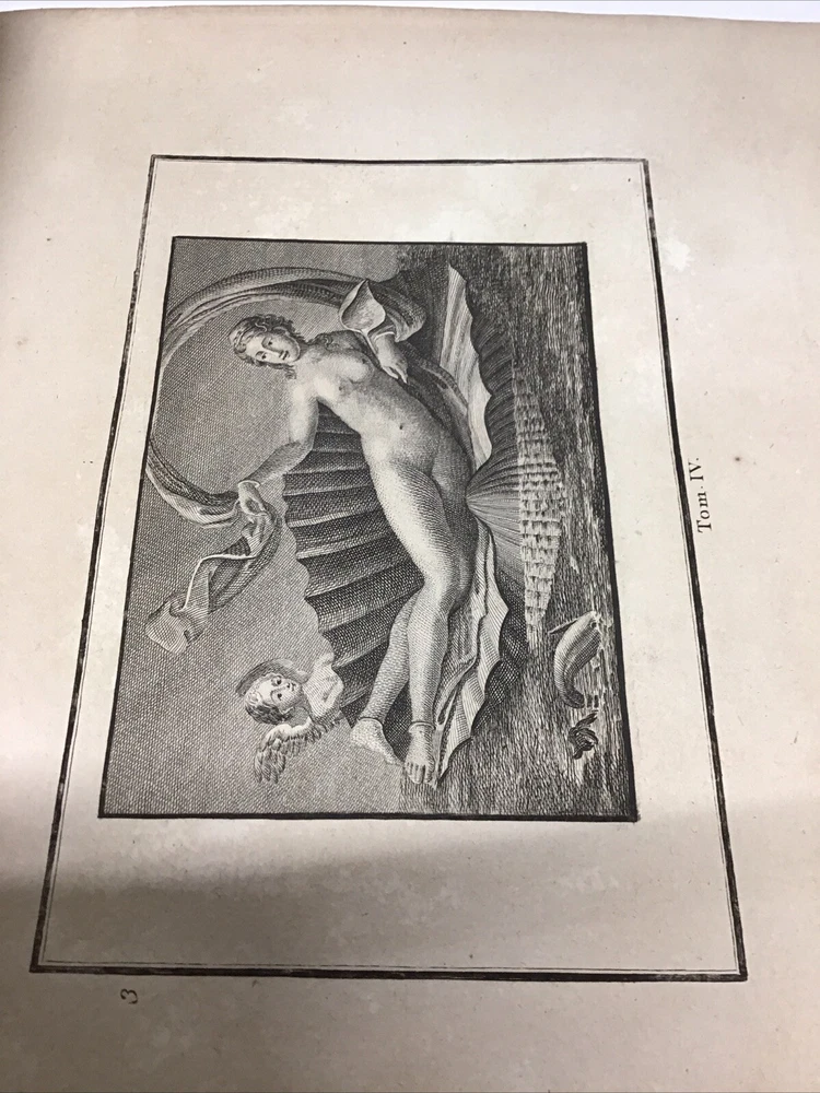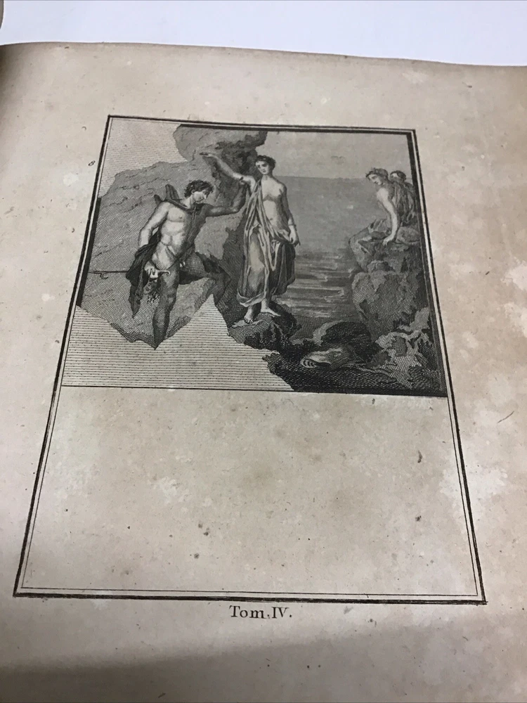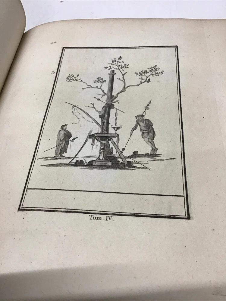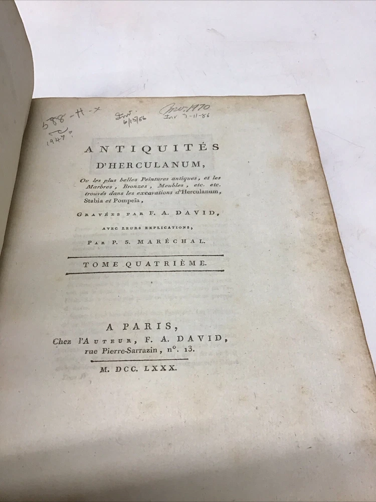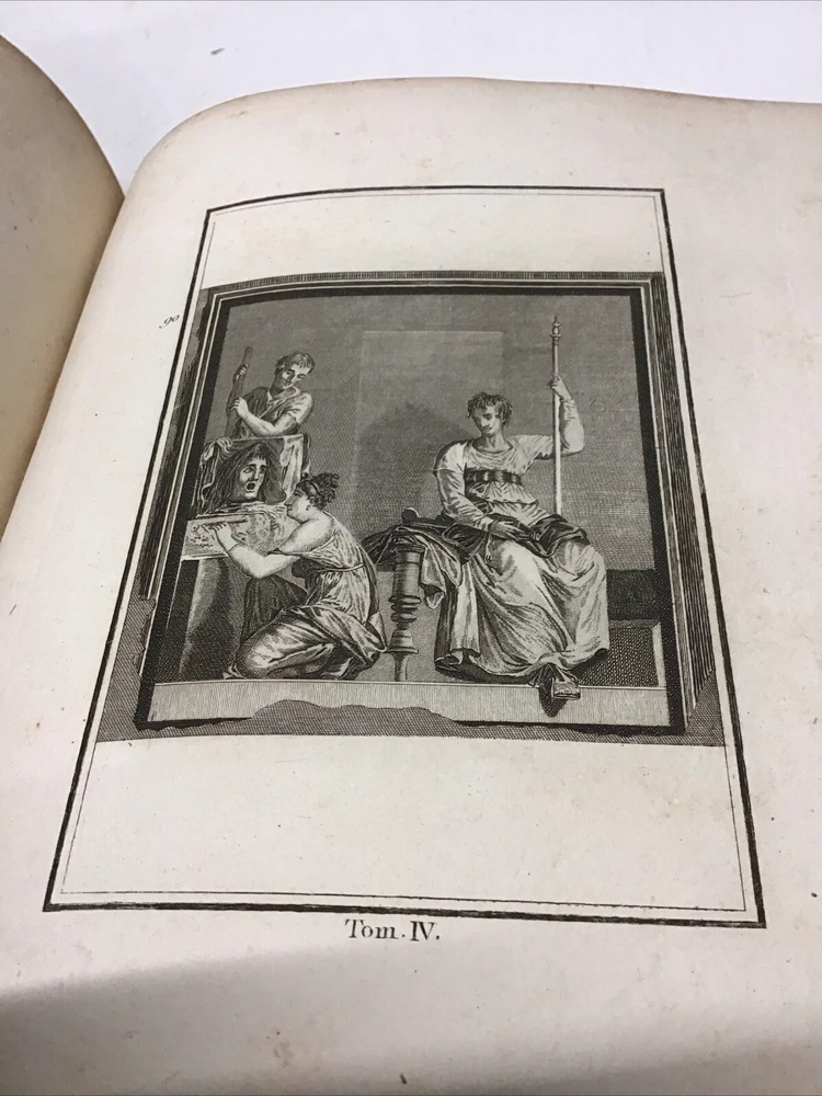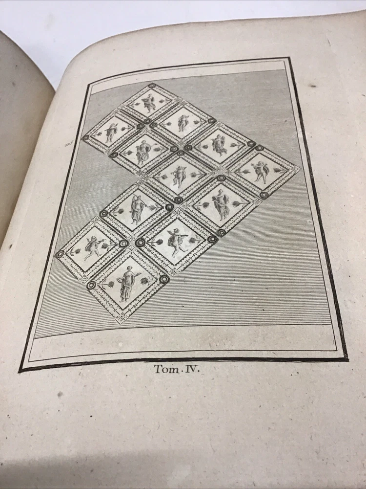 L'ouvrage présente les magnifiques peintures antiques, marbres, bronzes, meubles et autres objets découverts lors des fouilles d'Herculanum, Stabia et Pompéi. Graveur : Les gravures ont été réalisées par F. A. David. Auteur : Les explications accompagnant les gravures ont été rédigées par P. S. Marechal. Éditeur : Le livre a été publié à Paris en 1780 par l'auteur, F. A. David, situé au 13 rue Pierre-Sarrazin. 1780 Antiquités d'Herculanum, Excavations Herculaneum,Stabia,Pompeii Vol. 4 - 72 Plates Size 8.1/8” x 10” 116 pages then 72 engraving plates. Has wear to cover and pages have some discoloration as seen in pictures. In excellent condition being 240+ years old. The book showcases the beautiful antique paintings, marbles, bronzes, furniture, and other artifacts discovered in the excavations of Herculaneum, Stabia, and Pompeii. Engraver: The engravings were done by F. A. David. Author: The explanations accompanying the engravings were written by P. S. Marechal. Publisher: The book was published in Paris in 1780 by the author, F. A. David, located at 13 rue Pierre-Sarrazin. Bookplate of an engraving of a coat of arms, likely dating back to the 18th century. The text "I.C. Berndt del. et Sculp. Francoff." indicates that the engraving was designed and sculpted by Johann Christoph Berndt in Frankfurt, Germany. See our other volumes of Antiquités d'Herculanum Keep in mind the shipping price also covers handling fees, packaging materials & time, not just postage. See our eBay store for thousands of our other items. B12C