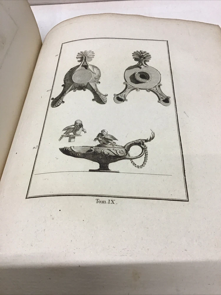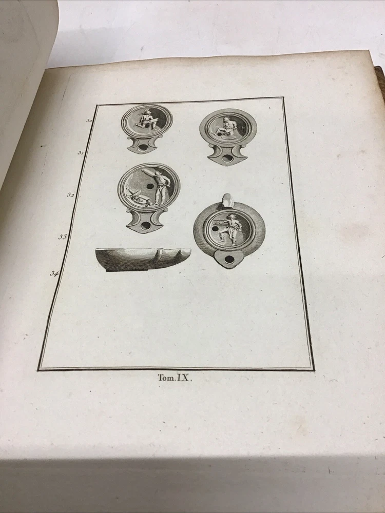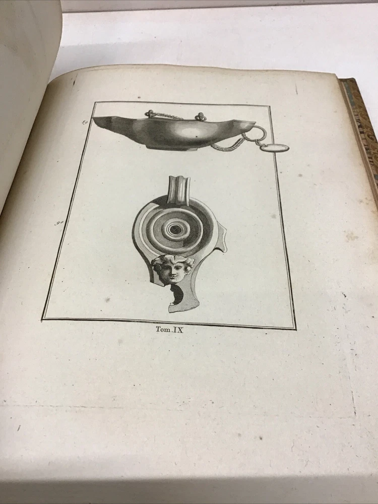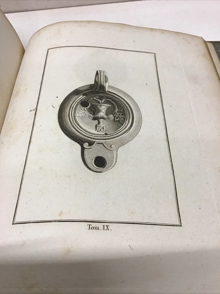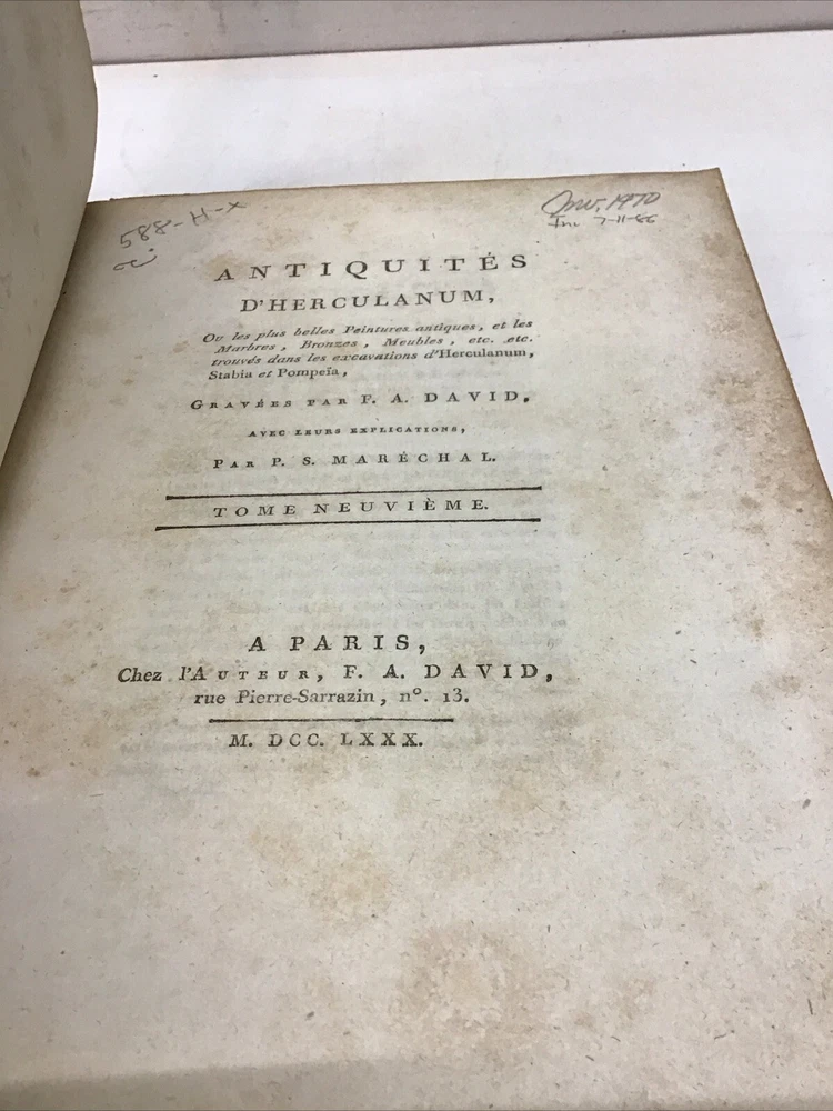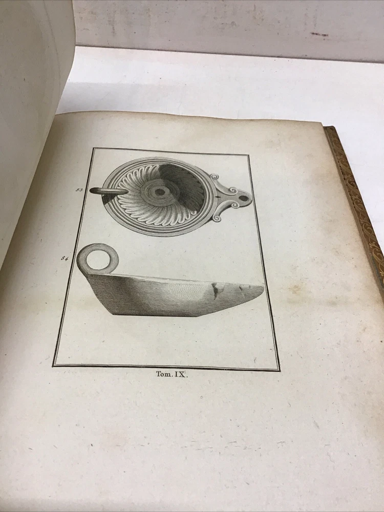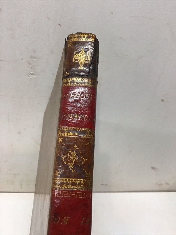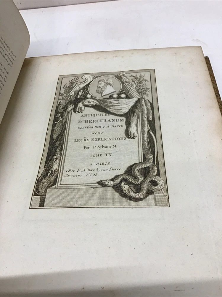 L'ouvrage présente les magnifiques peintures antiques, marbres, bronzes, meubles et autres objets découverts lors des fouilles d'Herculanum, Stabia et Pompéi. Graveur : Les gravures ont été réalisées par F. A. David. Auteur : Les explications accompagnant les gravures ont été rédigées par P. S. Marechal. Éditeur : Le livre a été publié à Paris en 1780 par l'auteur, F. A. David, situé au 13 rue Pierre-Sarrazin. 1780 Antiquités d'Herculanum, Excavations Herculaneum,Stabia,Pompeii Vol. 9- 44 Plates Size 8.1/8” x 10” 103 pages then 44 engraving plates. Has wear to cover and pages have some discoloration as seen in pictures. In excellent condition being 240+ years old. The book showcases the beautiful antique paintings, marbles, bronzes, furniture, and other artifacts discovered in the excavations of Herculaneum, Stabia, and Pompeii. Engraver: The engravings were done by F. A. David. Author: The explanations accompanying the engravings were written by P. S. Marechal. Publisher: The book was published in Paris in 1780 by the author, F. A. David, located at 13 rue Pierre-Sarrazin. Bookplate of an engraving of a coat of arms, likely dating back to the 18th century. The text "I.C. Berndt del. et Sculp. Francoff." indicates that the engraving was designed and sculpted by Johann Christoph Berndt in Frankfurt, Germany. See our other volumes of Antiquités d'Herculanum Keep in mind the shipping price also covers handling fees, packaging materials & time, not just postage. See our eBay store for thousands of our other items. B12C