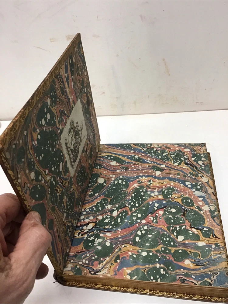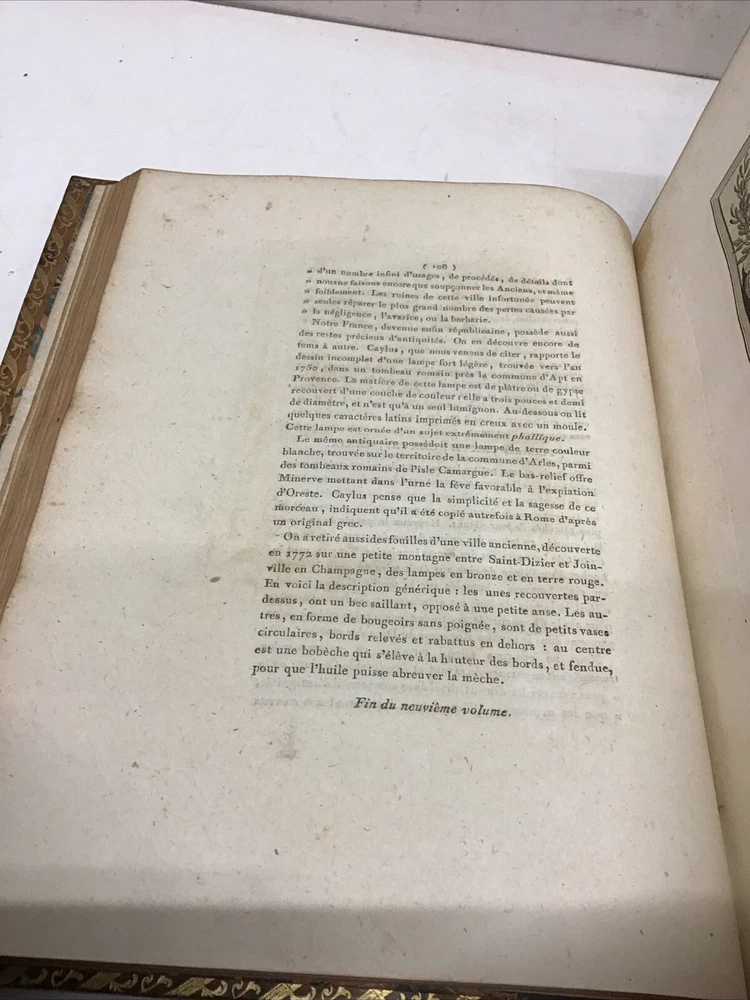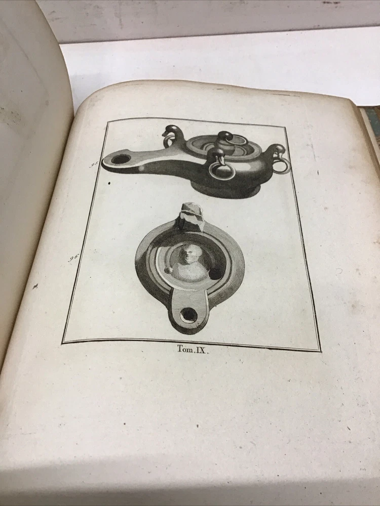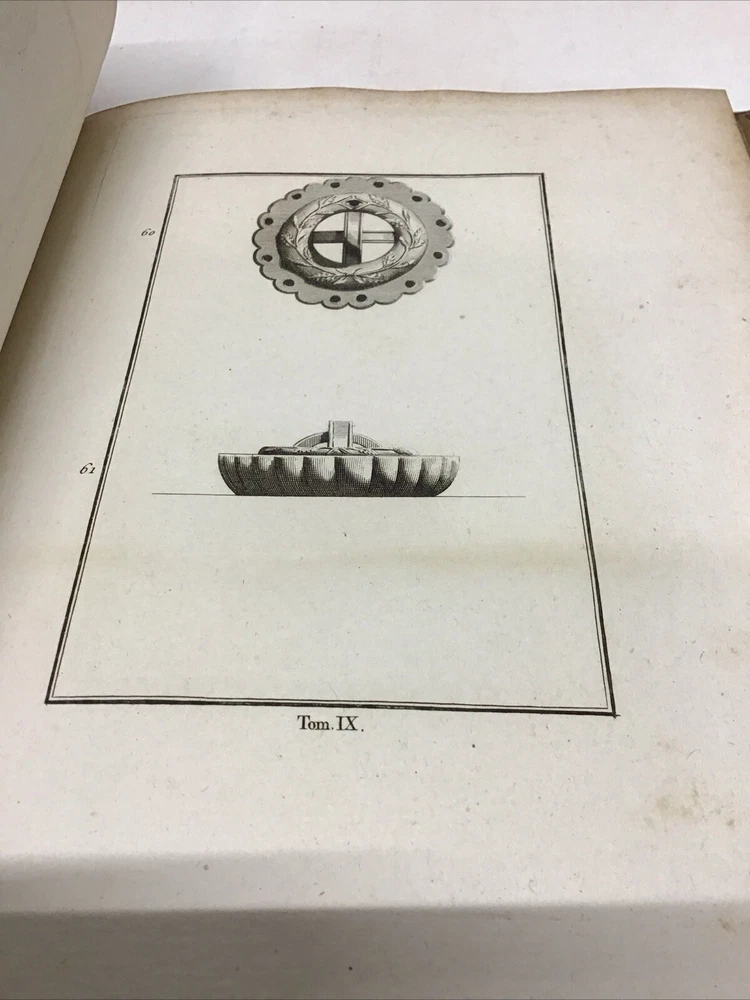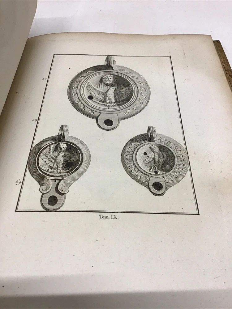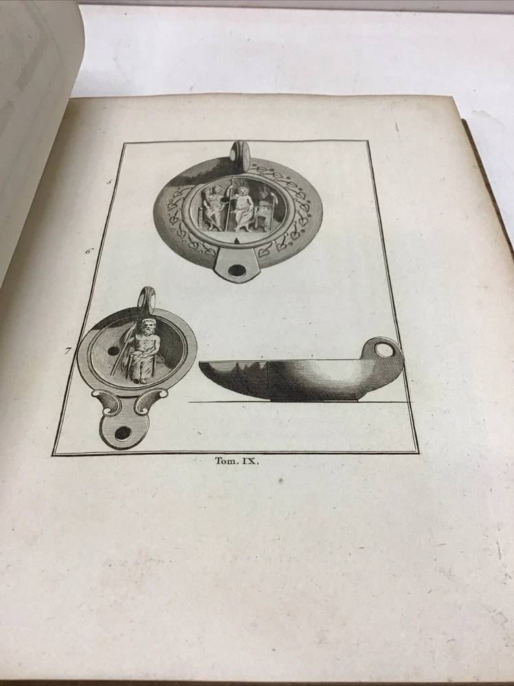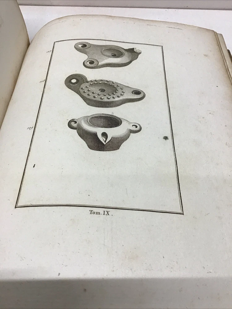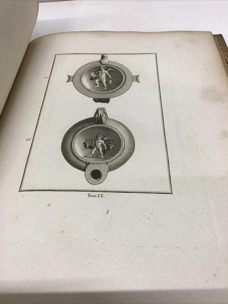 L'ouvrage présente les magnifiques peintures antiques, marbres, bronzes, meubles et autres objets découverts lors des fouilles d'Herculanum, Stabia et Pompéi. Graveur : Les gravures ont été réalisées par F. A. David. Auteur : Les explications accompagnant les gravures ont été rédigées par P. S. Marechal. Éditeur : Le livre a été publié à Paris en 1780 par l'auteur, F. A. David, situé au 13 rue Pierre-Sarrazin. 1780 Antiquités d'Herculanum, Excavations Herculaneum,Stabia,Pompeii Vol. 9- 44 Plates Size 8.1/8” x 10” 103 pages then 44 engraving plates. Has wear to cover and pages have some discoloration as seen in pictures. In excellent condition being 240+ years old. The book showcases the beautiful antique paintings, marbles, bronzes, furniture, and other artifacts discovered in the excavations of Herculaneum, Stabia, and Pompeii. Engraver: The engravings were done by F. A. David. Author: The explanations accompanying the engravings were written by P. S. Marechal. Publisher: The book was published in Paris in 1780 by the author, F. A. David, located at 13 rue Pierre-Sarrazin. Bookplate of an engraving of a coat of arms, likely dating back to the 18th century. The text "I.C. Berndt del. et Sculp. Francoff." indicates that the engraving was designed and sculpted by Johann Christoph Berndt in Frankfurt, Germany. See our other volumes of Antiquités d'Herculanum Keep in mind the shipping price also covers handling fees, packaging materials & time, not just postage. See our eBay store for thousands of our other items. B12C