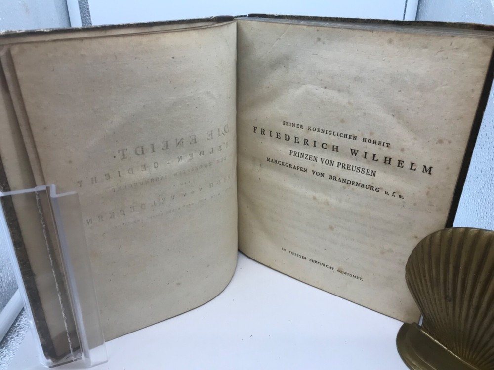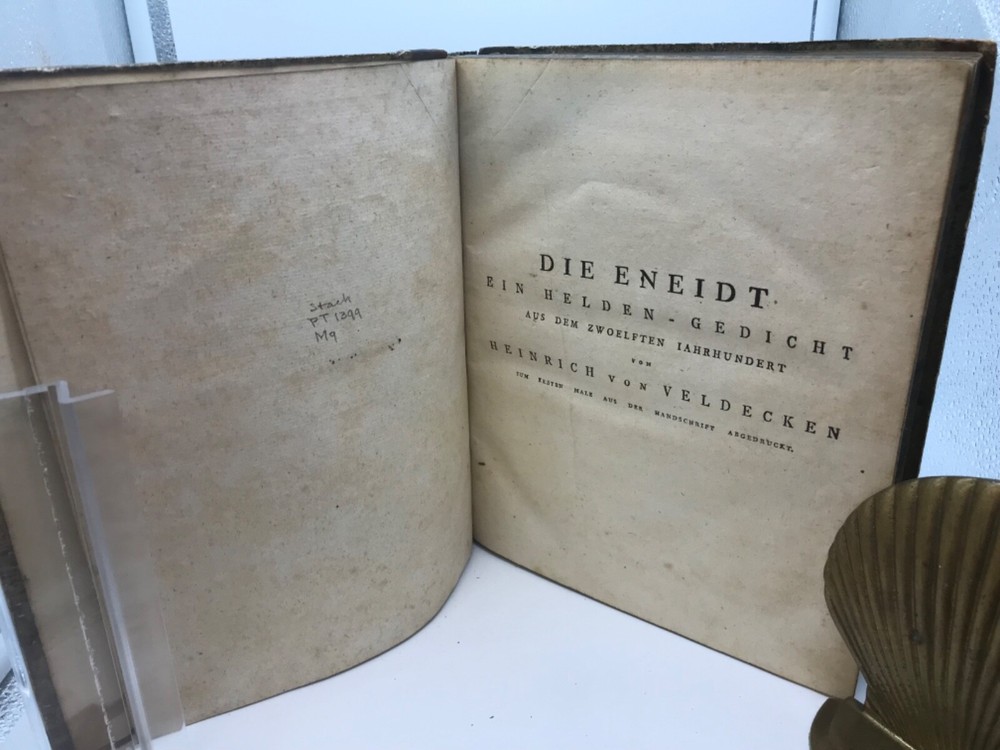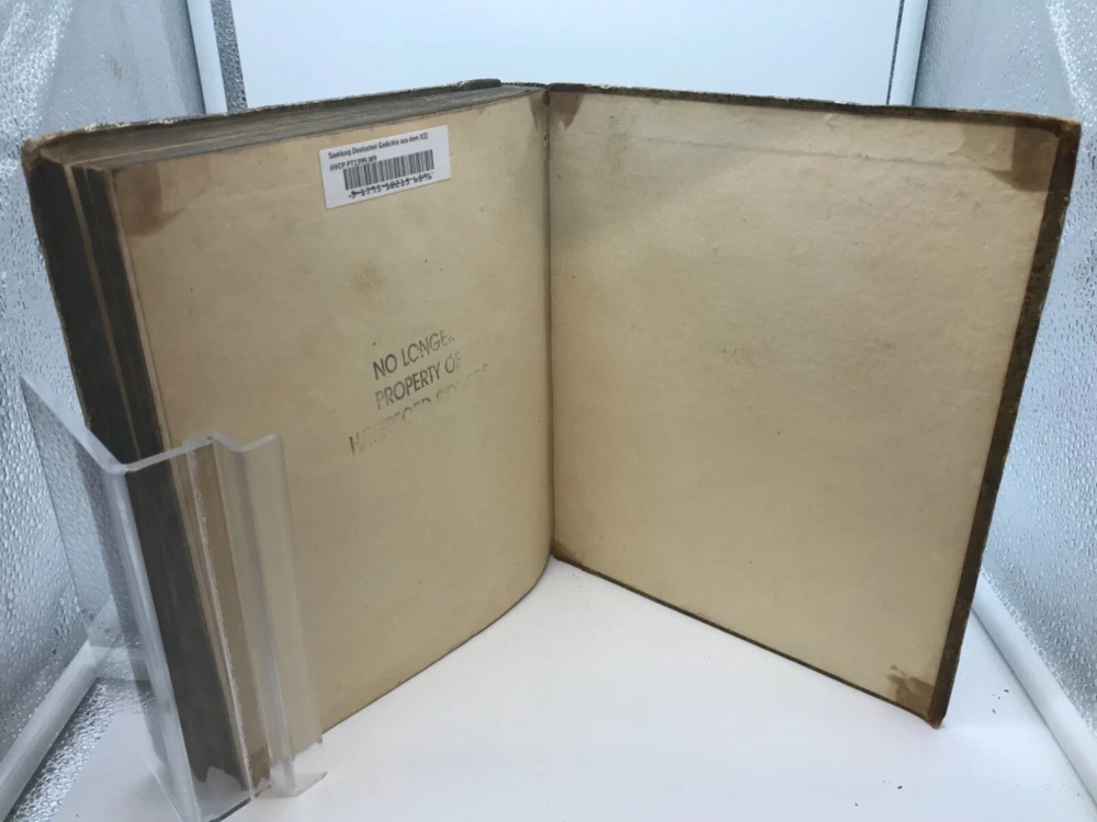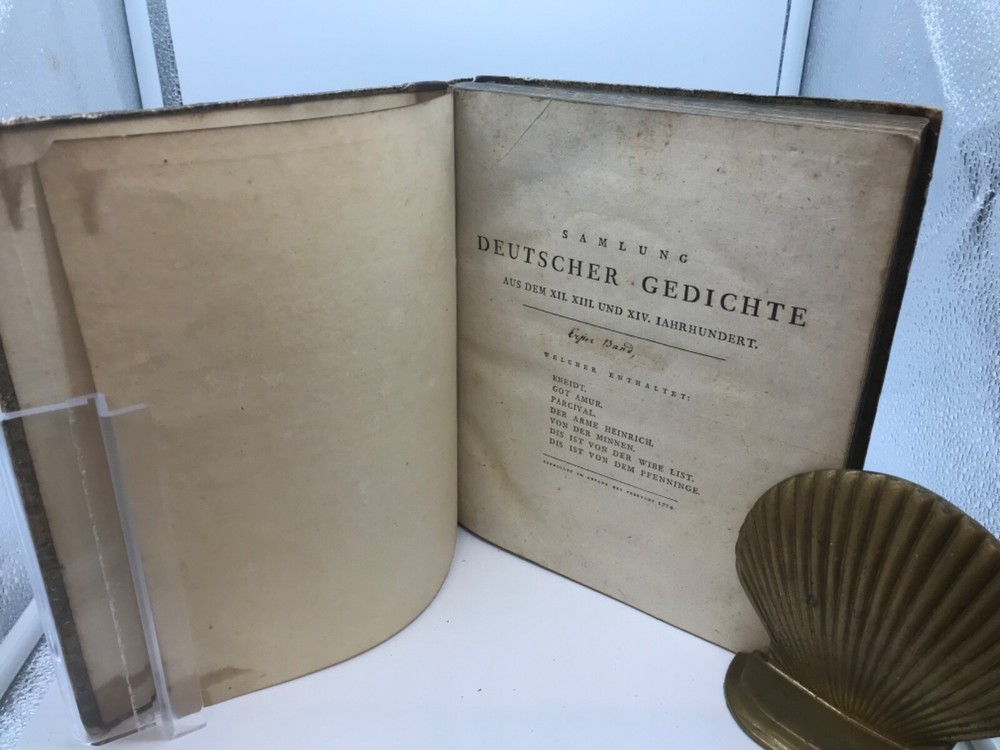 Samlung Deutscher Gedichte Aus Dem XII, XIII, Und XIV Jahrundert - Collection of German Poems from the XII, XIII, and XIV Centuries. Printed by Christopher Heinrich Müller at the Royal Gymnasium in Berlin. 1784, 216 pp, 9.75 x 8.25, 3/4 leather, 8vo. In fair condition, with both boards securely attached. Minor rubbing to edges of boards and leather corners. Most of the wear is concentrated within the spine, which is without the top and bottom thirds of leather. Hinges are in good condition and book is perfectly readable. Pages are decorated with marbled edges. Markings include an 1889 bookplate from the Gustav Bauer Library at Haverford College, a small marking to the first flyleaf, a signature on the title page, and a modern library barcode and discard stamping on the back flyleaf. Minimal toning to pages and text block free of marginalia. Please see photos. A unique book, containing 7 different early German poems. Includes a dedication to Frederick the Great of Prussia. FORN-ABE-MSB-0821-Shelf-574-aj026