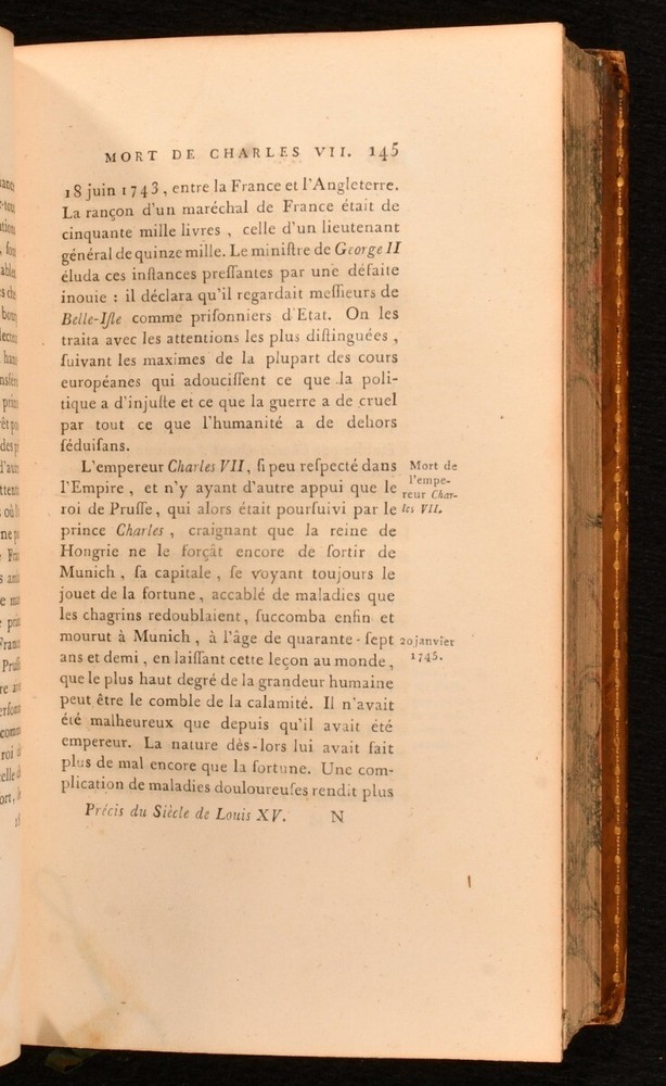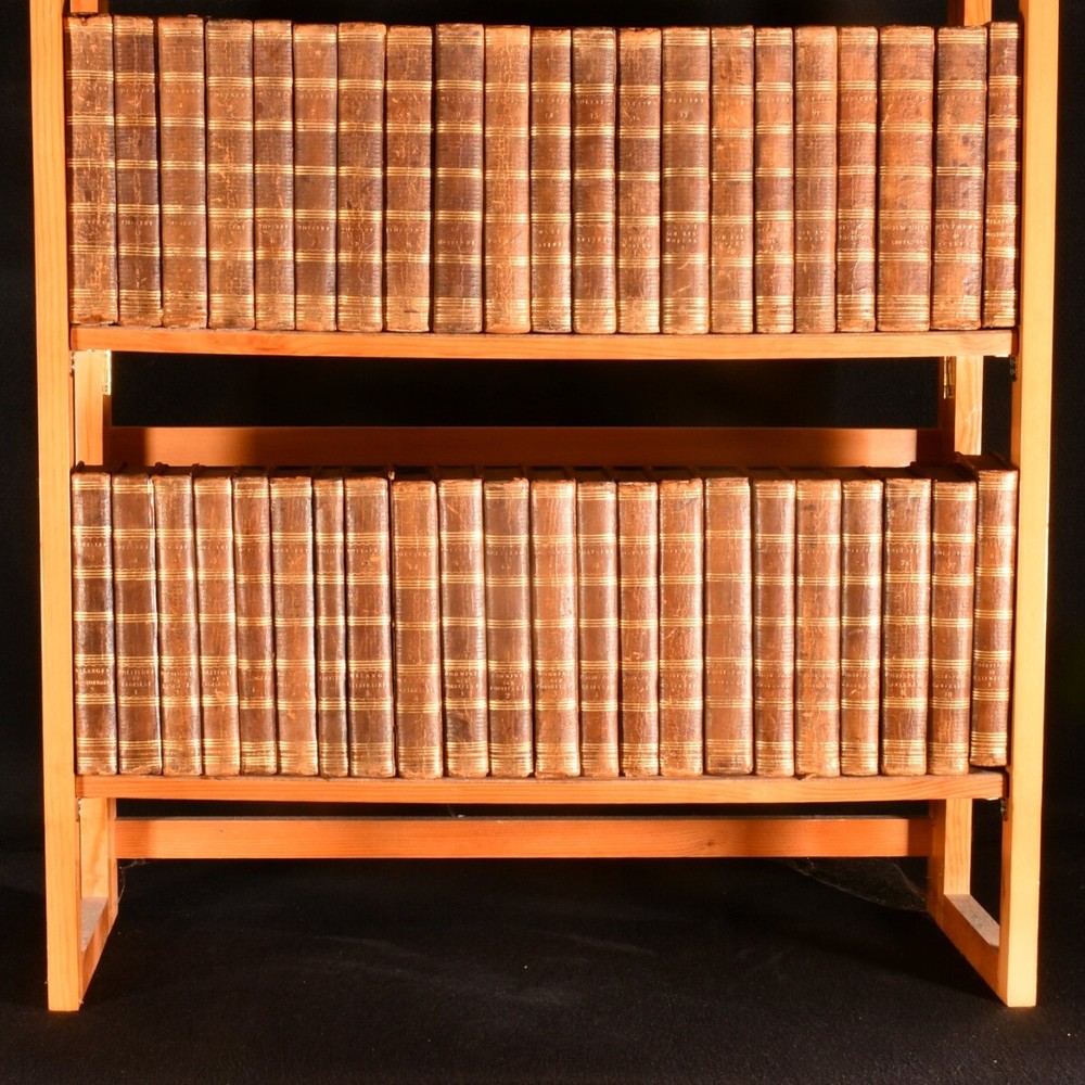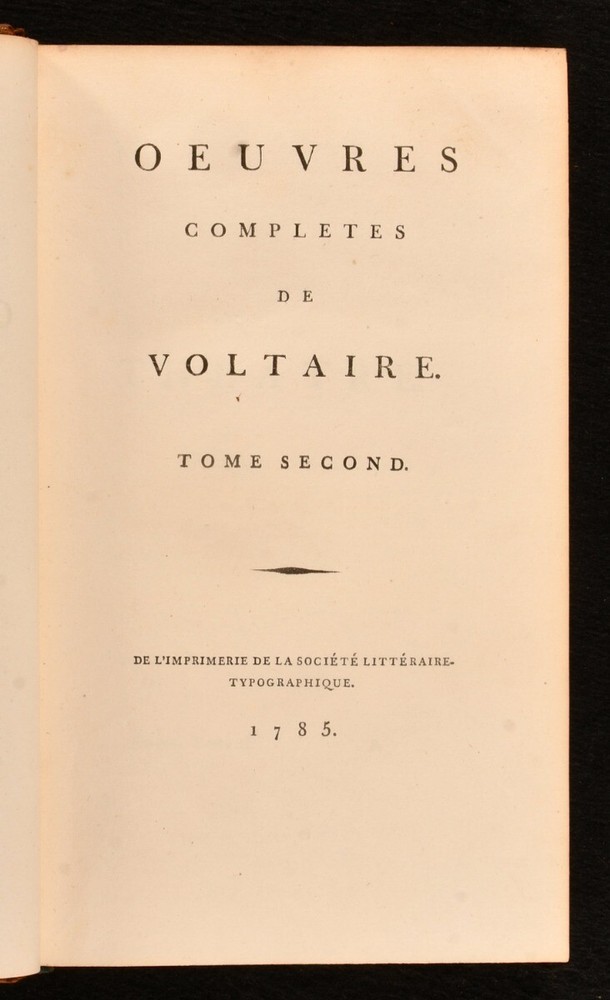 Click here to see our other books! Oeuvres Completes de Voltaire Voltaire [François-Marie Arouet] 1785 De l'Impremerie de la Societe Litteraire Typographique : Paris 8" by 5" - SUMMARY Forty three leather bound volumes from the Complete Works of Voltaire. Illustrated,Leather Binding Overall Condition: Fair This book weighs 30 KG when packed UK Postage: £ 4.49 US Postage: £ 99.99 EU Postage : £ 49.99 European Postage: £ 99.99 Asia Postage: £ 187.99 Worldwide Postage: £ 276.99 DESCRIPTION 43 volumes from the complete works of Voltaire. Published in French. The present collection of the French philosopher's works includes volumes 2-10, 12, 14-17, 20-23, 25, 27, 32-35, 37, 45, 51, 60, 63-69, 70-77, and 89. With four plates to volumes two, three, and six. With three plates to volume four. With seven plates to volumes five and nine. With nine plates to volume eight. With ten plates to volume nine. With five plates to volume ten. The present collection opens with the theatrical works of Voltaire, which is followed by his poetry, including his epic poem the Henriade. In his Essay on the Universal History, Manners, and Spirit of Nations, Voltaire discusses the history of Europe before Charlemagne until the age of Louis XIV. This is followed by his History of the Russian Empire Under Peter the Great, his writings on politics and legislation, some miscellaneous literary criticism, and his commentary on the dramatic works of Pierre Corneille. The latter volumes are comprised of Voltaire's letter exchanges. Voltaire was a French Enlightenment writer, philosopher, and historian famed for his wit, his criticism of Christianity and slavery, and advocation of the separation of the church and state. The versatile and prolific writer produced works in many literary forms, including plays, novels, essays, but also scientific expositions. CONDITION In a full contemporary calf binding. Externally, sound. The rear board of volume 64 id disbound, but present. The remaining volumes are lightly rubbed to the boards, with some cracking to the leather along the spine. Volume 27 is missing some calf to the front extremity. Generally lightly rubbed to the head and tail of the spine, although some volumes including 14, 27 32-34, and the majority of the volumes in the 70s are missing a slither of calf to the head or tail of the spine, or both. The front joints of volumes 10, 16, 20, 33, and 45 are rather tender. Although the hinges are better to the latter volumes, they are starting but firm to the majority of the earlier volumes.The front hinges are particularly tender to volumes 9, 15, 16, 20, 45, 60, and 89, and the rear hinges are loose in volumes 10 and15. Internally, firmly bound. Pages are generally bright and clean, with some patches of light foxing. Overall Condition: Fair GLOSSARY OF TERMS Overall Condition (Dustwrapper condition rating is shown after that for the book itself, where a dustwrapper is present) Fine - Very well preserved copy showing very little wear Very Good Indeed - Only one or two minor faults, really a very attractive copy Very Good - Quite a wide term meaning no major faults but probably several smaller ones often expected given the age of the book, but still a respectable copy Good - Meaning not very good. Some more serious faults as will be described in the condition report under 'condition' Good Only - Meaning one or more faults that could really do with repair Fair - As with good only above but with other faults leaving a compromised copy even after repair Poor - Really bad and possibly seriously incomplete. We only sell books in this condition where their rarity or value makes them attractive none the less. Major defects will be described. GUARANTEE We offer a full money back guarantee on our descriptions. Please ask for details and conditions. We prefer PAYPAL. If you pay via PAYPAL we will post the item off the same or the next working day with the postage you have selected. Please note we cannot accept USD cheques