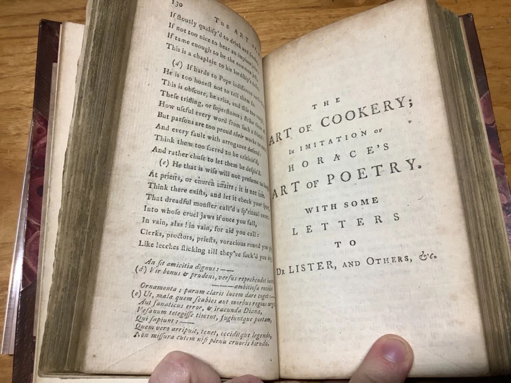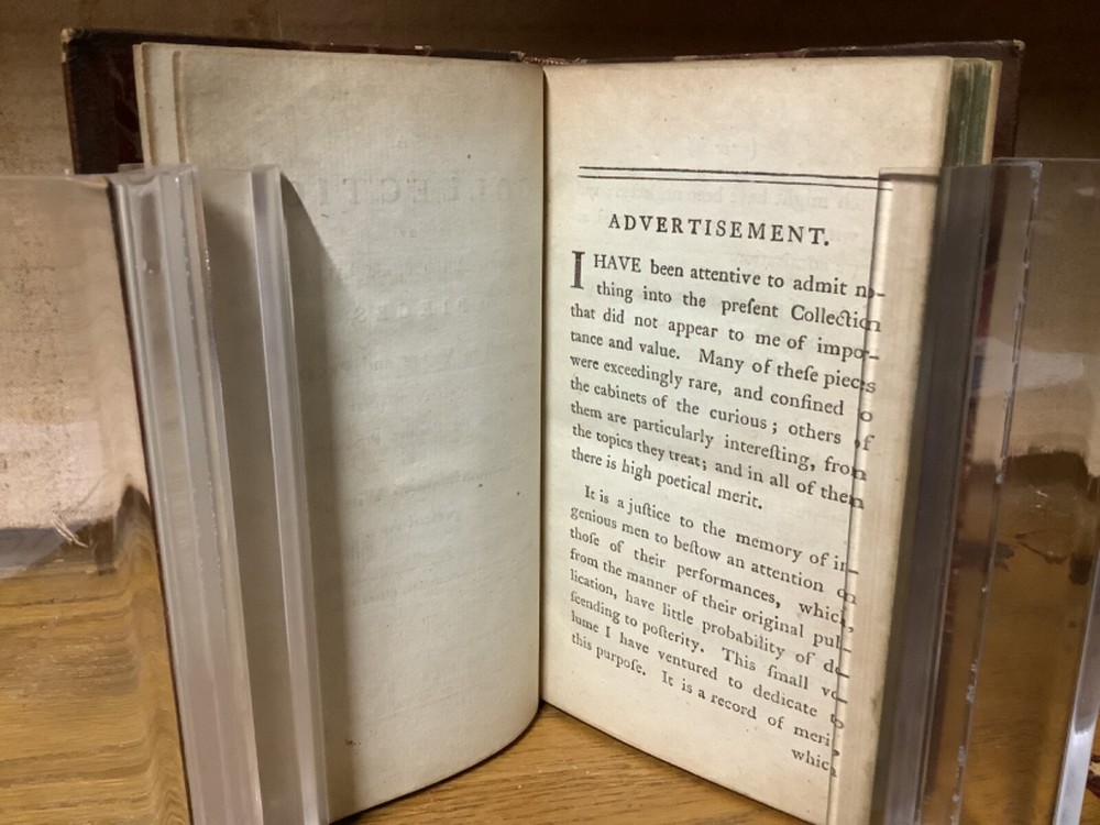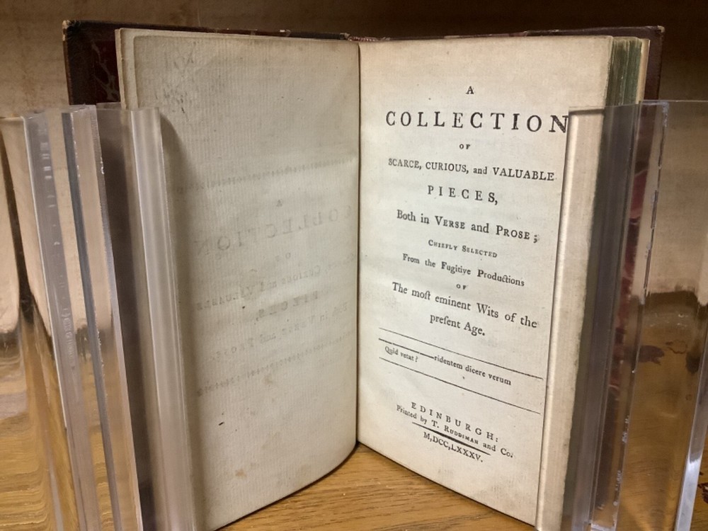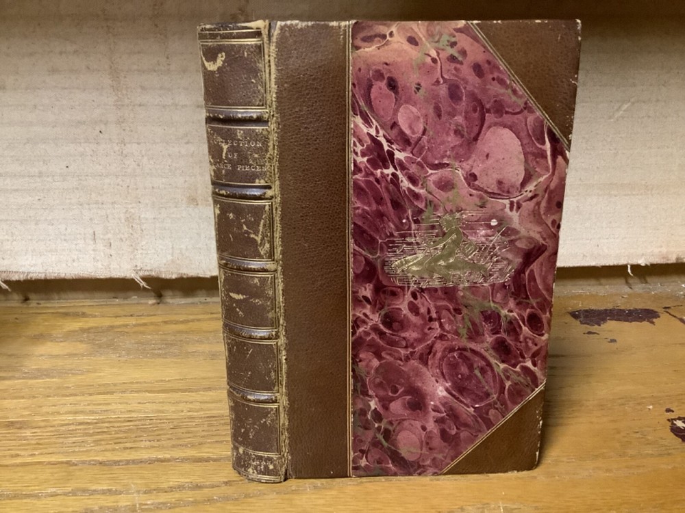 A Collection of Scarce, Curious, and Valuable Pieces, Both in Verse and Prose, Chiefly Selected from the Fugutive Productions of the Most Eminent Wits of the Present Age. Printed in Edinburgh by Thomas Ruddiman. 1785, 412 pp, 6.75” x 4.25”, 8vo, hardcover 3/4 leather. In good condition, with minor rubbing and wear to boards and spine, primarily along edges and corners. Some cracking to hinges at front and rear. Bookplate to front pastedown. Text block remains bound well. Light markings and marginalia. General age-related toning to pages, along with periodic foxing and wear. Please see photographs and ask any questions prior to purchasing. A scarce collection of pieces, including the satirical The Art of Cookery , and dialogues regarding Angling. Beautifully bound by Andrew Grieve in Edinburgh and stamped “Andrew Grieve Edinb” at bottom of first end page. COLL1785DLMP 0224-aj0957