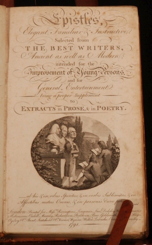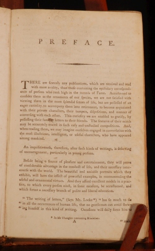 Click here to see our other books! Epistles, Elegant, Familiar, & Instructive. Selected from the Best Writers, Ancient as well as Modern; Intended for the Improvement of Young Persons, and for General Entertainment being a Proper Supplement to Extracts in Prose and in Poetry Vicesimus Knox 1791 Rivingtons, Longman, Law et al : 9.5" by 6" 9.5" by 6" (16), 776pp SUMMARY An extensive educational selection of eminent literary authors. Leather Binding Overall Condition: Good Only This book weighs 2 KG when packed UK Postage: £ 3.99 US Postage: £ 29.99 EU Postage : £ 21.99 European Postage: £ 23.99 Asia Postage: £ 37.99 Worldwide Postage: £ 38.99 DESCRIPTION With an engraved title page. Vicesimus Knox, 1752-1821, was an English headmaster and writer. "Knox's motivation was the education and improvement of a youthful and middling readership—‘the man of a liberal profession … [and] the mercantile classes’—otherwise too busy to study classical literature in full (Extracts … in Poetry, 1805, vi). As in his own writing, the non-fiction essay and its modern exponents, among them Addison, Johnson, Richard Steele, and Hugh Blair, featured prominently in his selection of prose writers. While not ignoring classical writers, one of Knox's principal aims was to identify and introduce to the canon those elements of modern literature he believed of particular benefit for ‘the commerce of ordinary life’. His focus also resulted in a noticeably generous coverage of eighteenth-century women writers" -ODNB. CONDITION In a full calf binding. Externally, rubbed. With a gilt reference number to the spine. The front joint is cracked and the rear joint starting. Internally, firmly bound, with light browning and the occasional spot or mark, prominent to the first and last few pages. The first eight leaves are only partially attached. With a blank label to the front pastedown. Overall Condition: Good Only GLOSSARY OF TERMS Overall Condition (Dustwrapper condition rating is shown after that for the book itself, where a dustwrapper is present) Fine - Very well preserved copy showing very little wear Very Good Indeed - Only one or two minor faults, really a very attractive copy Very Good - Quite a wide term meaning no major faults but probably several smaller ones often expected given the age of the book, but still a respectable copy Good - Meaning not very good. Some more serious faults as will be described in the condition report under 'condition' Good Only - Meaning one or more faults that could really do with repair Fair - As with good only above but with other faults leaving a compromised copy even after repair Poor - Really bad and possibly seriously incomplete. We only sell books in this condition where their rarity or value makes them attractive none the less. Major defects will be described. GUARANTEE We offer a full money back guarantee on our descriptions. Please ask for details and conditions. We prefer PAYPAL. If you pay via PAYPAL we will post the item off the same or the next working day with the postage you have selected. Please note we cannot accept USD cheques