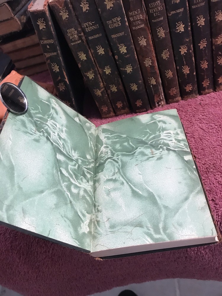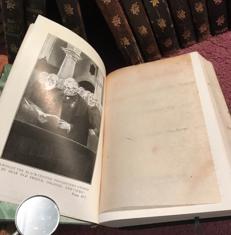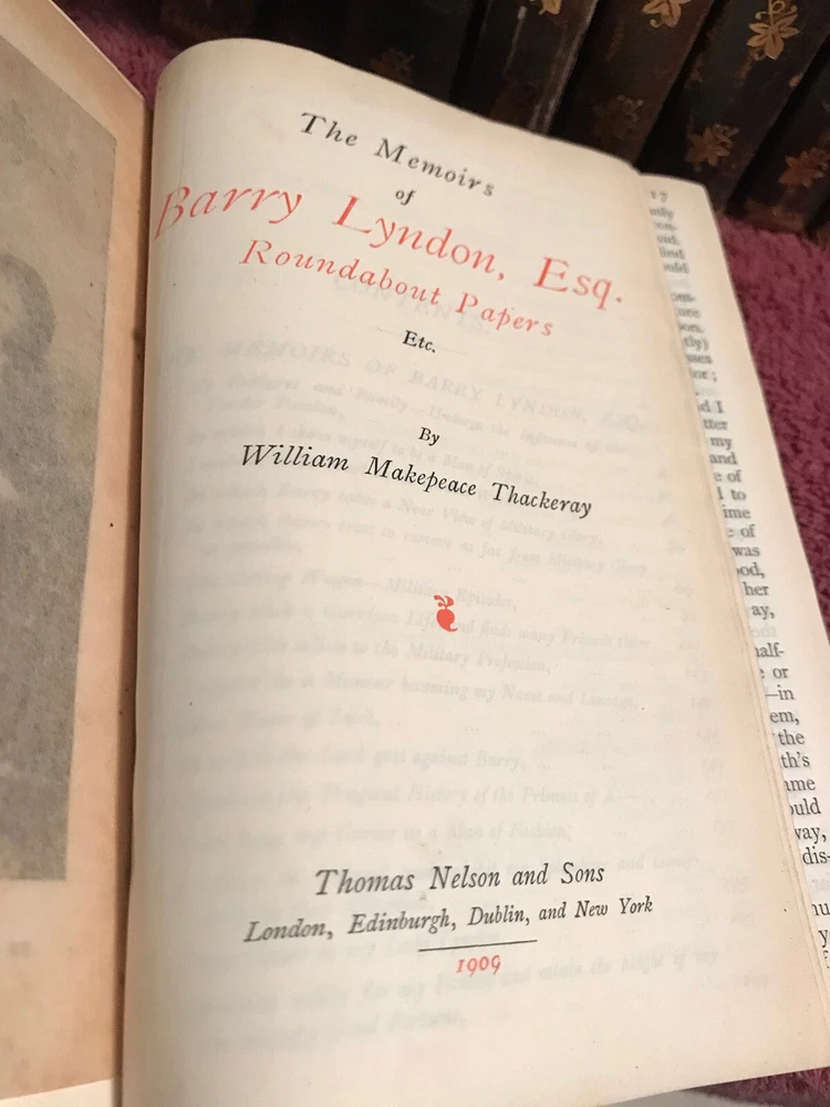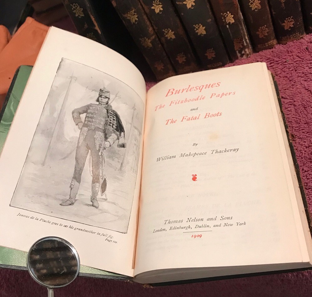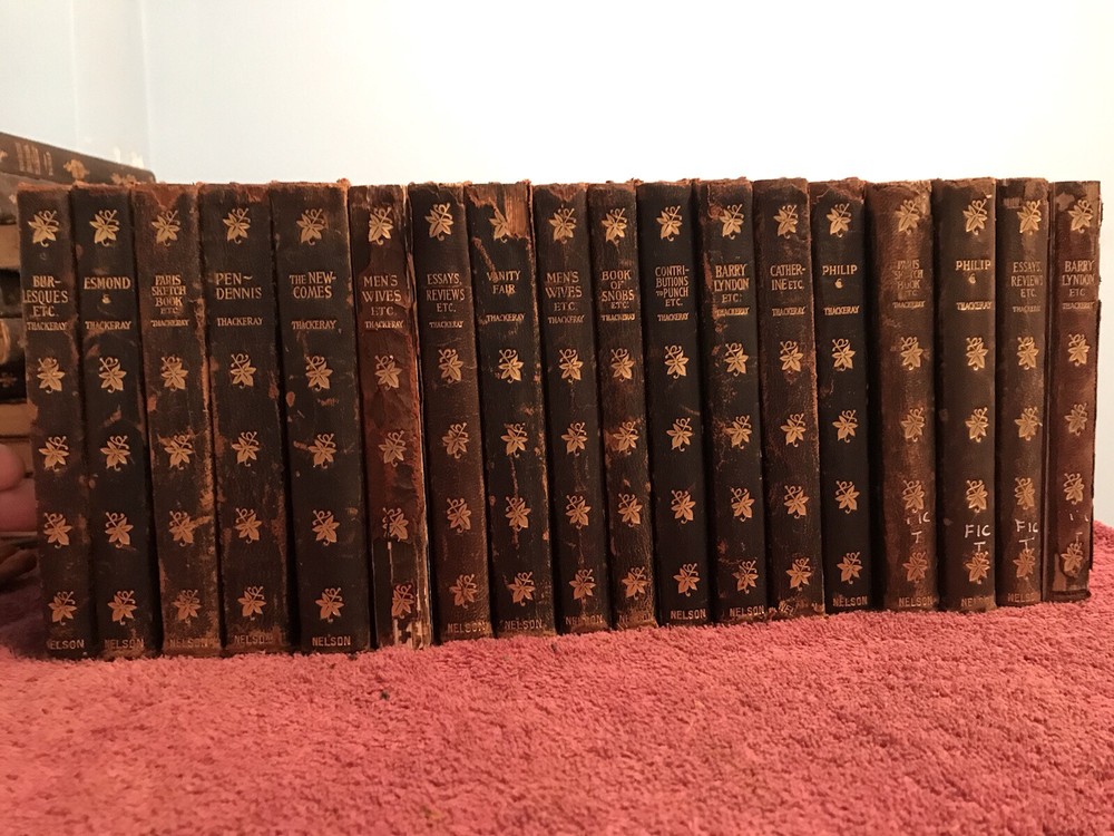 Antique leather-bound set of the works of William Makepeace Thackeray published by Thomas Nelson & Sons in 1909. Formerly the property of the Bedford Free Library. All the books are intact with the exception of “Men’s Wives, Etc.”. The front cover has become unattached but is still present on that one. There are two copies of “Barry Lyndon”, “Men’s Wives”, “Philip”, and “Paris Sketch-Book”. Most of these still have white pages and although some have slightly discolored to an off-white, the set as a whole is in nice shape. Most retain their silk ribbons.