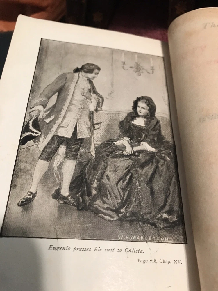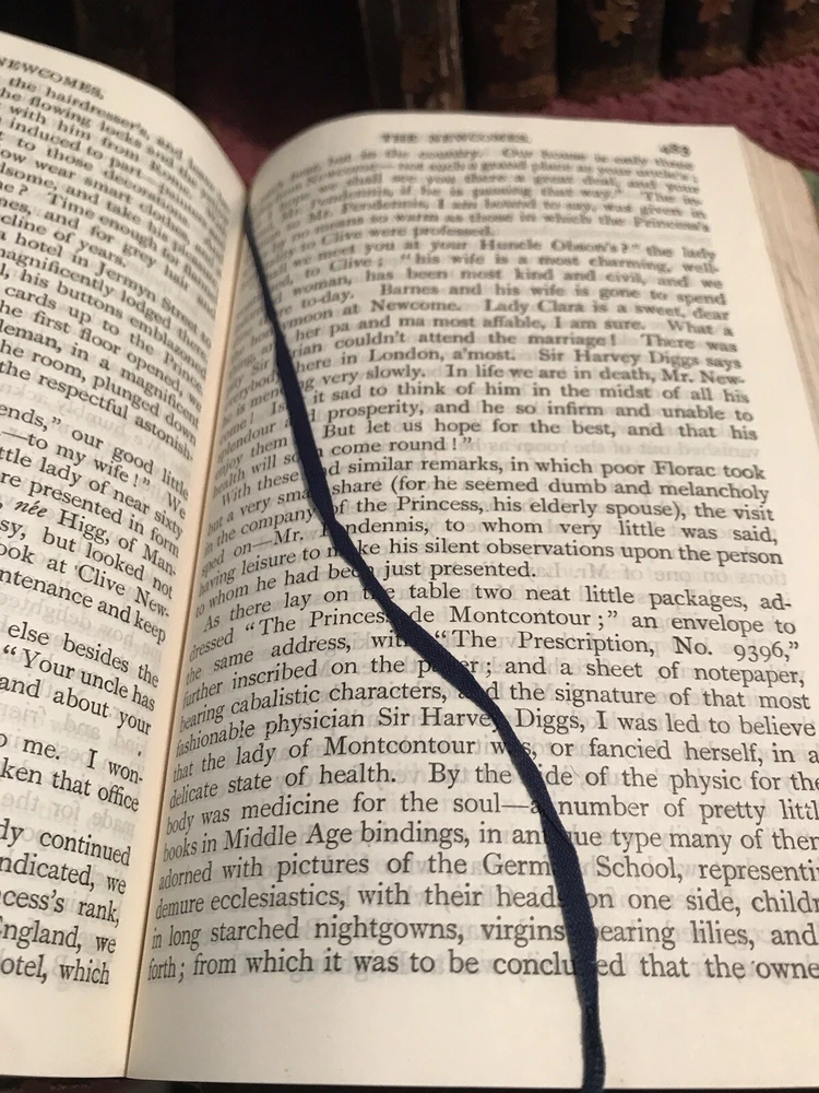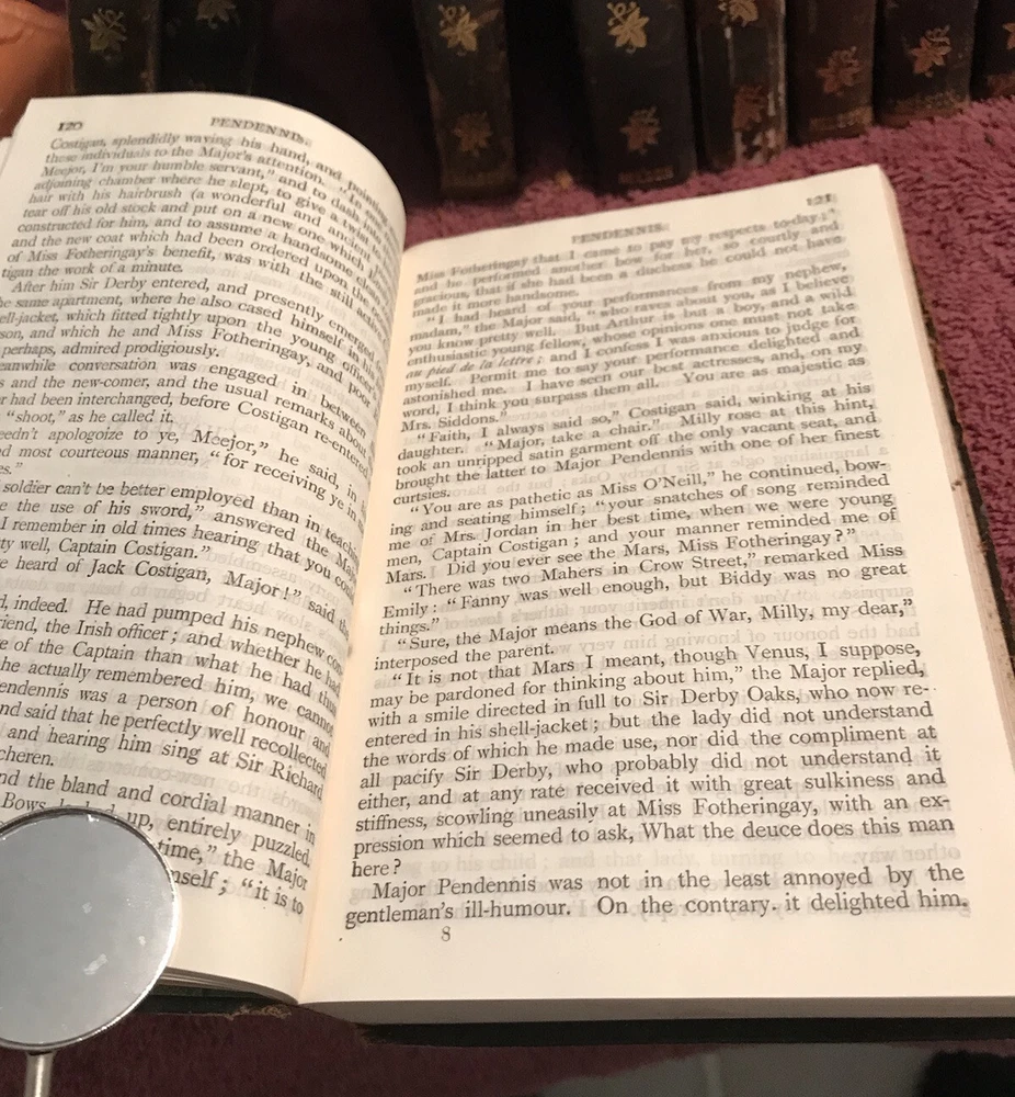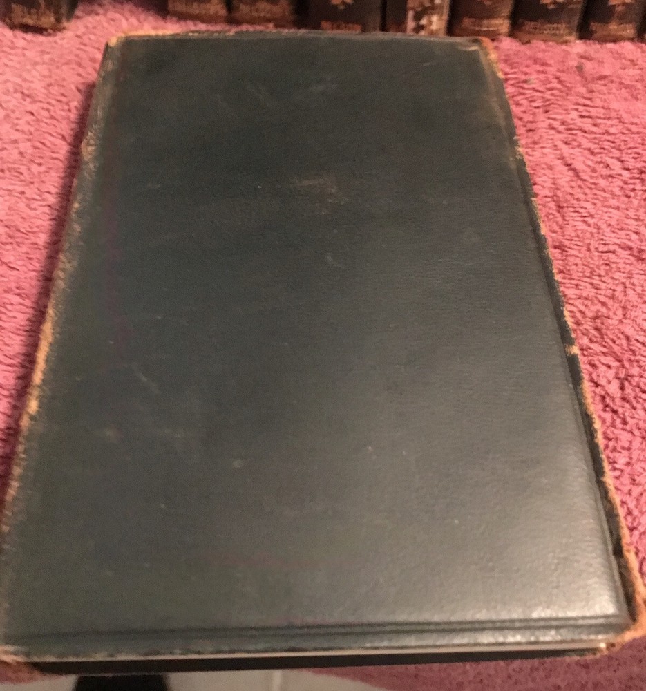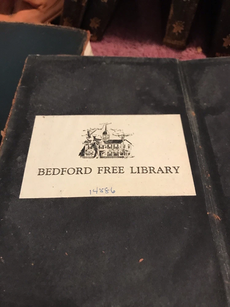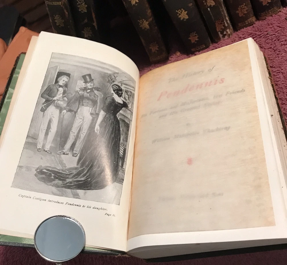 Antique leather-bound set of the works of William Makepeace Thackeray published by Thomas Nelson & Sons in 1909. Formerly the property of the Bedford Free Library. All the books are intact with the exception of “Men’s Wives, Etc.”. The front cover has become unattached but is still present on that one. There are two copies of “Barry Lyndon”, “Men’s Wives”, “Philip”, and “Paris Sketch-Book”. Most of these still have white pages and although some have slightly discolored to an off-white, the set as a whole is in nice shape. Most retain their silk ribbons.