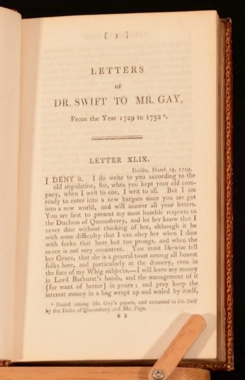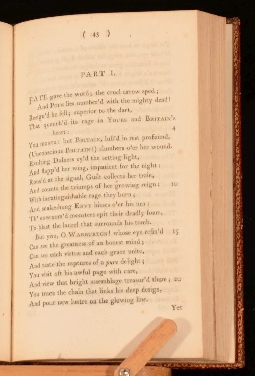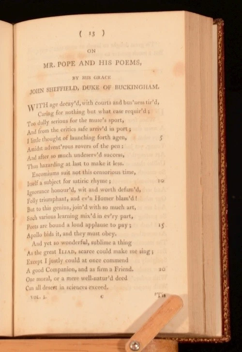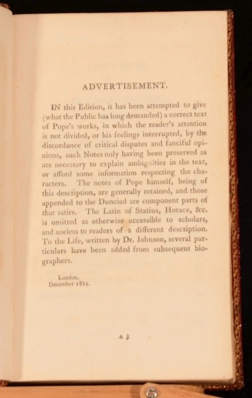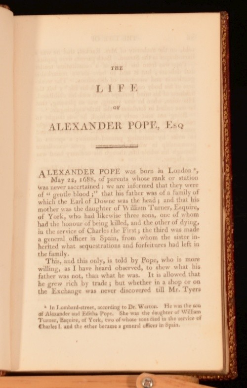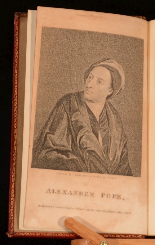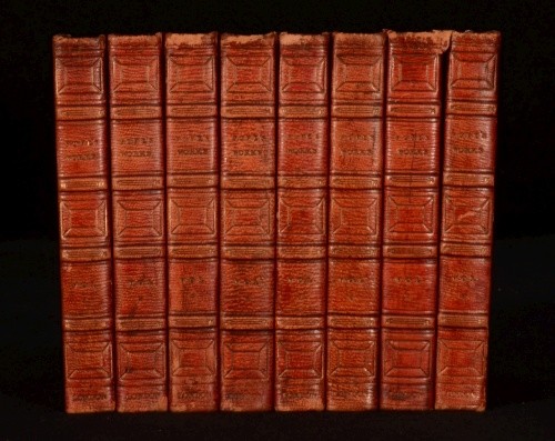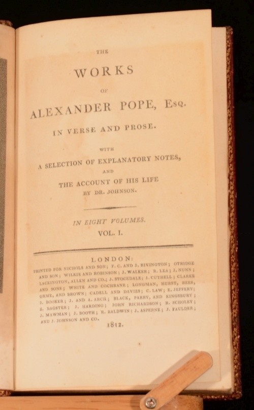 Click here to see our other books! The Works of Alexander Pope, Esq. in Verse and Prose With a Selection of Explanatory Notes and Account of his Life by Dr. Johnson Alexander Pope and Samuel Johnson 1812 Nichols and Son : London 6.5" by 4" clxiii, 173; viii, 333; iv, 337; vi, 365; iv, 303; xv, 339; xvi, 367; xv, 330pp SUMMARY A scarce set of The Works of Alexander Pope, Esq. in Verse and Prose with a Selection of Explanatory Notes and Account of his Life by Dr. Johnson Leather Binding,Scarce Overall Condition: Very Good This book weighs 3 KG when packed UK Postage: £ 3.99 US Postage: £ 36.99 EU Postage : £ 25.99 European Postage: £ 27.99 Asia Postage: £ 47.99 Worldwide Postage: £ 69.99 DESCRIPTION First edition thus. Seemingly the first edition to contain solely the notes of Samuel Johnson and The Life of the Author in this form. In eight volumes complete. With an engraved portrait of Pope to frontispiece to volume one. 'In this edition, it has been attempted to give (what the Public has long demanded) a correct text of Pope's works, in which the reader's attention is not divided, or his feelings interrupted, by the discordance of critical disputes and fanciful opinions, such Notes only having been preserved as are necessary to explain ambiguities in the text, or afford some information respecting the characters. The notes of Pope himself, being of this description, are generally retained... To the Life, written by Dr. Johnson, several particulars have been added from subsequent biographers.' London, December 1811. Alexander Pope (1688 - 1744) was an 18th-century English poet, best known for his satirical verse and for his translation of Homer. Famous for his use of the heroic couplet, he is the third-most frequently quoted writer in The Oxford Dictionary of Quotations, after Shakespeare and Tennyson. Samuel Johnson (1709 - 1784), often referred to as Dr Johnson, was an English writer who made lasting contributions to English literature as a poet, essayist, moralist, literary critic, biographer, editor and lexicographer. CONDITION In straight-grain morocco bindings. Externally, generally smart but with slight wear to extremities and odd marks to boards. Four hinges strained. Internally, firmly bound. Bright but with offsetting to title to volume one, occasional spotting and handling marks. Overall Condition: Very Good GLOSSARY OF TERMS Overall Condition (Dustwrapper condition rating is shown after that for the book itself, where a dustwrapper is present) Fine - Very well preserved copy showing very little wear Very Good Indeed - Only one or two minor faults, really a very attractive copy Very Good - Quite a wide term meaning no major faults but probably several smaller ones often expected given the age of the book, but still a respectable copy Good - Meaning not very good. Some more serious faults as will be described in the condition report under 'condition' Good Only - Meaning one or more faults that could really do with repair Fair - As with good only above but with other faults leaving a compromised copy even after repair Poor - Really bad and possibly seriously incomplete. We only sell books in this condition where their rarity or value makes them attractive none the less. Major defects will be described. GUARANTEE We offer a full money back guarantee on our descriptions. Please ask for details and conditions. We prefer PAYPAL. If you pay via PAYPAL we will post the item off the same or the next working day with the postage you have selected. Please note we cannot accept USD cheques