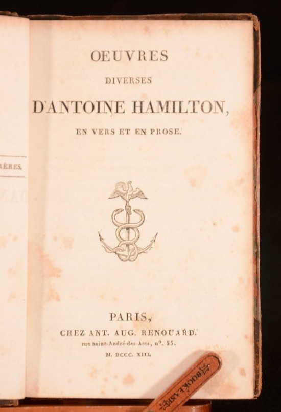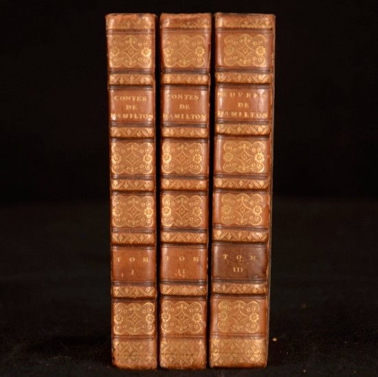 Click here to see our other books! Contes D'Antoine Hamilton Avec la Suite, Des Facardins et De Zeneyde and Oeuvres Diverses D'Antoine Hamilton En Vers et En Prose Antoine Hamilton; M De Levis 1813 Chez Ant Aug. Renouard : Paris 5.5" by 3.5" xvi, 287pp; 144pp, 79pp, 145-222pp, 36pp; 401pp SUMMARY Three uniformly bound volumes of Antoine Hamilton's work. Fine Binding,Leather Binding Overall Condition: Very Good This book weighs 0.75 KG when packed UK Postage: £ 3.99 US Postage: £ 19.99 EU Postage : £ 15.99 European Postage: £ 16.99 Asia Postage: £ 21.99 Worldwide Postage: £ 25.99 DESCRIPTION Antoine Hamilton's Contes, or Tales to the first two volumes with his 'Zeneyde' and 'Des Facardins' bound to the end of volume II. Volume III is his Works which include his 'Lettres et Eptres', his 'Poesies Diverses' and his 'Chansons'. Collated, complete. All three volumes are written entirely in French. Antoine Hamilton was an Irish classical author of Scottish ancestry who wrote in French. His literary characteristics are those of a French author and his 'Memoires du comte de Gramont' made him one of the classical writers of France. Hamilton was raised in France as his family fled after the execution of Charles I. CONDITION In half calf bindings with gilt stamping to the spines. Externally, smart with rubbing to the joints and the head and tails of the spines. Prior owner's bookplate to front pastedown, Clonmore. Internally, all volumes are firmly bound. Pages are slightly age toned to edges with spotting throughout. Overall Condition: Very Good GLOSSARY OF TERMS Overall Condition (Dustwrapper condition rating is shown after that for the book itself, where a dustwrapper is present) Fine - Very well preserved copy showing very little wear Very Good Indeed - Only one or two minor faults, really a very attractive copy Very Good - Quite a wide term meaning no major faults but probably several smaller ones often expected given the age of the book, but still a respectable copy Good - Meaning not very good. Some more serious faults as will be described in the condition report under 'condition' Good Only - Meaning one or more faults that could really do with repair Fair - As with good only above but with other faults leaving a compromised copy even after repair Poor - Really bad and possibly seriously incomplete. We only sell books in this condition where their rarity or value makes them attractive none the less. Major defects will be described. GUARANTEE We offer a full money back guarantee on our descriptions. Please ask for details and conditions. We prefer PAYPAL. If you pay via PAYPAL we will post the item off the same or the next working day with the postage you have selected. Please note we cannot accept USD cheques