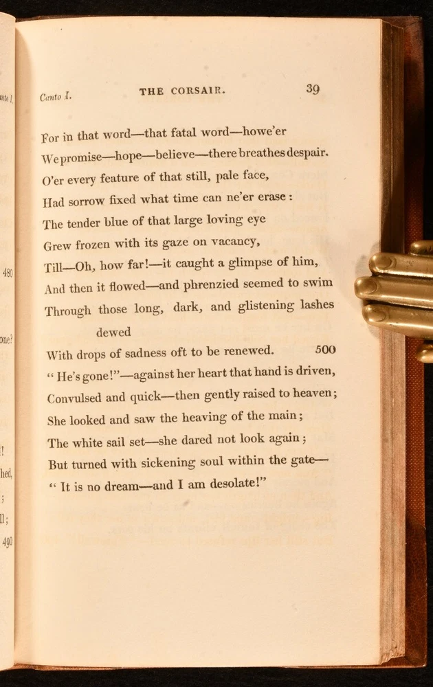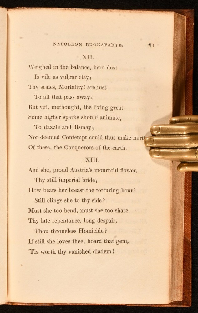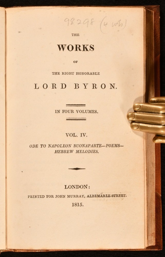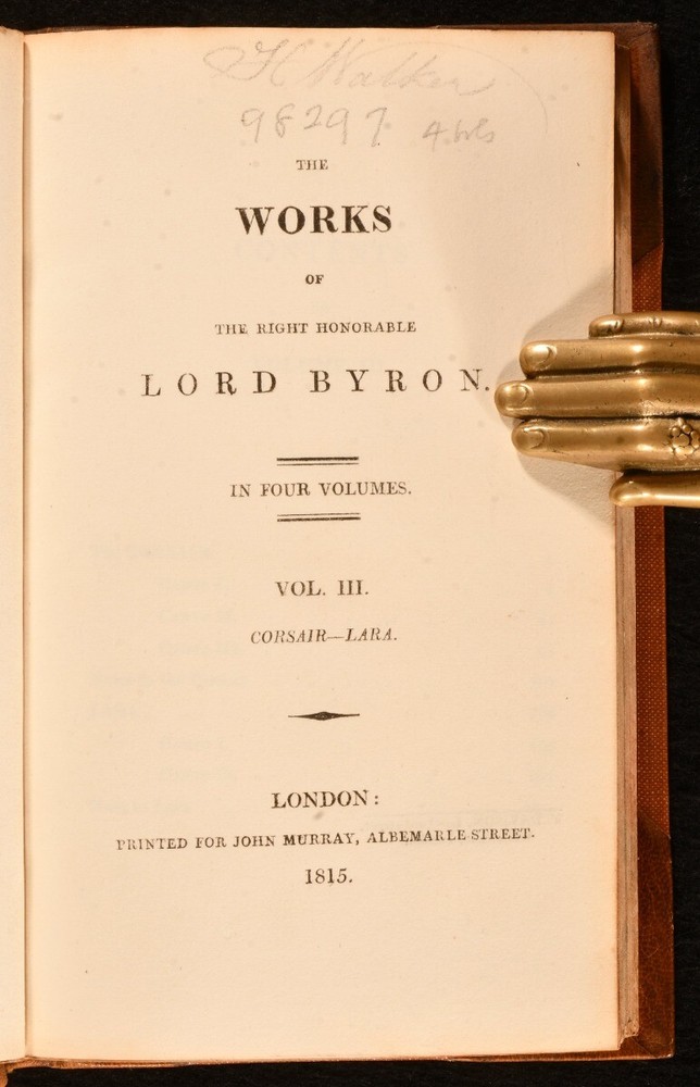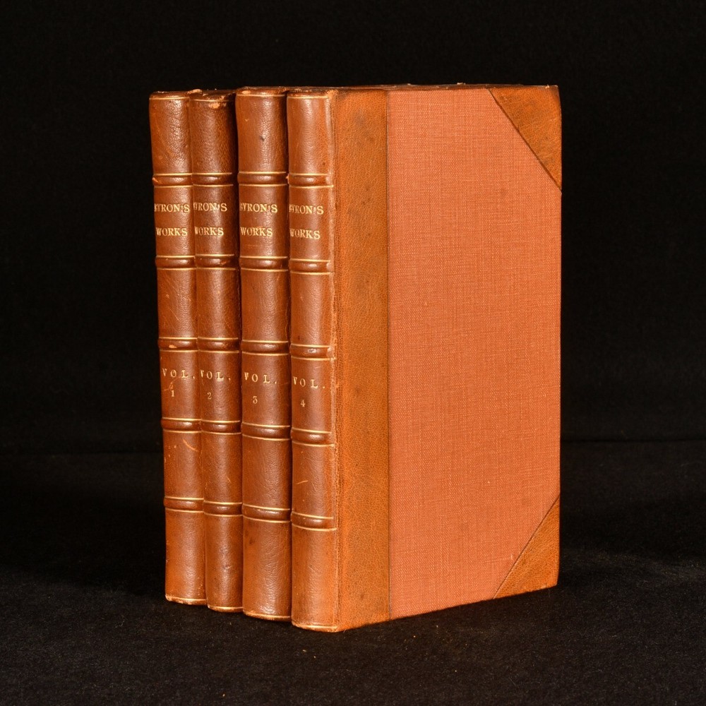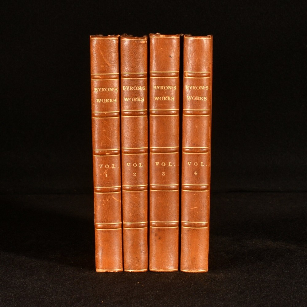 Click here to see our other books! The Works of The Right Honourable Lord Byron Volume One Volume Two Volume Three Volume Four Lord Byron 1815 John Murray : London 6.5" by 4" x, 218; [2], 202; viii, 228; viii, 203pp. SUMMARY A four volume set of works by Lord Byron bound in half calf. Leather Binding Overall Condition: Very Good This book weighs 1.5 KG when packed UK Postage: £ 3.99 US Postage: £ 22.99 EU Postage : £ 16.99 European Postage: £ 17.99 Asia Postage: £ 22.99 Worldwide Postage: £ 28.99 DESCRIPTION A four volume set of works by Lord Byron. Complete in four. Bound by Edmund Worrall with a bookbinder's label to the front pastedown. Bound in half calf with cloth to the boards. This collection of works were written by the popular English poet, Lord Byron. Byron is known as being one of the leading figures of the romantic movement and is considered to be one of the greatest English poets. This set includes his most popular works, including his more lengthy narrative 'Childe Harold's Pilgrimage'. CONDITION Bound in half calf with cloth to the boards. Externally very smart with slight rubbing to the extremities to 'Vol 1', the odd minor marks to the boards and spines and slight cracking to the leather to the joints. Bookplate belonging to a 'Hannah Walker' and a bookbinder's label to the front pastedowns with the odd minor mark and slight offsetting to the extremities to the extremities of the endpapers. Internally firmly bound with generally bright and clean page with very light age toning and the odd spot, heavier to the rear of 'Vol 1'. Overall Condition: Very Good GLOSSARY OF TERMS Overall Condition (Dustwrapper condition rating is shown after that for the book itself, where a dustwrapper is present) Fine - Very well preserved copy showing very little wear Very Good Indeed - Only one or two minor faults, really a very attractive copy Very Good - Quite a wide term meaning no major faults but probably several smaller ones often expected given the age of the book, but still a respectable copy Good - Meaning not very good. Some more serious faults as will be described in the condition report under 'condition' Good Only - Meaning one or more faults that could really do with repair Fair - As with good only above but with other faults leaving a compromised copy even after repair Poor - Really bad and possibly seriously incomplete. We only sell books in this condition where their rarity or value makes them attractive none the less. Major defects will be described. GUARANTEE We offer a full money back guarantee on our descriptions. Please ask for details and conditions. We prefer PAYPAL. If you pay via PAYPAL we will post the item off the same or the next working day with the postage you have selected. Please note we cannot accept USD cheques