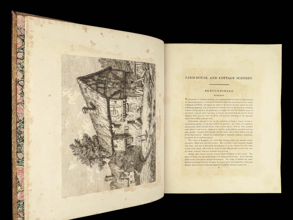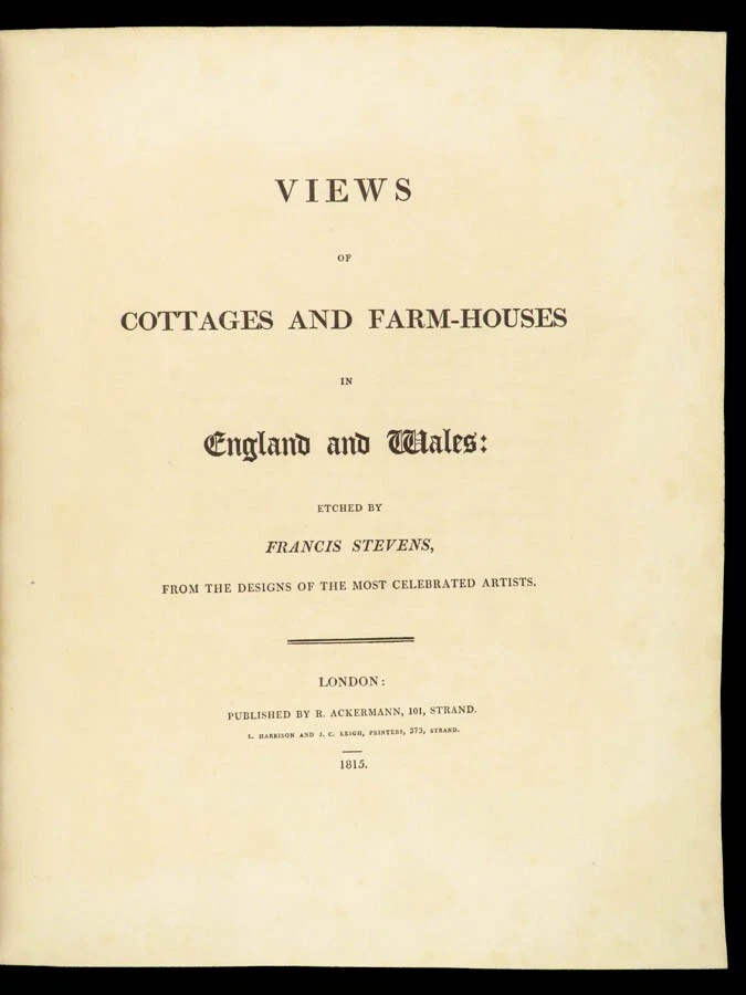 1815 Architecture 1 ed Cottages & Farmhouses in England Wales Illustrated FOLIO Francis Stevens’s “ Views of Cottages and Farmhouses in England and Wales ” is a classic, early 19 th -century collection of illustrations depicting views of rural English architecture. Stevens collected designs of artists and supplemented each illustration descriptions of each cottage from all over England. Item number: #24391 Price: $750 STEVENS, Francis Views of cottages and farm-houses in England and Wales, etched from the designs of the most celebrated artists London: Ackermann, 1815. First edition. Details : · Collation: Complete with all pages o iv, 36 o 53 engraved plates · Language: English · Binding: Leather; tight and secure · Size : ~13.75in X 11.25in (35cm x 28.5cm) Our Guarantee: Very Fast. Very Safe. Free Shipping Worldwide. Customer satisfaction is our priority! Notify us with 7 days of receiving, and we will offer a full refund without reservation! 24391