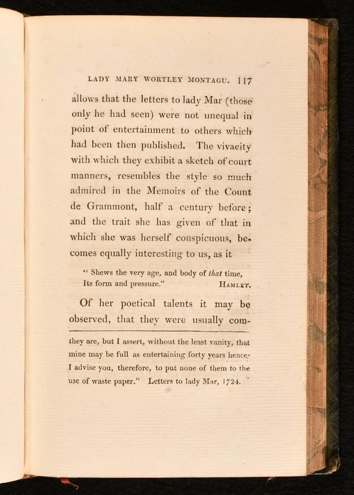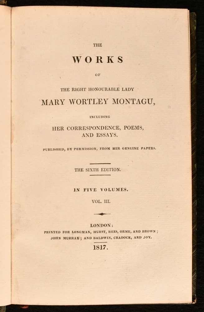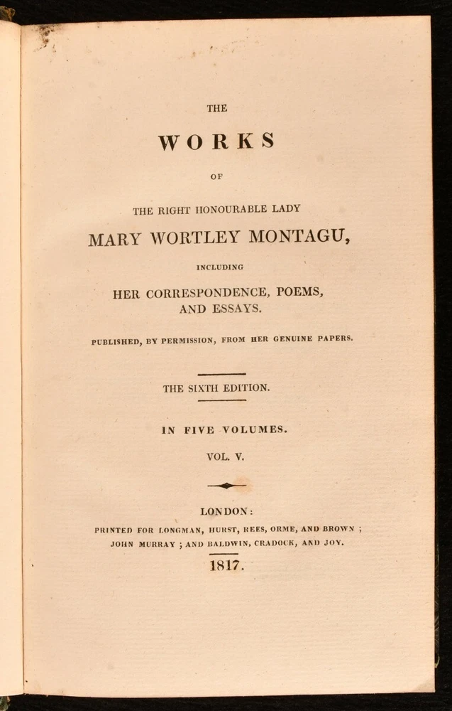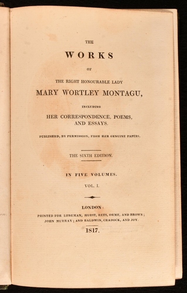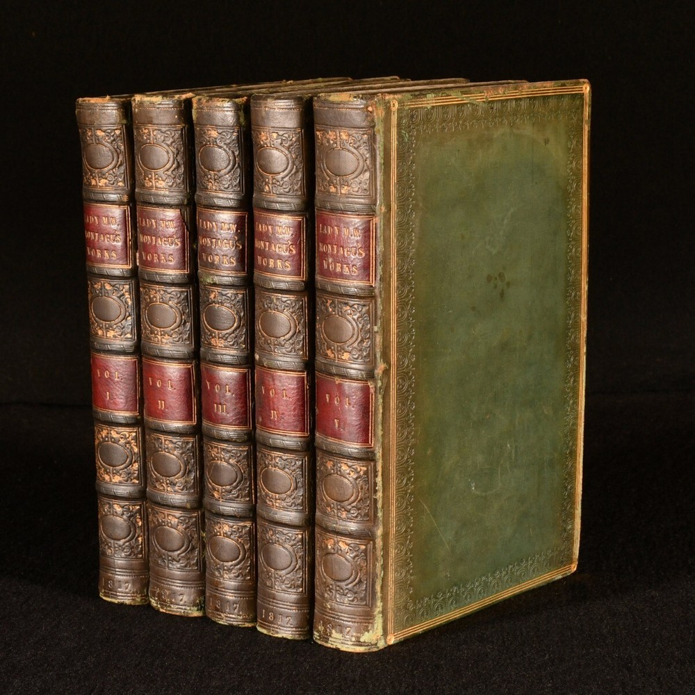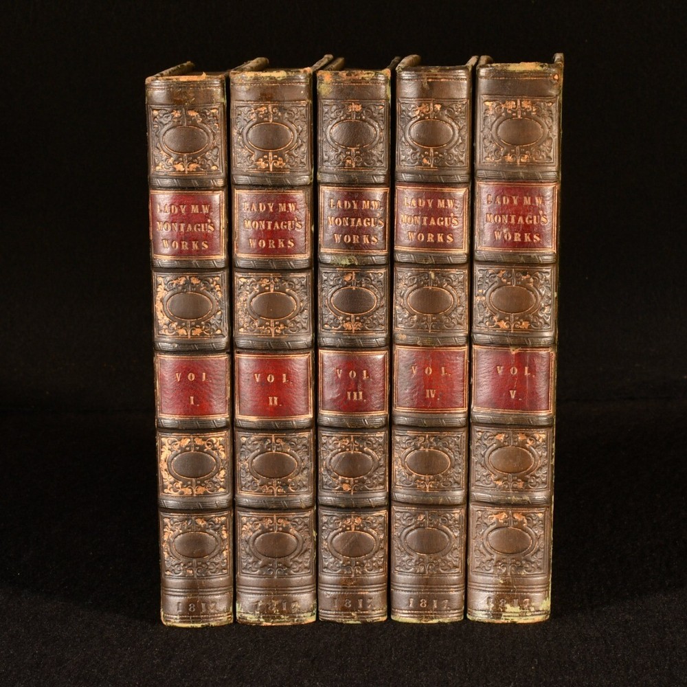 Click here to see our other books! The Works of the Right Honourable Lady Mary Wortley Montagu Lady Mary Wortley Montagu 1817 Longman, Hurst, Rees, Orme, and Brown : London 8" by 5.5" 308; 339; 298; 331; 355pp SUMMARY The five volume sixth edition of Lady Mary Wortley Montagu's works, including her correspondences, poems and essays. Folding Maps,Illustrated,Leather Binding Overall Condition: Very Good Indeed This book weighs 4 KG when packed UK Postage: £ 4.49 US Postage: £ 39.99 EU Postage : £ 26.99 European Postage: £ 36.99 Asia Postage: £ 65.99 Worldwide Postage: £ 99.99 DESCRIPTION The sixth edition of this work, complete in five volumes. Montagu's letters and writings detail her experiences travelling through Europe, Asia, and Africa. The letters begin in 1716, when her husband, Edward Wortley Montagu, was appointed Ambassador at Constantinople. With him, Mary travelled to Vienne, Adrianople, and Constantinople. Montagu was also well known for introduction and advocating for the smallpox inoculation to Britain, after having travelled to Turkey. She is best known for her letters written in Turkey. Volume I is illustrated with an engraved frontispiece, and with nine plates, seven of which are folding. Collated, complete. In smart calf bindings. CONDITION In calf bindings with blind tooling. Back strips lightly age toned, with light rubbing to back strip head and tail. Light rubbing to joints. Internally, firmly bound. Pages exceptionally clean and bright. Overall Condition: Very Good Indeed GLOSSARY OF TERMS Overall Condition (Dustwrapper condition rating is shown after that for the book itself, where a dustwrapper is present) Fine - Very well preserved copy showing very little wear Very Good Indeed - Only one or two minor faults, really a very attractive copy Very Good - Quite a wide term meaning no major faults but probably several smaller ones often expected given the age of the book, but still a respectable copy Good - Meaning not very good. Some more serious faults as will be described in the condition report under 'condition' Good Only - Meaning one or more faults that could really do with repair Fair - As with good only above but with other faults leaving a compromised copy even after repair Poor - Really bad and possibly seriously incomplete. We only sell books in this condition where their rarity or value makes them attractive none the less. Major defects will be described. GUARANTEE We offer a full money back guarantee on our descriptions. Please ask for details and conditions. We prefer PAYPAL. If you pay via PAYPAL we will post the item off the same or the next working day with the postage you have selected. Please note we cannot accept USD cheques