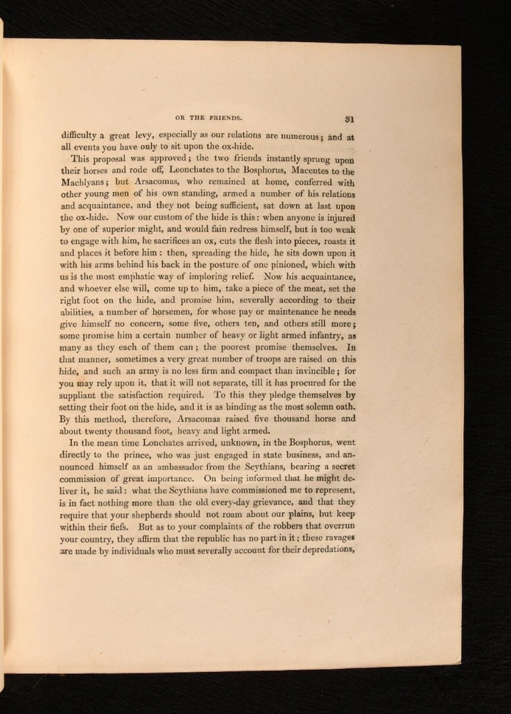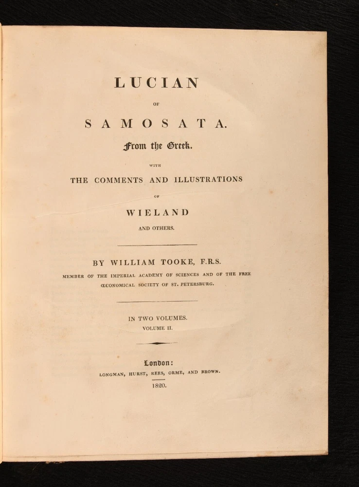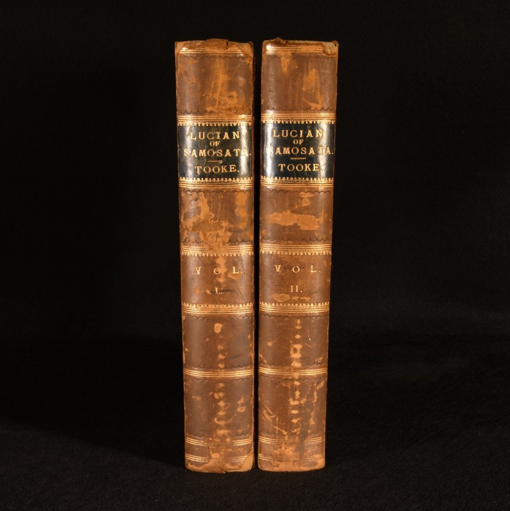 Click here to see our other books! Lucian of Samosata. From the Greek. With the Comments and Illustrations of Wieland and Others William Tooke 1820 Longman, Hurst, Rees, Orme and Brown : London 11.5" by 9" xxii, 790; vi, 793pp. SUMMARY The complete two-volume first edition of William Tooke's translations of the works of Lucian of Samosata, uniformly bound in half calf. First Edition,Illustrated,Leather Binding Overall Condition: Good Only This book weighs 4.5 KG when packed UK Postage: £ 4.49 US Postage: £ 42.99 EU Postage : £ 27.99 European Postage: £ 45.99 Asia Postage: £ 74.99 Worldwide Postage: £ 129.99 DESCRIPTION The first edition of this work, uniformly bound in a half calf binding with marbled boards. Library label of Norfolk & Norwich Library to each of the front boards, and a library bookplate to each of the front paste downs. Illustrated with an engraved frontispiece to Volume I. William Tooke (1744-1820) was a British clergyman and historian. In this two-volume set, Tooke translates the work of Lucian of Samosata from the Greek, with a brief biography. Lucian of Samosata was a satirist, rhetorician and pamphleteer, best known for his ridicule of superstition and for inventing the genre of comic dialogue. His writings were very popular in antiquity. He has also had a huge impact on Western literature, inspiring More's Utopia , Shakespeare's Timon of Athens and Swift's Gulliver's Travels . CONDITION In a half calf binding with marbled boards. Externally, rubbed to the spines and extremities. Cracking to the joints of Volume I. Cracking to the front joint of Volume II. Joints may fail with further handling. Internally, firmly bound. Pages are generally bright and clean, with scattered spotting to the first and last few pages. Overall Condition: Good Only GLOSSARY OF TERMS Overall Condition (Dustwrapper condition rating is shown after that for the book itself, where a dustwrapper is present) Fine - Very well preserved copy showing very little wear Very Good Indeed - Only one or two minor faults, really a very attractive copy Very Good - Quite a wide term meaning no major faults but probably several smaller ones often expected given the age of the book, but still a respectable copy Good - Meaning not very good. Some more serious faults as will be described in the condition report under 'condition' Good Only - Meaning one or more faults that could really do with repair Fair - As with good only above but with other faults leaving a compromised copy even after repair Poor - Really bad and possibly seriously incomplete. We only sell books in this condition where their rarity or value makes them attractive none the less. Major defects will be described. GUARANTEE We offer a full money back guarantee on our descriptions. Please ask for details and conditions. We prefer PAYPAL. If you pay via PAYPAL we will post the item off the same or the next working day with the postage you have selected. Please note we cannot accept USD cheques