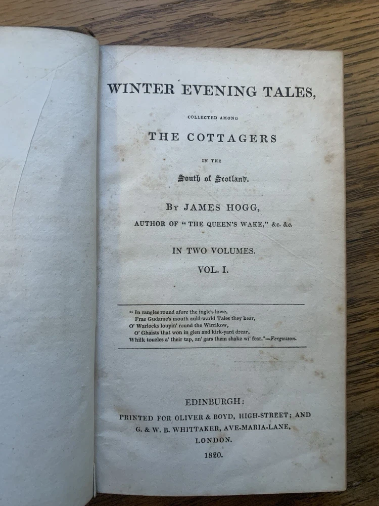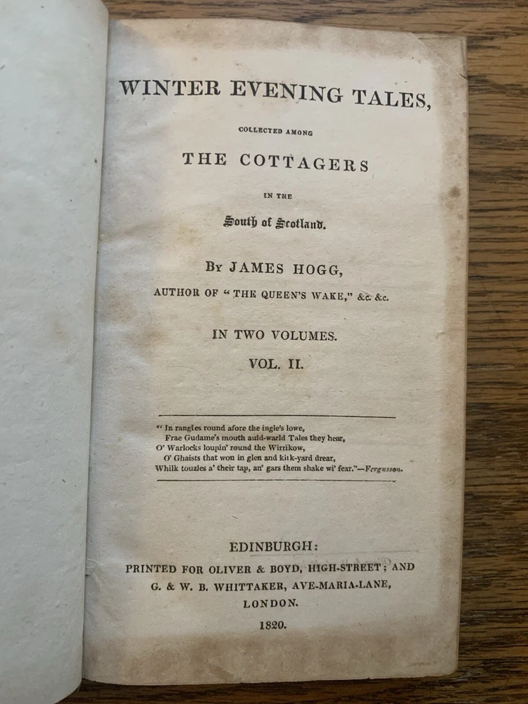 This is a rare and valuable 1820 2vols Winter Evening Tales South Scotland by James Hogg. The first edition was published by Oliver and Boyd in Edinburgh. The book is in its original form and has not been reprinted. It contains a collection of short stories and anthologies that are perfect for any book lover. The leather binding is intact and shows some signs of wear and tear which is expected given its age. The book is written in English and has no illustrations. This item is a must-have for any collector or James Hogg enthusiast. Bound in full calf lettering to spine in gilt with dark red panels rubbed and slightly chipped with some small loss edges & corners of boards rubbed, prelims slightly tanned foxed. Foxing to some pages and text. Overall very good set