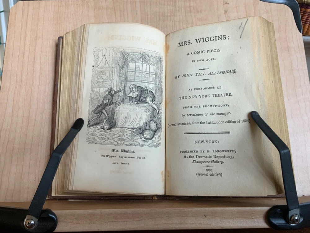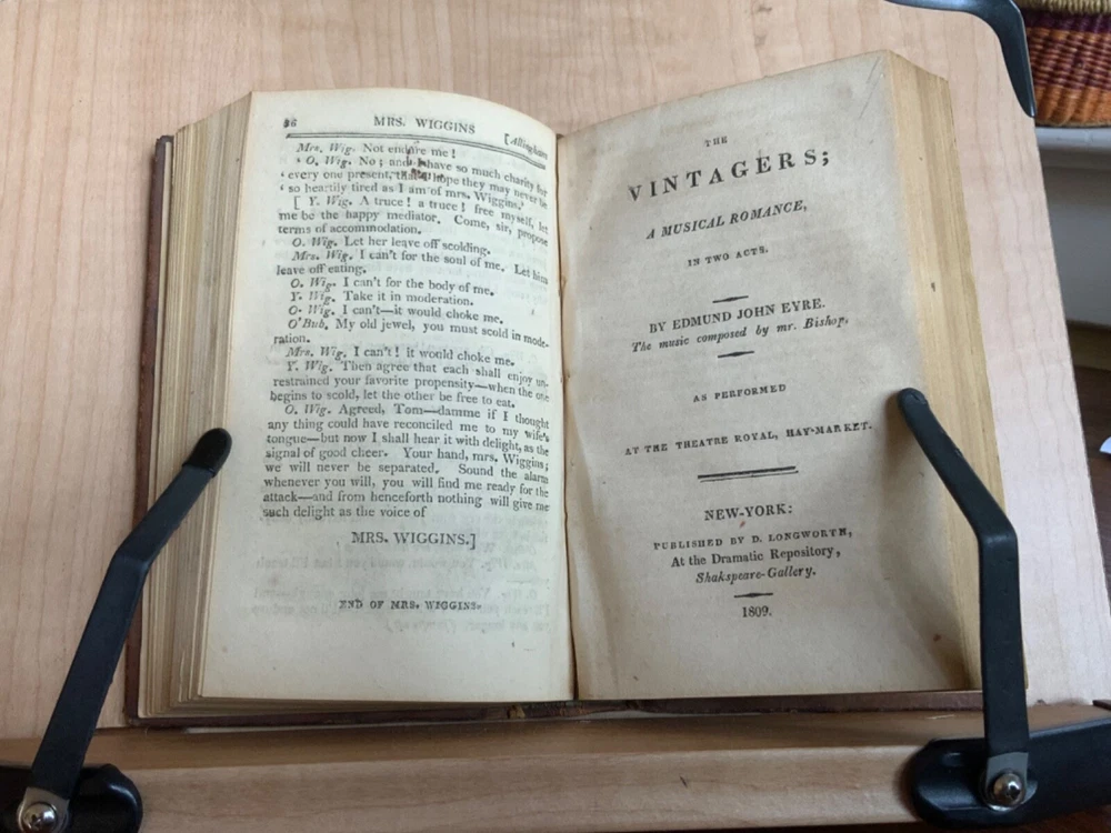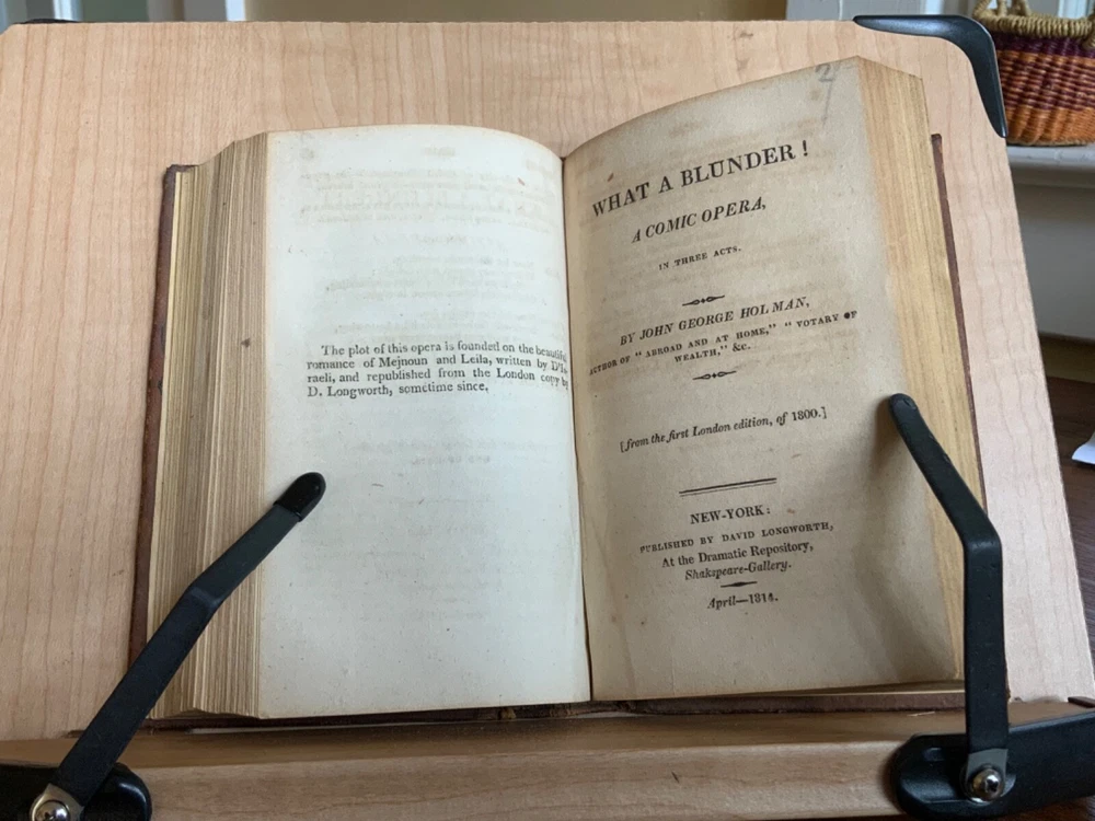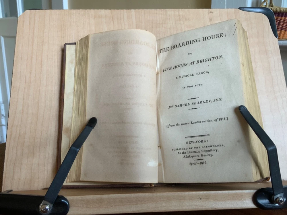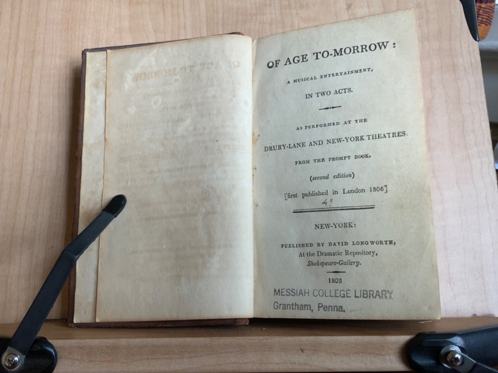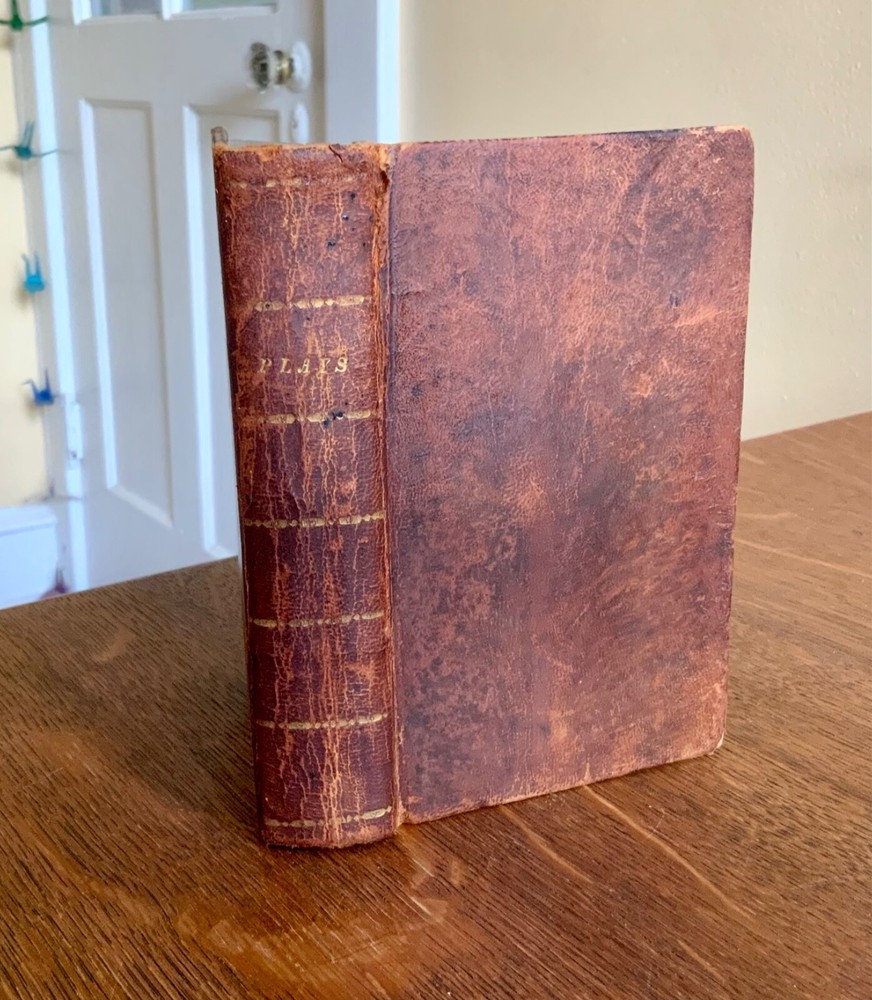 Collection of Rare Early Republic American Plays: Of Age To-Morrow: A Musical Entertainment, in Two Acts. As Performed at the Drury-Lane and New-York Theatres from the Prompt Book. (Second Edition) First Published in London 1806, Published by David Longworth, New York, 1803, 39 pp. Paul and Virginia, A Musical Entertainment. In Two Acts, By James Cobb, Esq. Published by Thomas Longworth, New York, 1820, 33 pp. The Boarding House; Or, Five Hours at Brighton. A Musical Farce, in Two Acts. By Samuel Beazley, Jun. from the second London Edition, of 1811. Published by The Longworths, April 1812, New York, 43 pp. The Purse; Or, Benevolent Tar. A Musical Drama, in One Act. By J.C. Cross, Published by David Longworth, New York, 1816, 20pp. Mrs. Wiggins; A Comic Piece, in Two Acts. By John Till Allingham. As Performed at The New-York Theatre. From the Prompt-Book, by permission of the manager. Second American, from the first London edition of 1802. Published by D. Longworth, New York, 1808, frontispiece, 36 pp. The Vintagers; A Musical Romance, in Two Acts. By Edmund John Eyre, The Music Composed by Mr. Bishop. As Performed at the Theatre Royal, Hay-Market. Published by D. Longworth, New York, 1809, 28 pp. Kais; Or, Love in the Deserts: An Opera, in Four Acts. By I. Brandon, Esq. As Performed at The Theatre Royal, Drury-Lane. From the second London edition of 1808. Published by D. Longworth, New York, August, 1809, 55 pp. What a Blunder! A Comic Opera, in Three Acts. By John George Holman, from the first London edition, of 1800. Published by David Longworth, New York, April 1814, 55pp. Safe and Sound: An Opera, in Three Acts. By Theodore Edward Hook, Esq. As Performed at the Lyceum Theatre, London. From the first London edition of 1809. Published by D. Longworth, New York, March 1810, 44pp. Darkness Visible; A Farce, in Two Acts. By Theodore Edward Hook, Esq. from the second London edition, of 1811. Published by D. Longworth, New York, April 1812, 40 pp. Full tree calf leather, 6 x 4”, 18mo. In good condition. Light wear to extremities with minor scuffing along edges and corners. Scuffs along surface of leather with a few ares of heavier abrasions. Spine creased with wear at joints and spine ends. Ex-library of Messiah College Library Presented by Mr. Frank Masland II (1895-1994). Messiah plate adhered to marbled pastedown. Manuscript contents leaf on second fly written in old hand. College Library stamp printed on first title page. Internally good with light toning at edges, minor instances of foxing, and scattered age staining. Free of known marginalia. Binding tight and intact. A sound book. Please see photo. Quite scarce as many of this plays are no longer available anywhere! RAREA1820FQRB