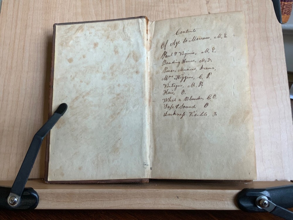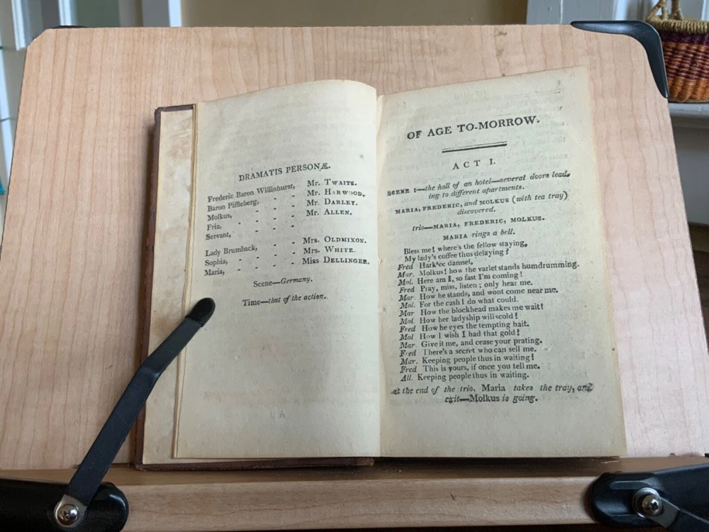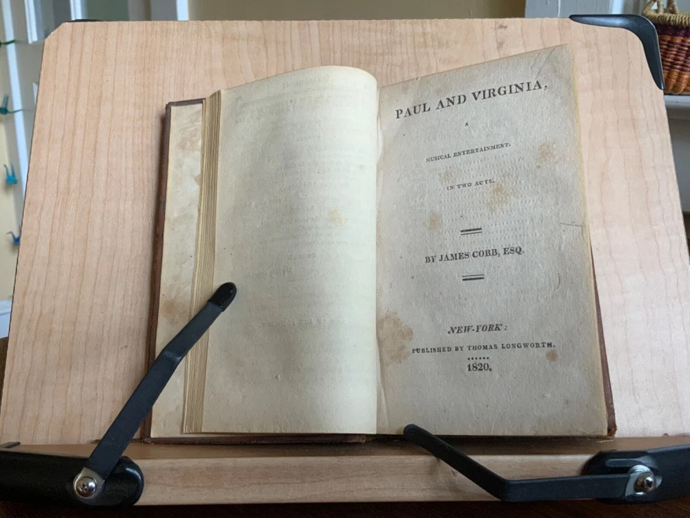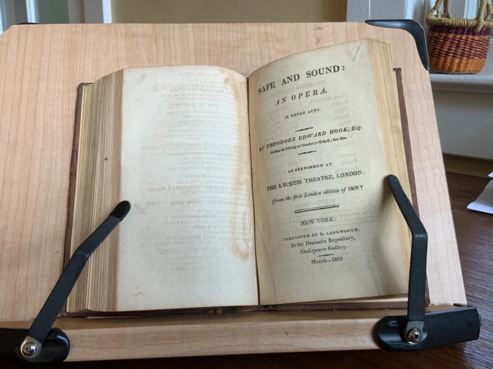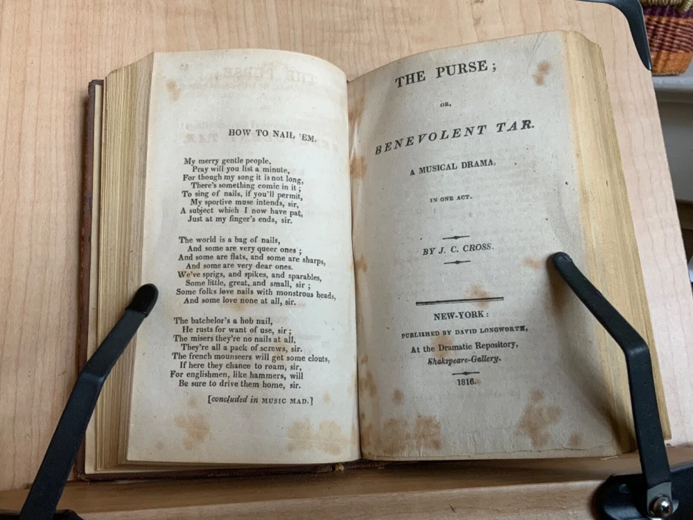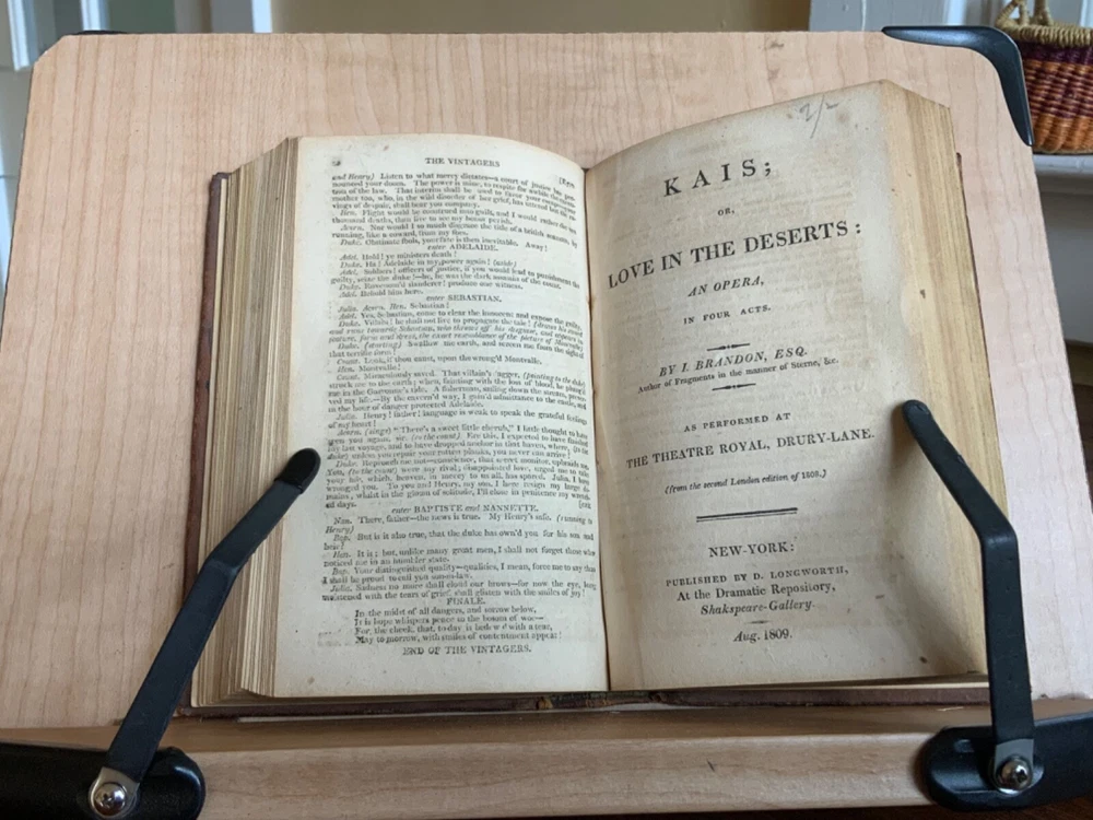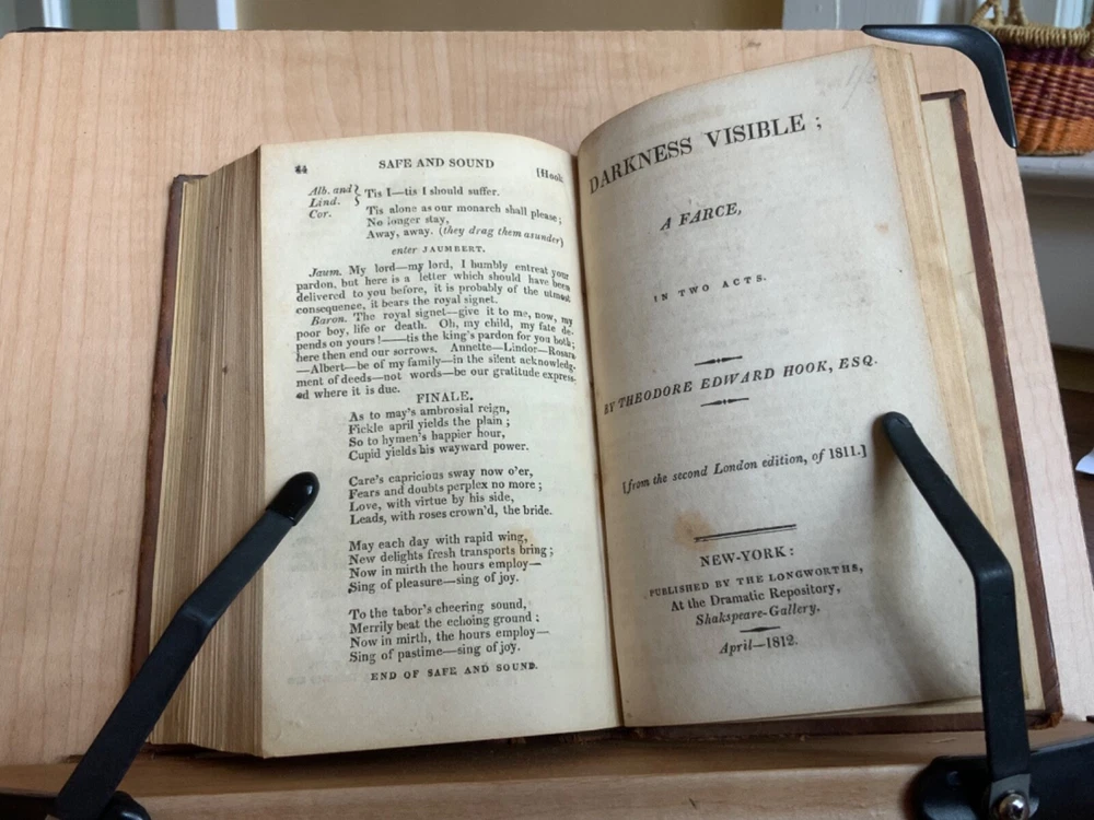 Collection of Rare Early Republic American Plays: Of Age To-Morrow: A Musical Entertainment, in Two Acts. As Performed at the Drury-Lane and New-York Theatres from the Prompt Book. (Second Edition) First Published in London 1806, Published by David Longworth, New York, 1803, 39 pp. Paul and Virginia, A Musical Entertainment. In Two Acts, By James Cobb, Esq. Published by Thomas Longworth, New York, 1820, 33 pp. The Boarding House; Or, Five Hours at Brighton. A Musical Farce, in Two Acts. By Samuel Beazley, Jun. from the second London Edition, of 1811. Published by The Longworths, April 1812, New York, 43 pp. The Purse; Or, Benevolent Tar. A Musical Drama, in One Act. By J.C. Cross, Published by David Longworth, New York, 1816, 20pp. Mrs. Wiggins; A Comic Piece, in Two Acts. By John Till Allingham. As Performed at The New-York Theatre. From the Prompt-Book, by permission of the manager. Second American, from the first London edition of 1802. Published by D. Longworth, New York, 1808, frontispiece, 36 pp. The Vintagers; A Musical Romance, in Two Acts. By Edmund John Eyre, The Music Composed by Mr. Bishop. As Performed at the Theatre Royal, Hay-Market. Published by D. Longworth, New York, 1809, 28 pp. Kais; Or, Love in the Deserts: An Opera, in Four Acts. By I. Brandon, Esq. As Performed at The Theatre Royal, Drury-Lane. From the second London edition of 1808. Published by D. Longworth, New York, August, 1809, 55 pp. What a Blunder! A Comic Opera, in Three Acts. By John George Holman, from the first London edition, of 1800. Published by David Longworth, New York, April 1814, 55pp. Safe and Sound: An Opera, in Three Acts. By Theodore Edward Hook, Esq. As Performed at the Lyceum Theatre, London. From the first London edition of 1809. Published by D. Longworth, New York, March 1810, 44pp. Darkness Visible; A Farce, in Two Acts. By Theodore Edward Hook, Esq. from the second London edition, of 1811. Published by D. Longworth, New York, April 1812, 40 pp. Full tree calf leather, 6 x 4”, 18mo. In good condition. Light wear to extremities with minor scuffing along edges and corners. Scuffs along surface of leather with a few ares of heavier abrasions. Spine creased with wear at joints and spine ends. Ex-library of Messiah College Library Presented by Mr. Frank Masland II (1895-1994). Messiah plate adhered to marbled pastedown. Manuscript contents leaf on second fly written in old hand. College Library stamp printed on first title page. Internally good with light toning at edges, minor instances of foxing, and scattered age staining. Free of known marginalia. Binding tight and intact. A sound book. Please see photo. Quite scarce as many of this plays are no longer available anywhere! RAREA1820FQRB