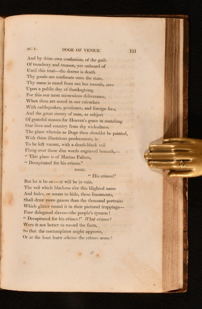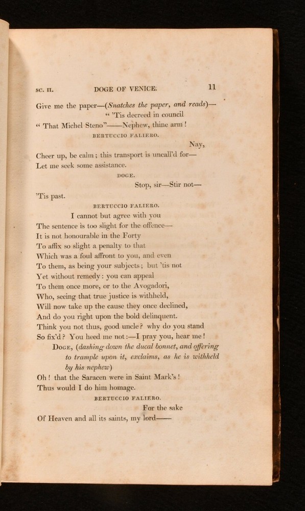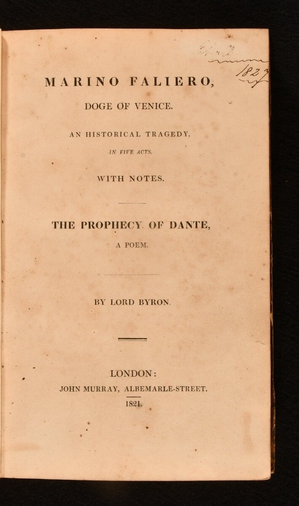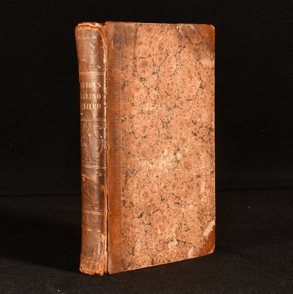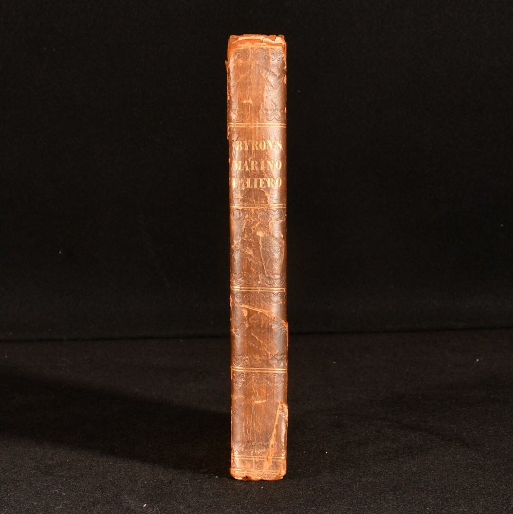 Click here to see our other books! Marino Faliero, Doge of Venice An Historical Tragedy In Five Acts With Notes The Prophecy of Dante, A Poem Lord Byron 1821 John Murray : London 8.5" by 5.5" xxi, 261pp. SUMMARY A first edition, second issue of this play and poem by Lord Byron. First Edition,Leather Binding Overall Condition: Good This book weighs 0.5 KG when packed UK Postage: £ 3.99 US Postage: £ 15.99 EU Postage : £ 13.99 European Postage: £ 14.99 Asia Postage: £ 18.99 Worldwide Postage: £ 19.99 DESCRIPTION The first edition, second issue of this work in a half calf binding, known as Randolph's scarcer Variant A of this issue. With Doge's speech to page 151 forming 11 lines, and page 101 being misnumbered 110 (Randolph, p.73; Wise II.30.). Ink inscription to the title page. 'Marino Faliero, Doge of Venice' is a blank verse tragedy by Byron, inspired when he was looking at portraits of the Doges in Venice in the Palazzo Ducale, and saw that the portrait of Faliero had been blacked out. Byron's play is set in Venice in 1355, with Faliero having been recently elected as Doge of Venice, and follows Faliero through is failed coup d'etat and subsequent execution. Including the poem 'The Prophecy of Dante'. CONDITION In a half calf binding. Externally sound, with bumping to the boards and extremities. Joints are splitting, with the leather of the backstrip lifting to the head and tail of the spine. Internally, firmly bound. Pages are spotted throughout. Overall Condition: Good GLOSSARY OF TERMS Overall Condition (Dustwrapper condition rating is shown after that for the book itself, where a dustwrapper is present) Fine - Very well preserved copy showing very little wear Very Good Indeed - Only one or two minor faults, really a very attractive copy Very Good - Quite a wide term meaning no major faults but probably several smaller ones often expected given the age of the book, but still a respectable copy Good - Meaning not very good. Some more serious faults as will be described in the condition report under 'condition' Good Only - Meaning one or more faults that could really do with repair Fair - As with good only above but with other faults leaving a compromised copy even after repair Poor - Really bad and possibly seriously incomplete. We only sell books in this condition where their rarity or value makes them attractive none the less. Major defects will be described. GUARANTEE We offer a full money back guarantee on our descriptions. Please ask for details and conditions. We prefer PAYPAL. If you pay via PAYPAL we will post the item off the same or the next working day with the postage you have selected. Please note we cannot accept USD cheques