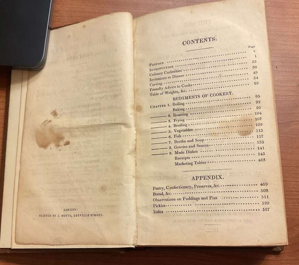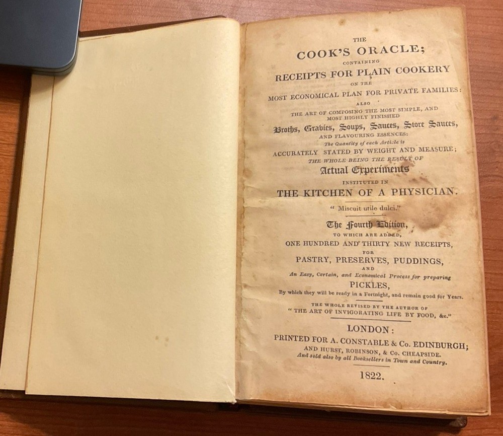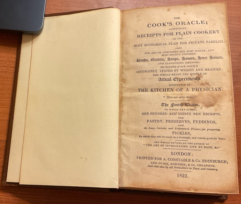 The 1822 edition of "The Cook's Oracle" by William Kitchiner is a valuable addition to any collection of culinary literature. This original leather-bound copy from London features a treasure trove of recipes and insights on the art of composing delicious meals. Published by A. Constable & Co., this 700g book covers a variety of food and drink topics, making it a comprehensive resource for food enthusiasts and collectors alike. The English language text offers a glimpse into the culinary practices of the early 19th century, making it a sought-after item for those passionate about the history of food and art. Very good condition. Rebound. Some foxing. Printed by J. Moyes, Greville St. London