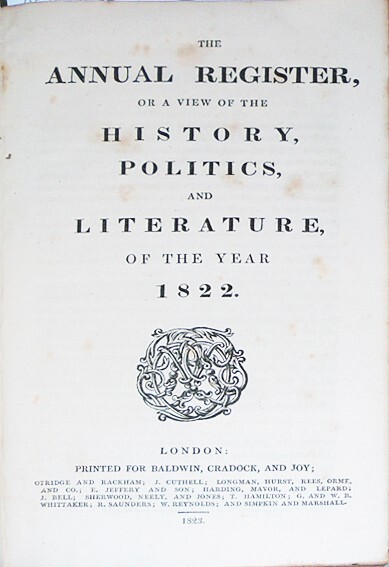 This week, we will be listing a Wonderful Collection of Antiquarian Books and Historical Memorabilia, including numerous Annual Register volumes. Please, check out our other items to save of shipping. Good Luck! This is a Great, Rare, Early "The Annual Register, or A View of The History, Politics, and Literature, For The Year 1822 " book . This wonderful Old piece has a Great, Early design, with a Gold Gilt embossed Leather binding, is Loaded with 500+ pages of Historical information & the News of the day, is an Original, Antique piece and Rare to Find. This includes: America : President James Monroe - State of The Union Address to Congress Relations with South America, Russia & France Treaty of Ghent - Ended War of 1812 Canadian Boundry Settled - Canada Slave Trade Abolished Charleston Slave Revolt - Gullah Jack Executed - South Carolina American Treatment of Drunkards - Alcoholism Jefferson County, Georgia Sinkhole And More! Other : Slave Trade Australia Simon Bolivar China Napoleon Bonaparte Iceland Greenland Arctic Exploration - Captain Franklin Lord Byron Fishing Fossils Freemasons - Masonic Hudson Bay Mermaids Murder of Infant Sea Serpent Vaccinations And More! This appears to be in Nice, Tight condition. #5881 - 3.5 Payment is expected within 7 days of purchase. Thanks