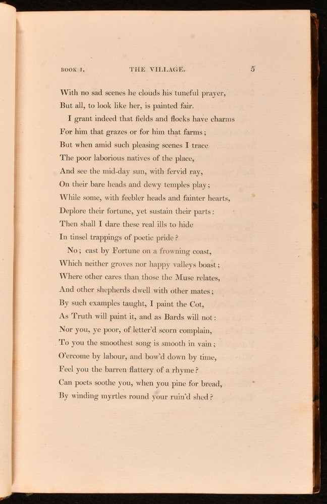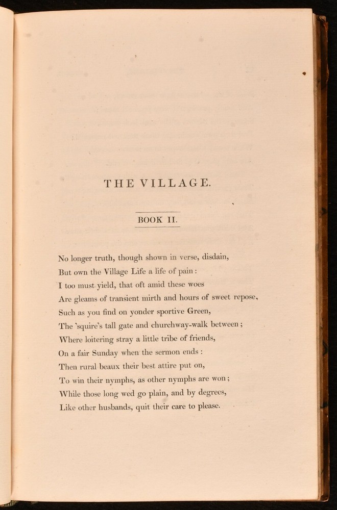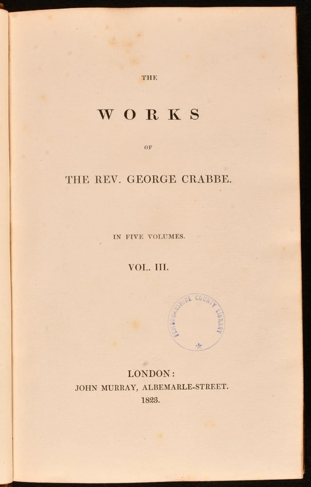 Click here to see our other books! The Works of The Reverend George Crabbe Reverend George Crabbe 1823 John Murray : London 8.5" by 5.5" xxxi, 286; xxxviii, 395; xxiv, 446; viii, 342; viii, 353pp. SUMMARY A complete set of five volumes of the works of Reverend George Crabbe. Leather Binding Overall Condition: Very Good Indeed This book weighs 3 KG when packed UK Postage: £ 3.99 US Postage: £ 36.99 EU Postage : £ 25.99 European Postage: £ 27.99 Asia Postage: £ 47.99 Worldwide Postage: £ 69.99 DESCRIPTION Five volumes. The works of Reverend George Crabbe, an English poet, surgeon and clergyman. He is best known for his early use of the realistic narrative form and his descriptions of middle and working-class life and people. Volume one contains chapters on: The Village, The Parish Register, The Library, The Newspaper, and many more. Volume two contains chapters on: The Church, Elections, Amusements, Players, The Poor, and many more. Volume three contains chapters on: The Gentleman Farmer, The Patron, The Mother, Arabella, and many more. Volume four contains chapters on: The Hall, Boys at School, The Adventures of Richard, The Preceptor Husband, and many more. Volume five contains chapters on: The Natural Death of Love, Gretna Green, The Widow, William Bailey, and many more. Bound by R. Brassington, York. CONDITION Bound in half calf with marbled boards, edges and endpapers. Externally, very smart with light shelf wear and minor bumping to the extremities. Volumes two joints starting but firm. Internally, firmly bound. Pages are very bright and clean with the odd handling mark. Fairly unobtrusive library stamps to front endpapers no other library markings. Bound by R. Brassington, York. Overall Condition: Very Good Indeed GLOSSARY OF TERMS Overall Condition (Dustwrapper condition rating is shown after that for the book itself, where a dustwrapper is present) Fine - Very well preserved copy showing very little wear Very Good Indeed - Only one or two minor faults, really a very attractive copy Very Good - Quite a wide term meaning no major faults but probably several smaller ones often expected given the age of the book, but still a respectable copy Good - Meaning not very good. Some more serious faults as will be described in the condition report under 'condition' Good Only - Meaning one or more faults that could really do with repair Fair - As with good only above but with other faults leaving a compromised copy even after repair Poor - Really bad and possibly seriously incomplete. We only sell books in this condition where their rarity or value makes them attractive none the less. Major defects will be described. GUARANTEE We offer a full money back guarantee on our descriptions. Please ask for details and conditions. We prefer PAYPAL. If you pay via PAYPAL we will post the item off the same or the next working day with the postage you have selected. Please note we cannot accept USD cheques