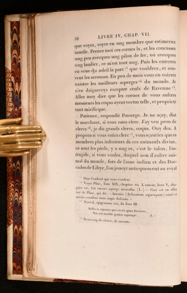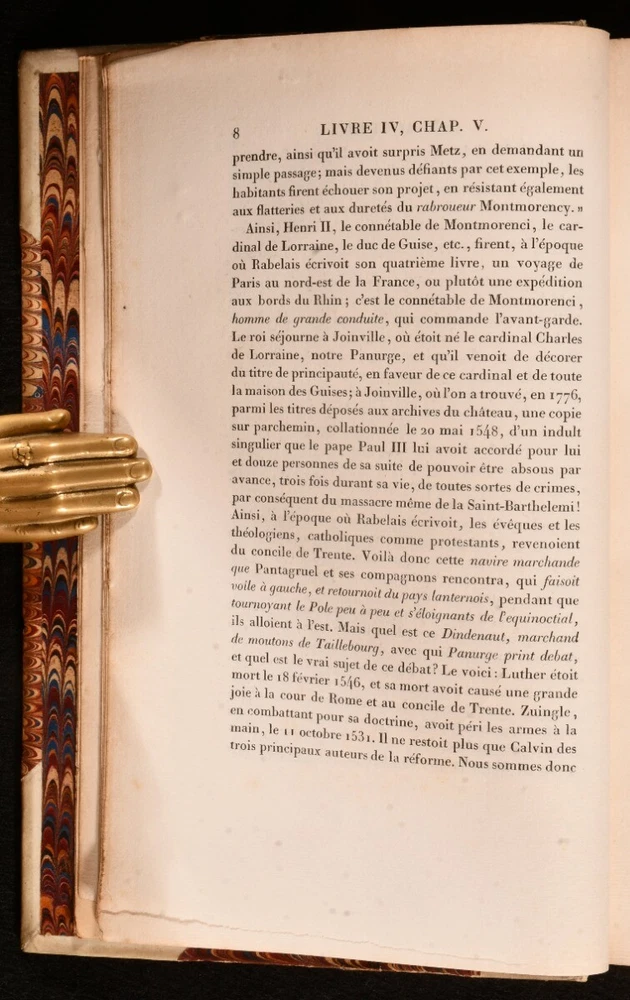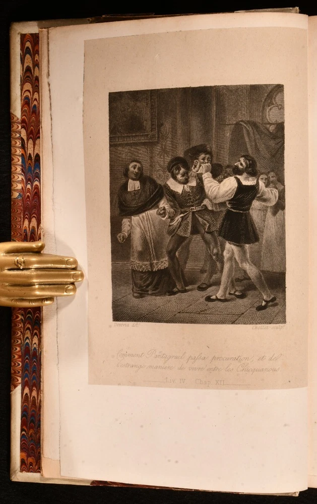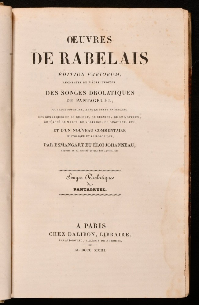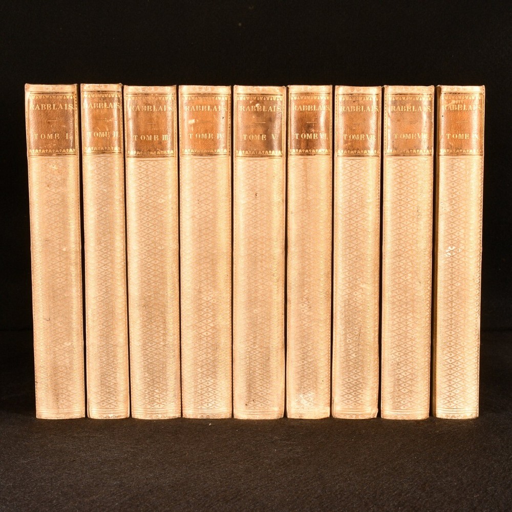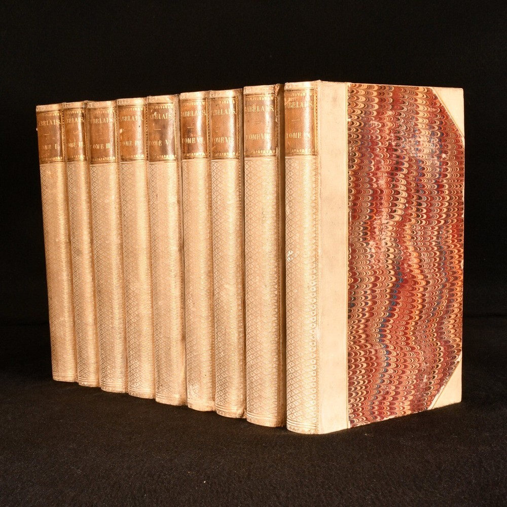 Click here to see our other books! Oeuvres De Rabelais Variorum Edition Rabelais 1823 Chez Dalibon : Paris 8.5" by 5.5" - SUMMARY A nine volume set of works by French writer Francois Rabelais, bound in half vellum. Folding Maps,Folding Plates,Illustrated,Leather Binding Overall Condition: Very Good This book weighs 8 KG when packed UK Postage: £ 4.49 US Postage: £ 57.99 EU Postage : £ 33.99 European Postage: £ 59.99 Asia Postage: £ 99.99 Worldwide Postage: £ 199.99 DESCRIPTION Complete in nine volumes. Bound in half vellum with marbled paper to the boards. The Variorum edition. With frontispieces to tomes 'I', 'III', 'VII', 'Vi', 'IV', 'III', 'II', 120 plates to 'Tome IX', illuminated letters and a folding map to 'Tome I'. Collated complete. This set features a collection of works by French Renaissance writer, physician and monk, Francois Rabelais. Rabelais is best known for his satirical work and songs. CONDITION Bound in half vellum with paper to the boards. Externally generally smart with slight rubbing to the boards and marks to the vellum, heaviest to 'Tome V' with a small closed tear to the tail of 'Tome II'. Front hinges starting to tomes 'I', 'III', VII', 'V' and 'III'. Internally firmly bound with the tidemarks and occasional spotting, pencil annotations and age toning. Tidemarks heaviest to the corners to 'Tome IX'. Overall Condition: Very Good GLOSSARY OF TERMS Overall Condition (Dustwrapper condition rating is shown after that for the book itself, where a dustwrapper is present) Fine - Very well preserved copy showing very little wear Very Good Indeed - Only one or two minor faults, really a very attractive copy Very Good - Quite a wide term meaning no major faults but probably several smaller ones often expected given the age of the book, but still a respectable copy Good - Meaning not very good. Some more serious faults as will be described in the condition report under 'condition' Good Only - Meaning one or more faults that could really do with repair Fair - As with good only above but with other faults leaving a compromised copy even after repair Poor - Really bad and possibly seriously incomplete. We only sell books in this condition where their rarity or value makes them attractive none the less. Major defects will be described. GUARANTEE We offer a full money back guarantee on our descriptions. Please ask for details and conditions. We prefer PAYPAL. If you pay via PAYPAL we will post the item off the same or the next working day with the postage you have selected. Please note we cannot accept USD cheques