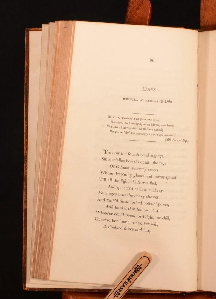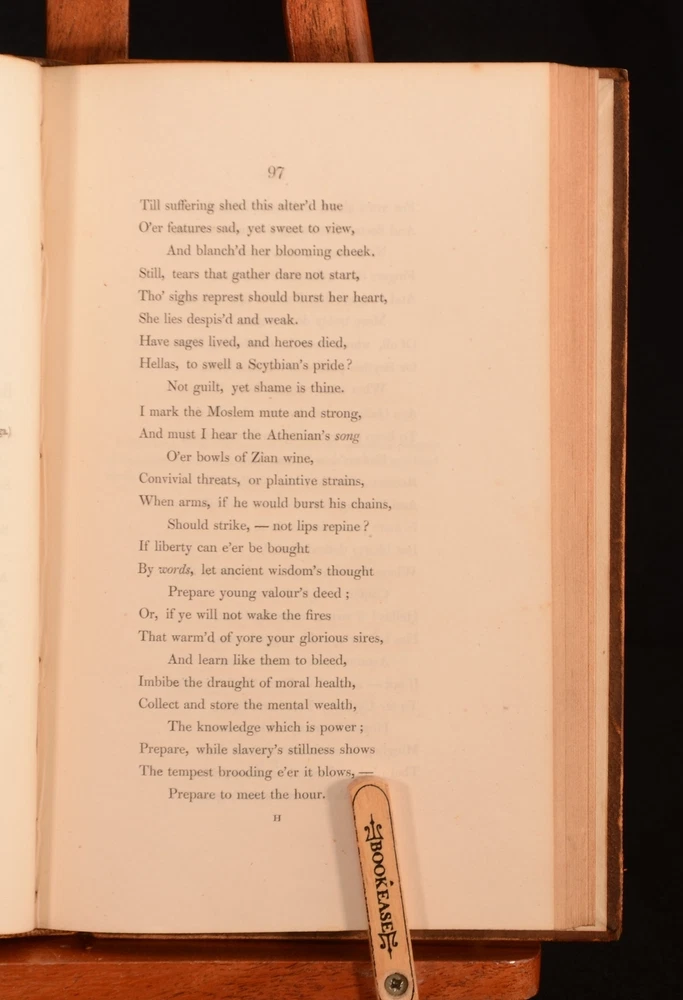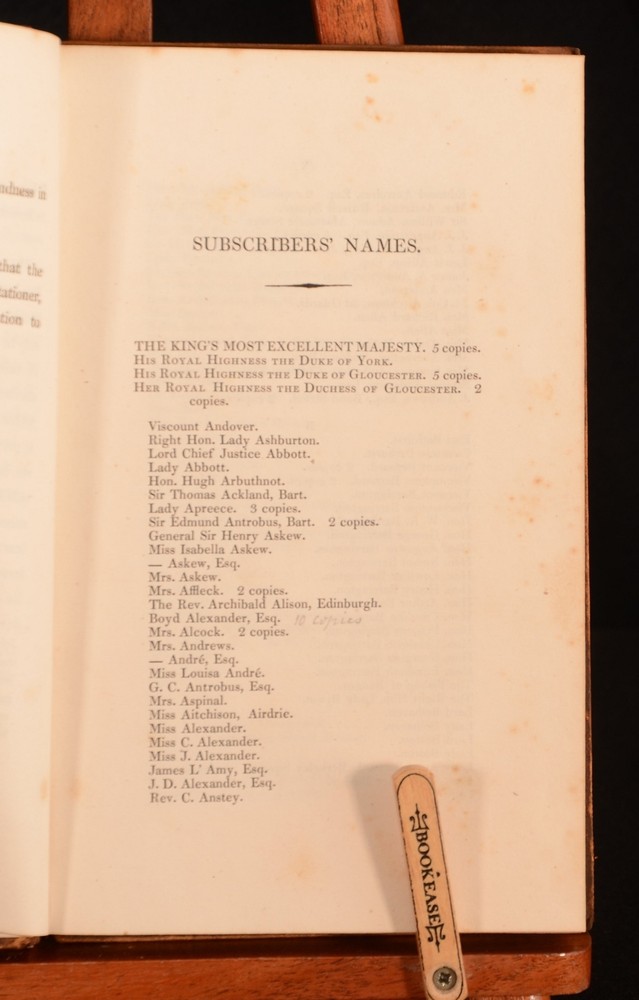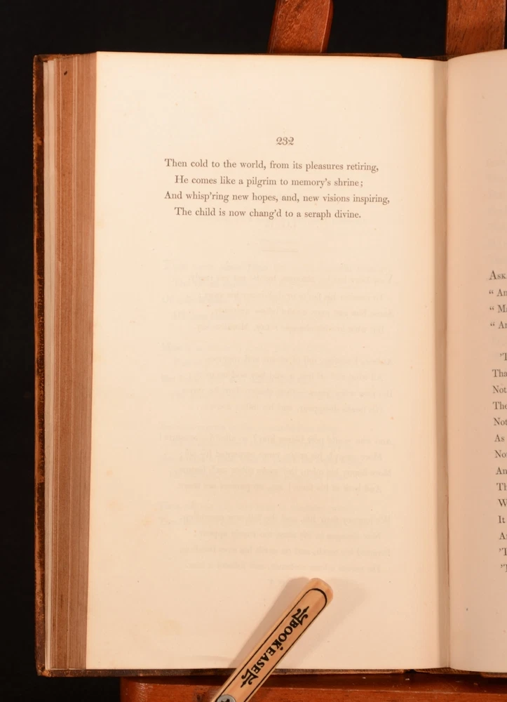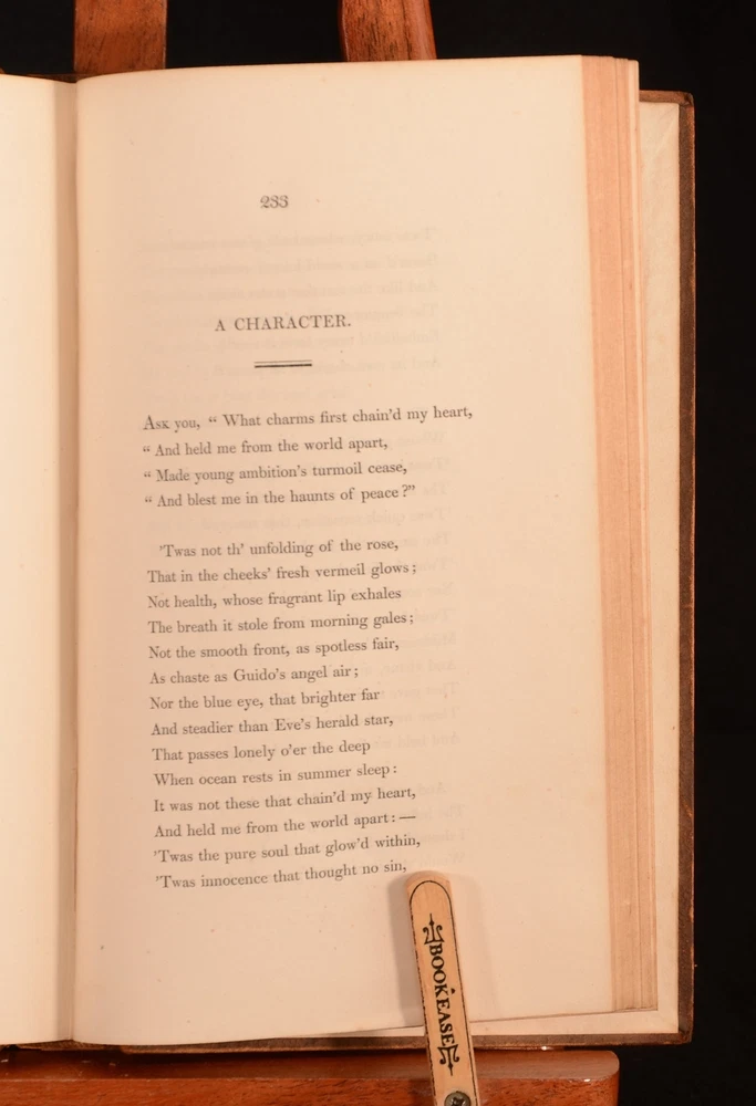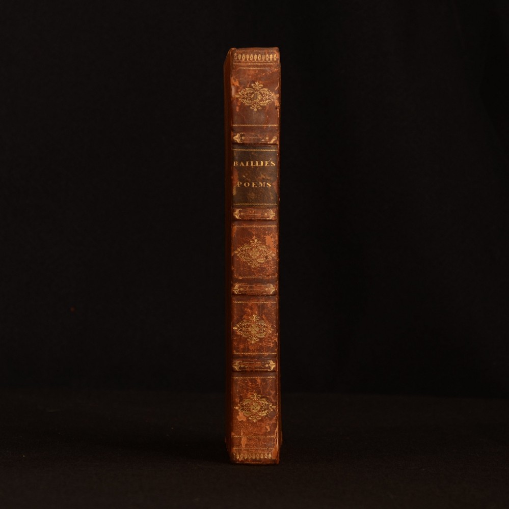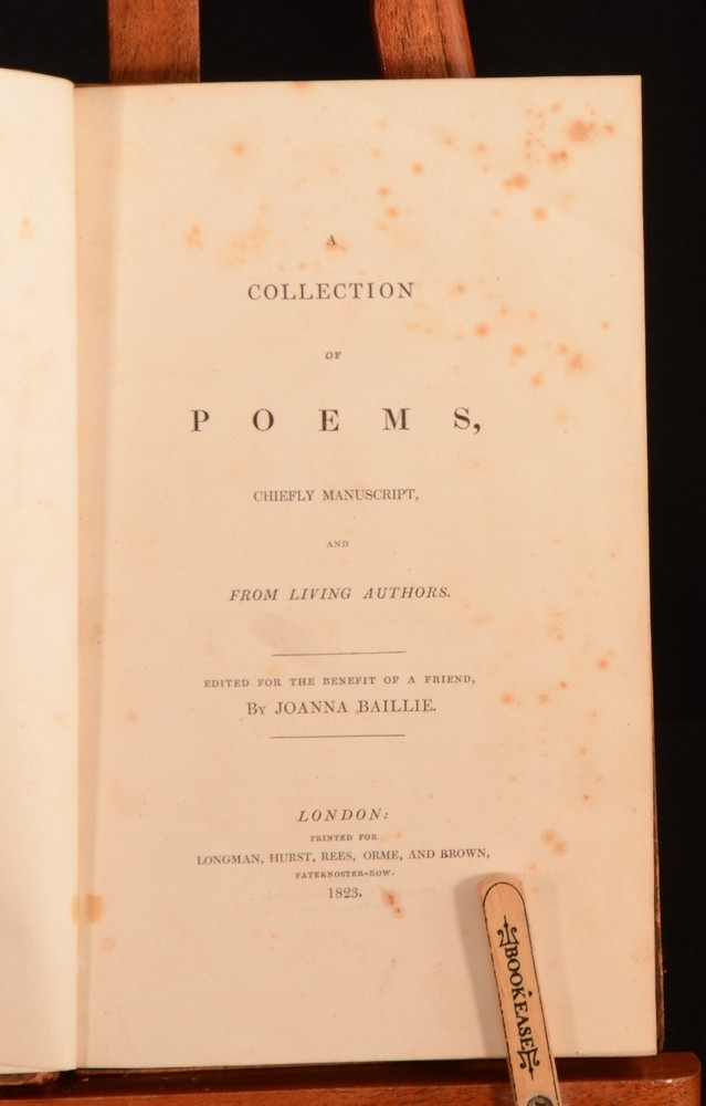 Click here to see our other books! A Collection of Poems, Chiefly Manuscript, and From Living Authors Joanna Baillie 1823 Longman, Hurst, Rees, Orme, and Brown : London 9" by 5.5" xlv, 325pp SUMMARY A leather bound edition of 'A Collection of Poems' edited by Joanna Baillie Leather Binding Overall Condition: Very Good This book weighs 0.75 KG when packed UK Postage: £ 3.99 US Postage: £ 19.99 EU Postage : £ 15.99 European Postage: £ 16.99 Asia Postage: £ 21.99 Worldwide Postage: £ 25.99 DESCRIPTION A collection of the poetry from poets of the nineteenth century. The work is prefaced by a list of subscribers' names, including His Royal Highness the Duke of York. The poem featured include: 'Mac Duff's Cross' by Sir Walter Scott 'Hope and Memory' by The Rev. G Crabb 'To a Friend on his Wedding-day' by Sir William Pepys 'The Ship's Return' by Miss Benger 'A Simile- I saw the wild rose' - Mrs J Hunter Amongst many others. Previous owners bookplate to the front pastedown reads, 'Rev. W. W. Holland' Joanna Baillie, was a Scottish poet and dramatist, born in 1762. CONDITION In full calf binding with gilt detailing. Externally smart. Rubbing to the head and tail of the spine. Spine is lifting slightly, to the head due to rubbing. Crack to the front joint, to the tail. Small crack to the rear joint, to the head. Front hinge is slightly strained by firm. Previous owners bookplate to the front pastedown. Slight offsetting to the front and rear pastedown. Offsetting to the front endpaper, due to the bookplate. Internally, firmly bound. Pages are generally clean, with some slight agetoning to the edges of some pages, and the off spot throughout. Overall Condition: Very Good GLOSSARY OF TERMS Overall Condition (Dustwrapper condition rating is shown after that for the book itself, where a dustwrapper is present) Fine - Very well preserved copy showing very little wear Very Good Indeed - Only one or two minor faults, really a very attractive copy Very Good - Quite a wide term meaning no major faults but probably several smaller ones often expected given the age of the book, but still a respectable copy Good - Meaning not very good. Some more serious faults as will be described in the condition report under 'condition' Good Only - Meaning one or more faults that could really do with repair Fair - As with good only above but with other faults leaving a compromised copy even after repair Poor - Really bad and possibly seriously incomplete. We only sell books in this condition where their rarity or value makes them attractive none the less. Major defects will be described. GUARANTEE We offer a full money back guarantee on our descriptions. Please ask for details and conditions. We prefer PAYPAL. If you pay via PAYPAL we will post the item off the same or the next working day with the postage you have selected. Please note we cannot accept USD cheques