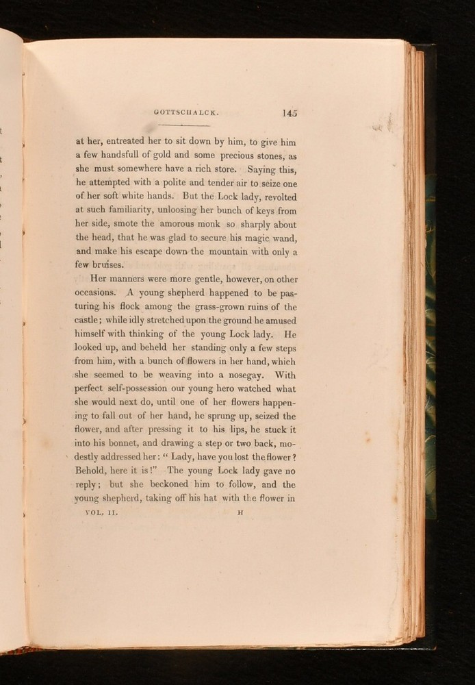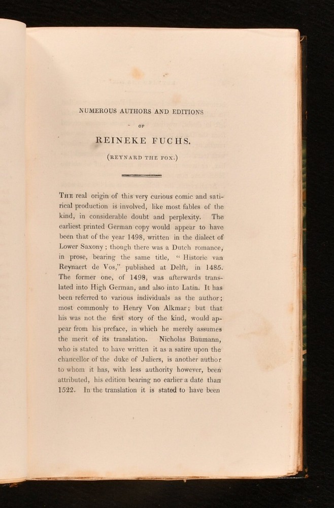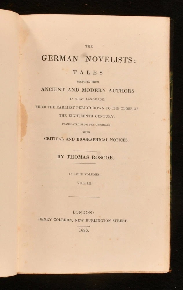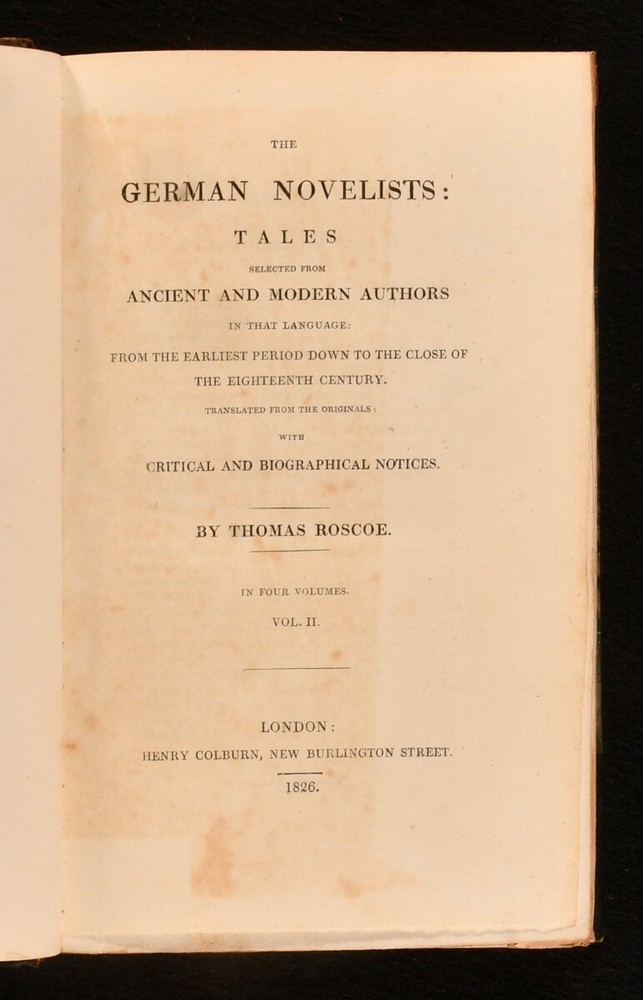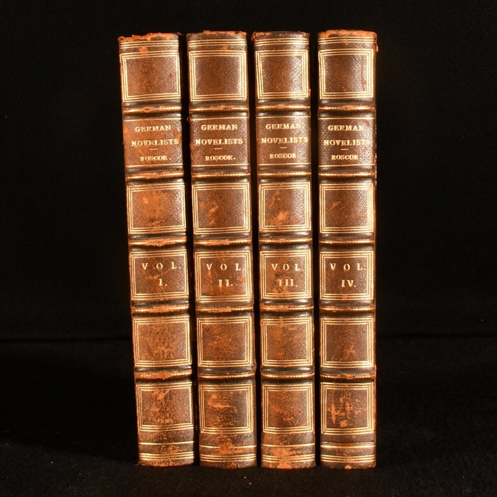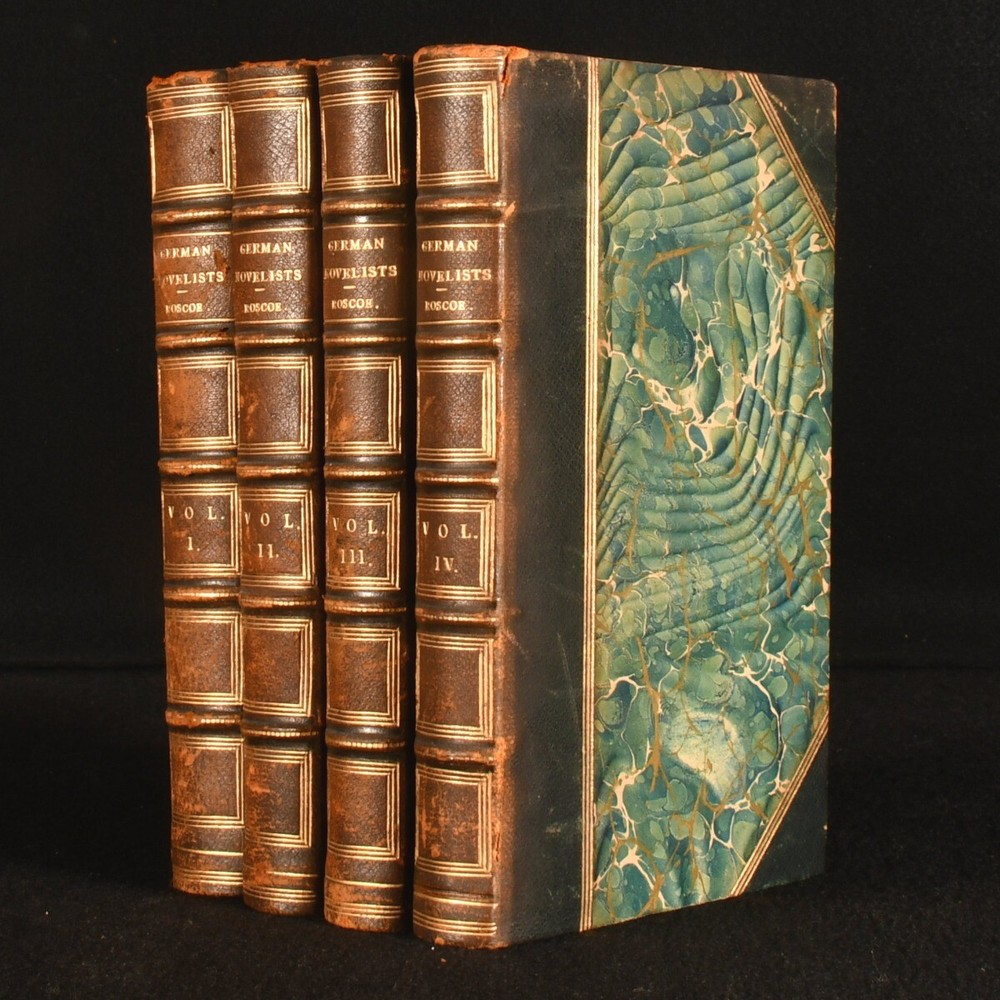 Click here to see our other books! The German Novelists: Tales Selected from Ancient and Modern Authors in that Language: From the Earliest Period Down to the Close of the Eighteenth Century. Translated from the Originals: with Critical and Biographical Notices Thomas Roscoe [ed., trans] 1826 Henry Colburn : London 8" by 5" xx, 413pp; vi, 405pp; 374pp; 374pp SUMMARY A collection of Germany's popular prose fictions compiled, translated and introduced by Thomas Roscoe First Edition,Leather Binding,Signed Binding Overall Condition: Very Good This book weighs 3 KG when packed UK Postage: £ 3.99 US Postage: £ 36.99 EU Postage : £ 25.99 European Postage: £ 27.99 Asia Postage: £ 47.99 Worldwide Postage: £ 69.99 DESCRIPTION A four volume collection of Germany's popular prose fictions compiled and translated by Thomas Roscoe. A first edition of this translation, with signed bindings on three volumes. Roscoe introduces each piece with biographical and critical notes, before providing translations of well known novels such as Reynard the Fox and Doctor Faustus. The collection also holds writings by other popular German authors such as the Grimm brothers, Friedrich Schiller, and Georg Engel. Binder's sticker to the front pastedown of volume I, II and III. Bound by Galway & Co., Eustace Street, Dublin. Prior owner's bookplate to front pastedown. 'Oliver Brett'. CONDITION In half calf binding over green marbled boards. Externally, generally smart. Lightly rubbed to the boards, with a little scuffing of the leather at the spine. A little bumped to the head of each volume causing some light wear to the leather. Front hinge of volume I starting. Internally, firmly bound. Pages bright with the odd spot throughout, except for volume IV, which is a little more foxed than the others. Overall Condition: Very Good GLOSSARY OF TERMS Overall Condition (Dustwrapper condition rating is shown after that for the book itself, where a dustwrapper is present) Fine - Very well preserved copy showing very little wear Very Good Indeed - Only one or two minor faults, really a very attractive copy Very Good - Quite a wide term meaning no major faults but probably several smaller ones often expected given the age of the book, but still a respectable copy Good - Meaning not very good. Some more serious faults as will be described in the condition report under 'condition' Good Only - Meaning one or more faults that could really do with repair Fair - As with good only above but with other faults leaving a compromised copy even after repair Poor - Really bad and possibly seriously incomplete. We only sell books in this condition where their rarity or value makes them attractive none the less. Major defects will be described. GUARANTEE We offer a full money back guarantee on our descriptions. Please ask for details and conditions. We prefer PAYPAL. If you pay via PAYPAL we will post the item off the same or the next working day with the postage you have selected. Please note we cannot accept USD cheques