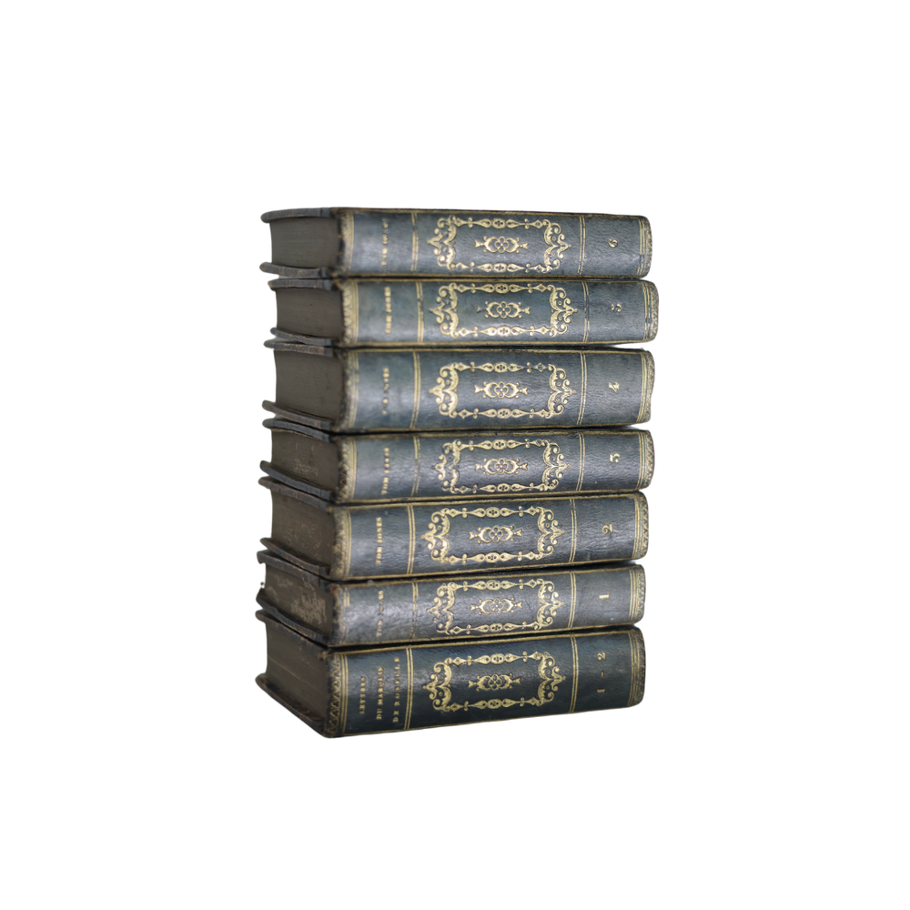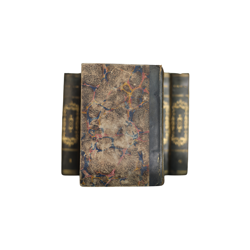 The 1828 French Marbled Leather Bound Antique Books (Set of 7) are a stunning collection that exemplifies the exquisite craftsmanship and literary heritage of early 19th-century France. Each volume is encased in luxurious marbled leather, adorned with intricate gilt detailing and elegantly embossed spines, showcasing the meticulous artistry of the era. The pages, often featuring marbled edges and fine paper, encapsulate the rich cultural and intellectual milieu of 1828 France. This remarkable set of seven books not only stands as a testament to the timeless beauty and sophistication of antique French bookbinding but also brings an air of historical grandeur and intellectual depth to any library or home decor.