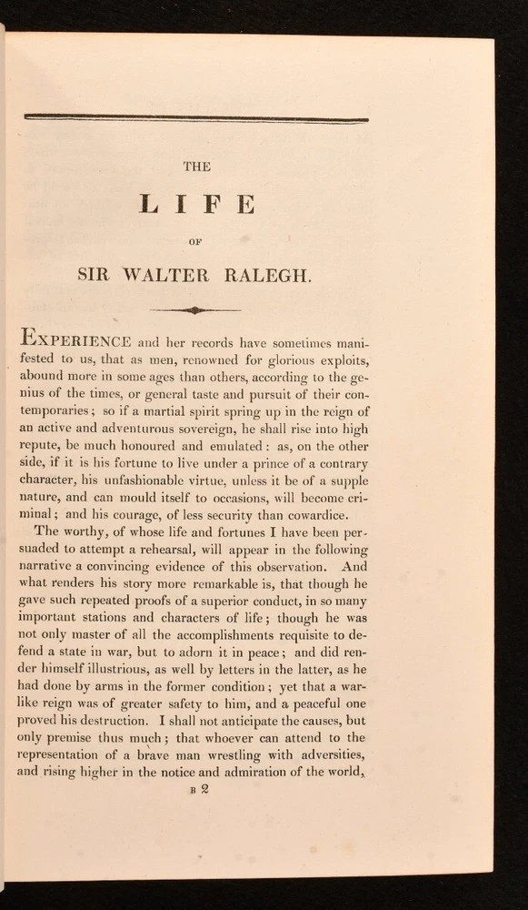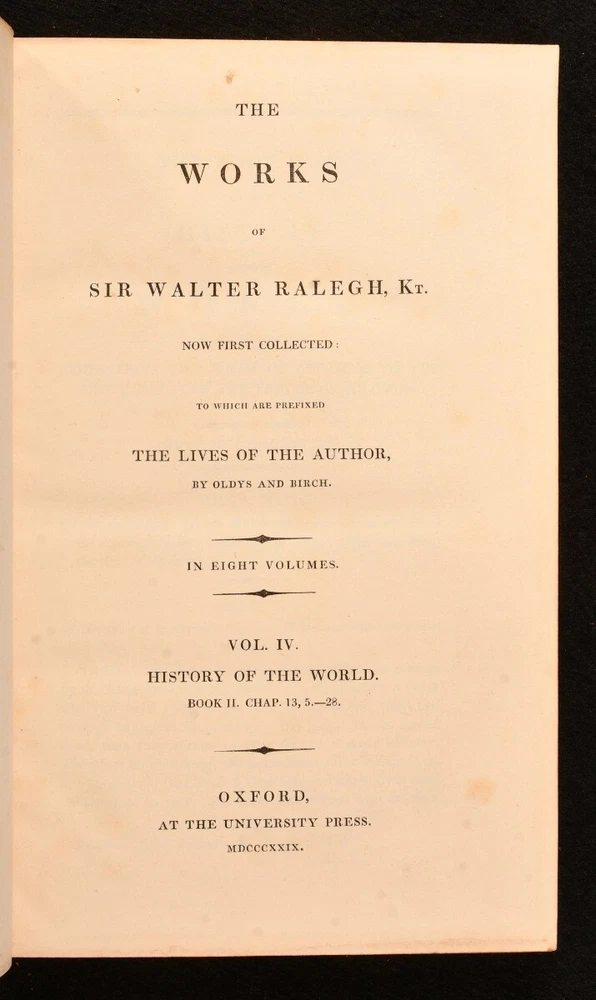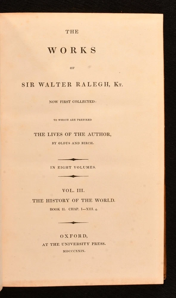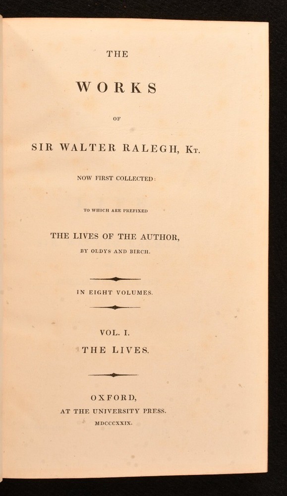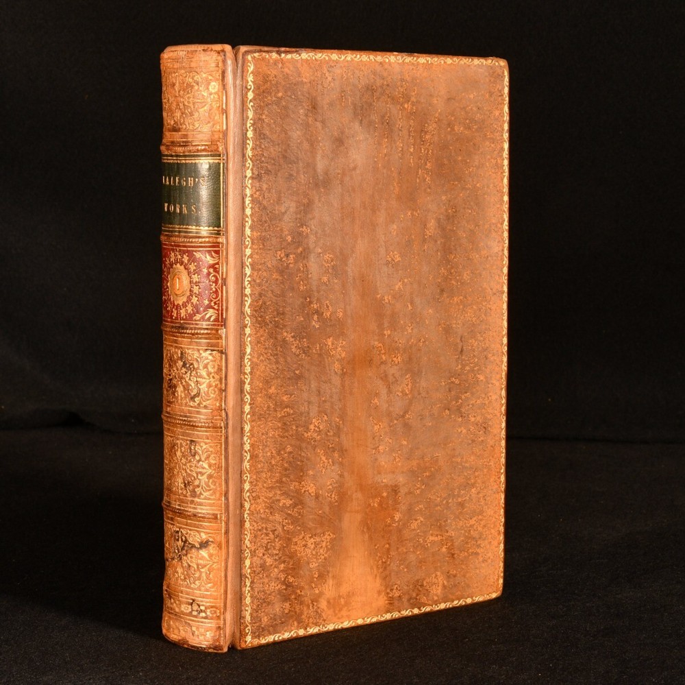 Click here to see our other books! The Works of Sir Walter Ralegh Sir Walter Raleigh 1829 The University Press : Oxford 8.5" by 5.5" SUMMARY A scarce, first edition of this collection of the works of Sir Walter Raleigh, uniformly bound in full calf. First Edition,Leather Binding,Scarce Overall Condition: Good This book weighs 8 KG when packed UK Postage: £ 4.49 US Postage: £ 57.99 EU Postage : £ 33.99 European Postage: £ 53.99 Asia Postage: £ 99.99 Worldwide Postage: £ 199.99 DESCRIPTION First edition of this collection of the works of Sir Walter Raleigh. Uniformly bound in full tree calf with gilt detailing. Complete in eight volumes. The works of English statesman, soldier, writer and explorer, Sir Walter Raleigh, including his important work 'The History of the World'. This particular book was written during Raleigh's imprisonment in the Tower of London, with its contents covering the creation of the world up until to 146 BC, intending to show history as a moral lesson. 'The History of the World' was first published in 1614. This collection is comprised of the following: Volume I: The Lives Volume II: The History of the World. Book I. Volume III: The History of the World. Book II, Chap I-XIII. 4. Volume IV: History of the World. Book II, Chap. 13, 5-28. Volume V: The History of the World. Books III. IV. Volume VI: The History of the World. Book V, Chap. I-3. Volume VII: The History of the World. Book V. Chap. 4-6. Volume VIII: Miscellaneous Works. CONDITION Bound in full half calf. Externally, generally smart, with rubbing to the extremities. Joints are cracked to most volumes, with hinges strained, with the front board tenderly held to volumes III, IV and V. Boards to volumes I and VIII have been rebacked with the spine laid down. Internally, firmly bound. Pages bright and clean, with the odd spot. Overall Condition: Good GLOSSARY OF TERMS Overall Condition (Dustwrapper condition rating is shown after that for the book itself, where a dustwrapper is present) Fine - Very well preserved copy showing very little wear Very Good Indeed - Only one or two minor faults, really a very attractive copy Very Good - Quite a wide term meaning no major faults but probably several smaller ones often expected given the age of the book, but still a respectable copy Good - Meaning not very good. Some more serious faults as will be described in the condition report under 'condition' Good Only - Meaning one or more faults that could really do with repair Fair - As with good only above but with other faults leaving a compromised copy even after repair Poor - Really bad and possibly seriously incomplete. We only sell books in this condition where their rarity or value makes them attractive none the less. Major defects will be described. GUARANTEE We offer a full money back guarantee on our descriptions. Please ask for details and conditions. We prefer PAYPAL. If you pay via PAYPAL we will post the item off the same or the next working day with the postage you have selected. Please note we cannot accept USD cheques